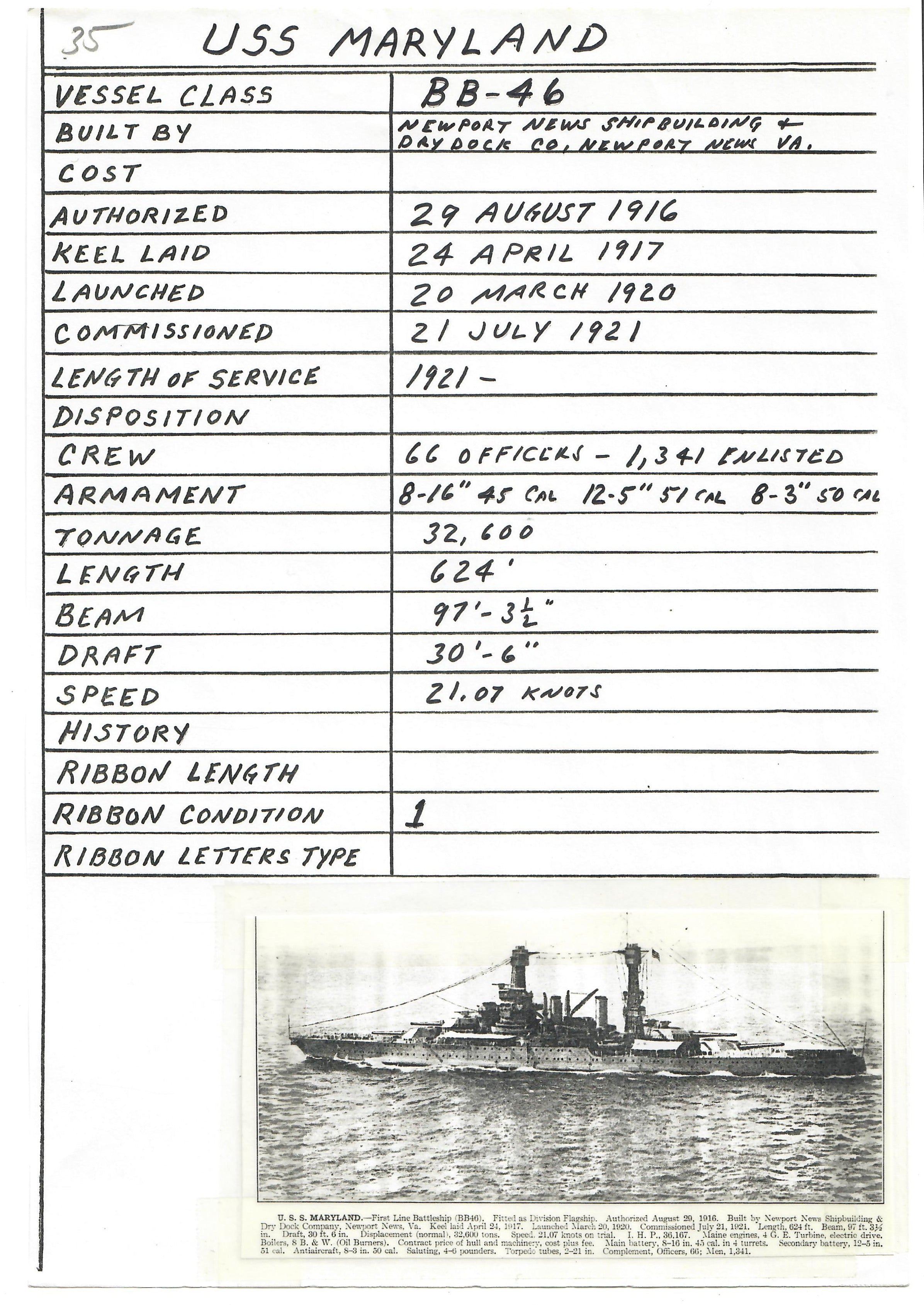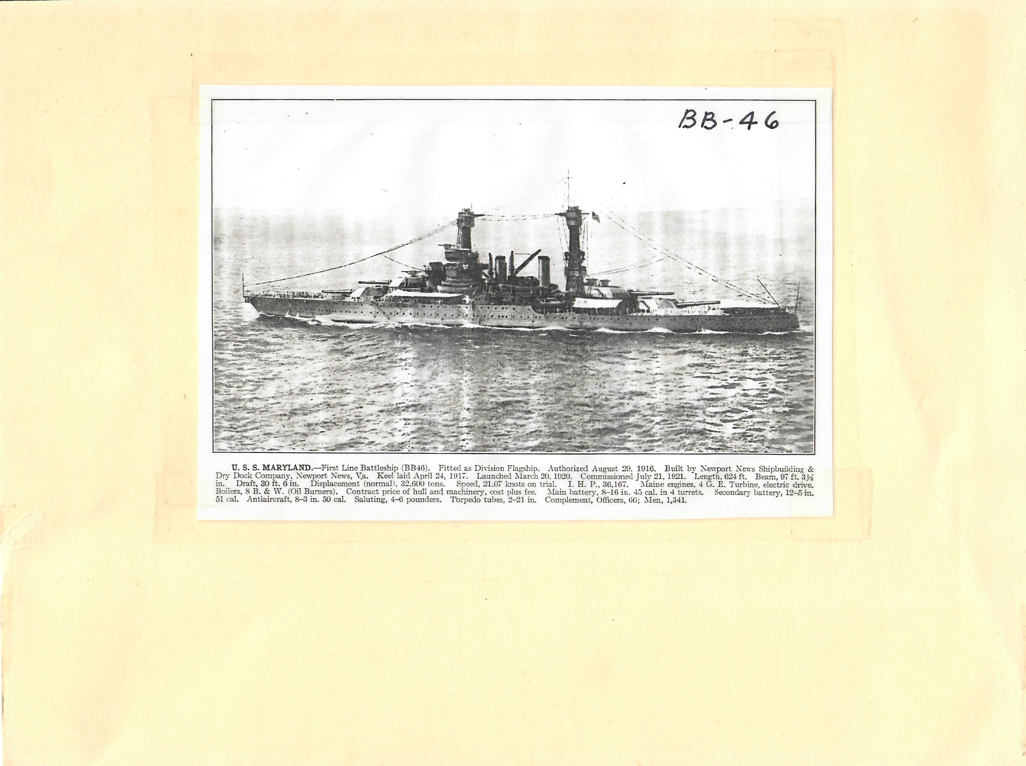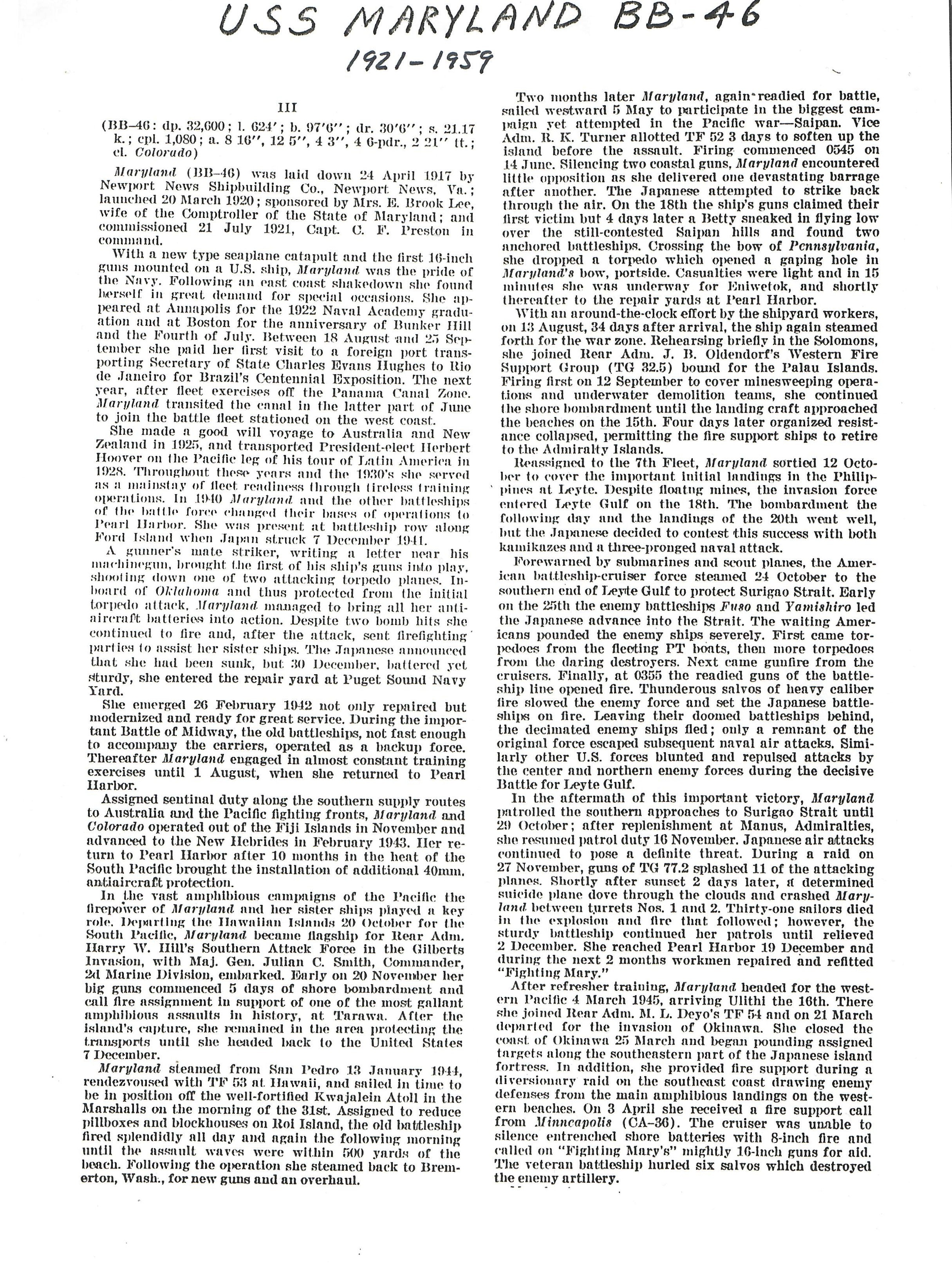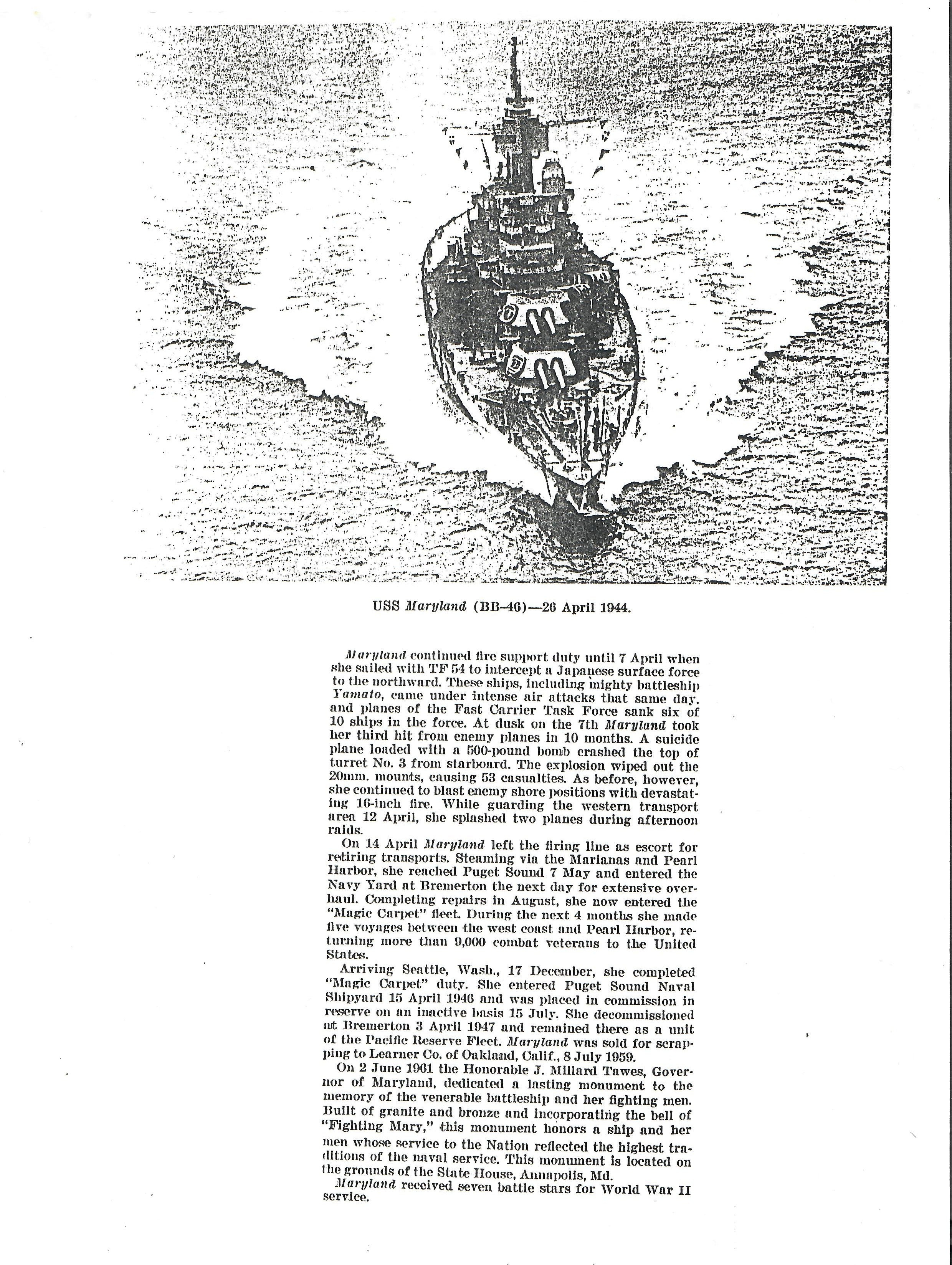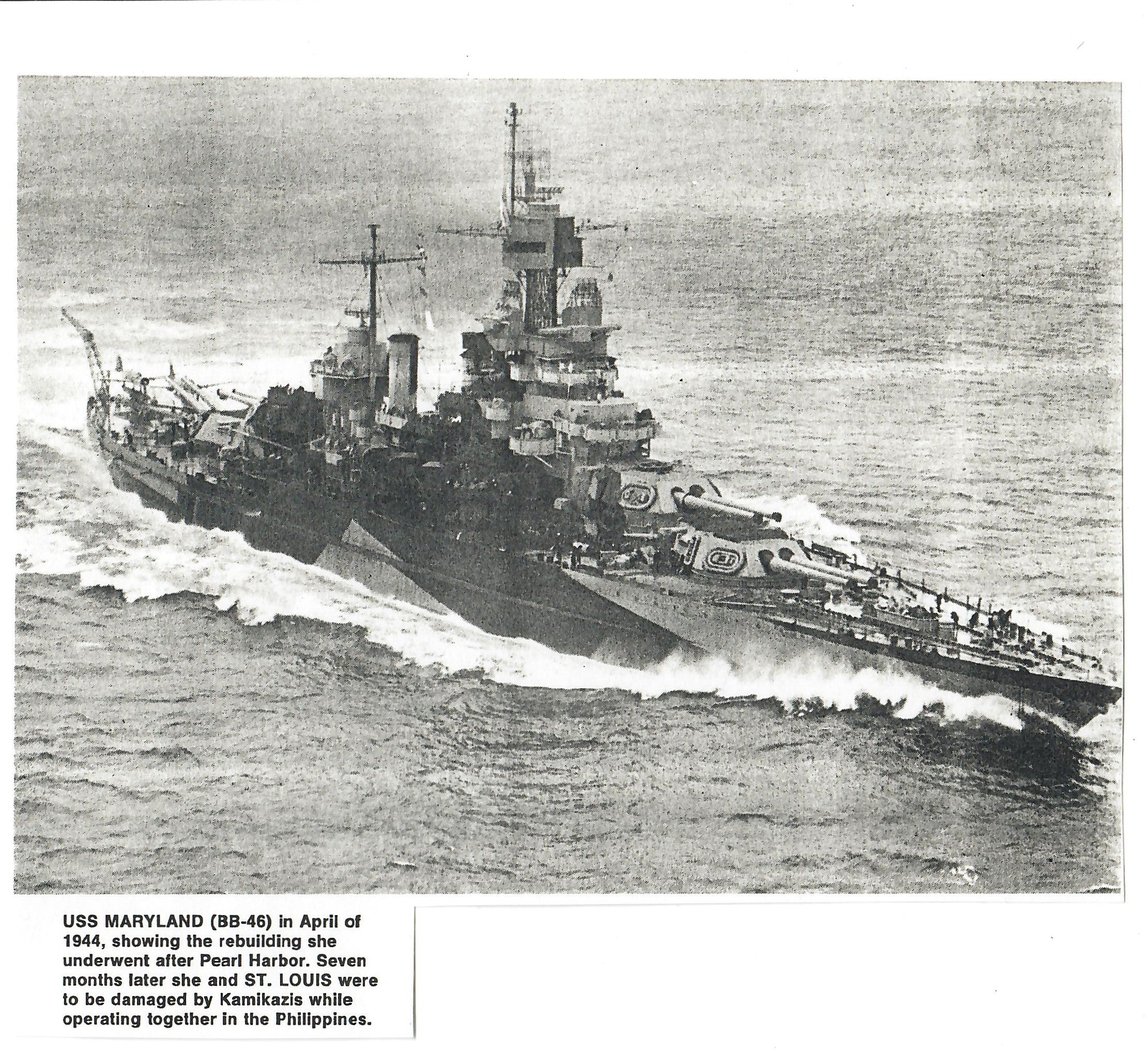 - USS Maryland - During World War II, she was on Battleship Row during the Attack on Pearl Harbor, and was lightly damaged by Japanese bombs. Returning to duty in 1942, she saw service in the Pacific War, first supporting the rest of the fleet at the Battle of Midway, and then patrolling the Fiji Islands to guard against Japanese incursion. Next, she went on the offensive, commencing shore bombardments in the Battle of Tarawa and later in the Battle of Kwajalein. During the Battle of Saipan she took torpedo damage to her bow, necessitating repairs and refits. She then participated in the Battle of Leyte Gulf where she was hit by a kamikaze. She took another kamikaze hit at the Battle of Okinawa, then completed repairs and upgrades at Bremerton, WA. She was sailing back to the Pacific Theater when word was received that the war had ended, so she turned around and returned to the Port of Long Beach, CA.