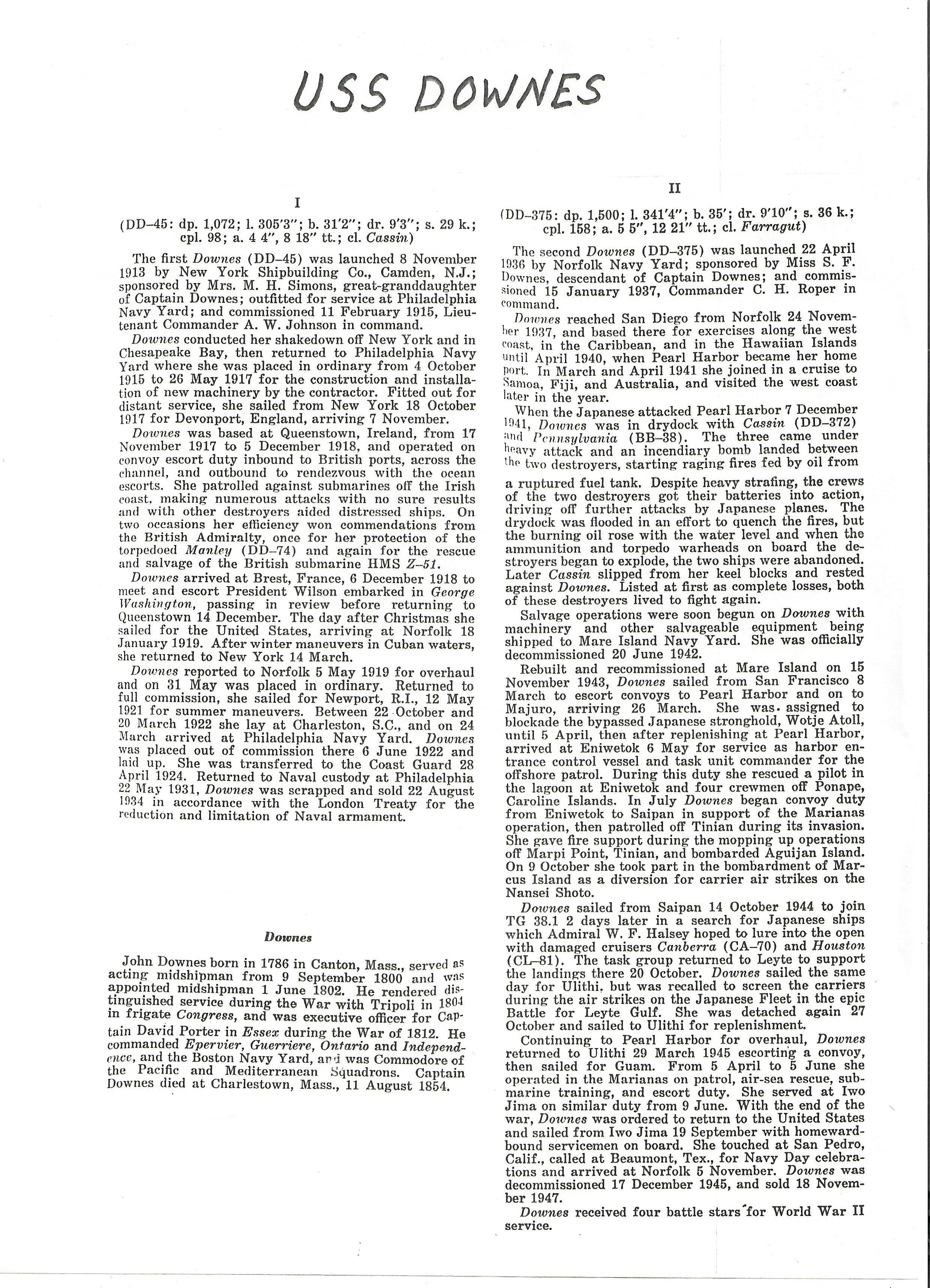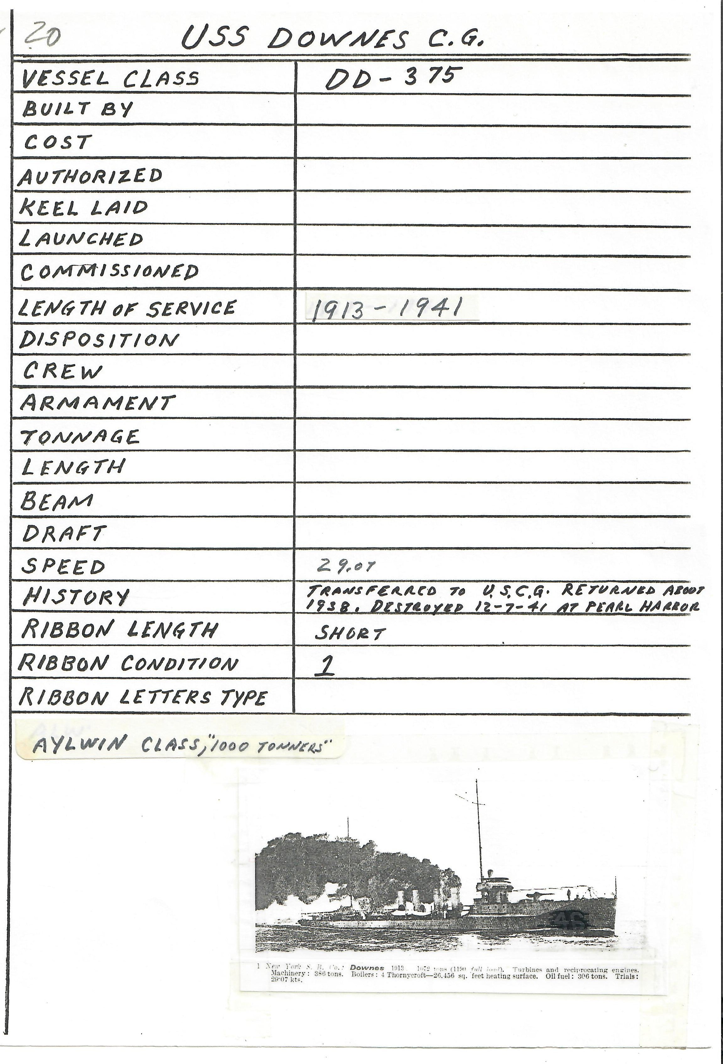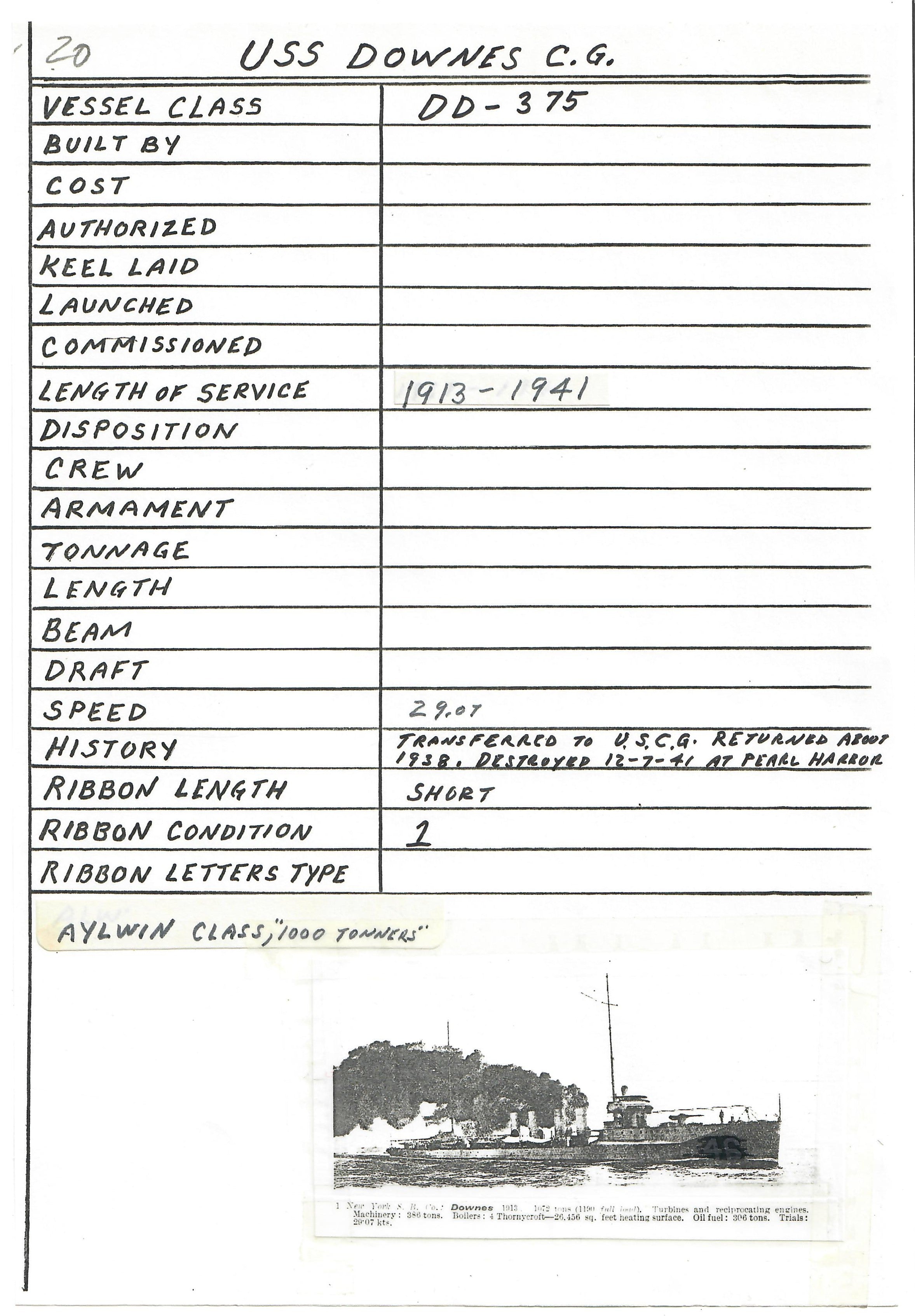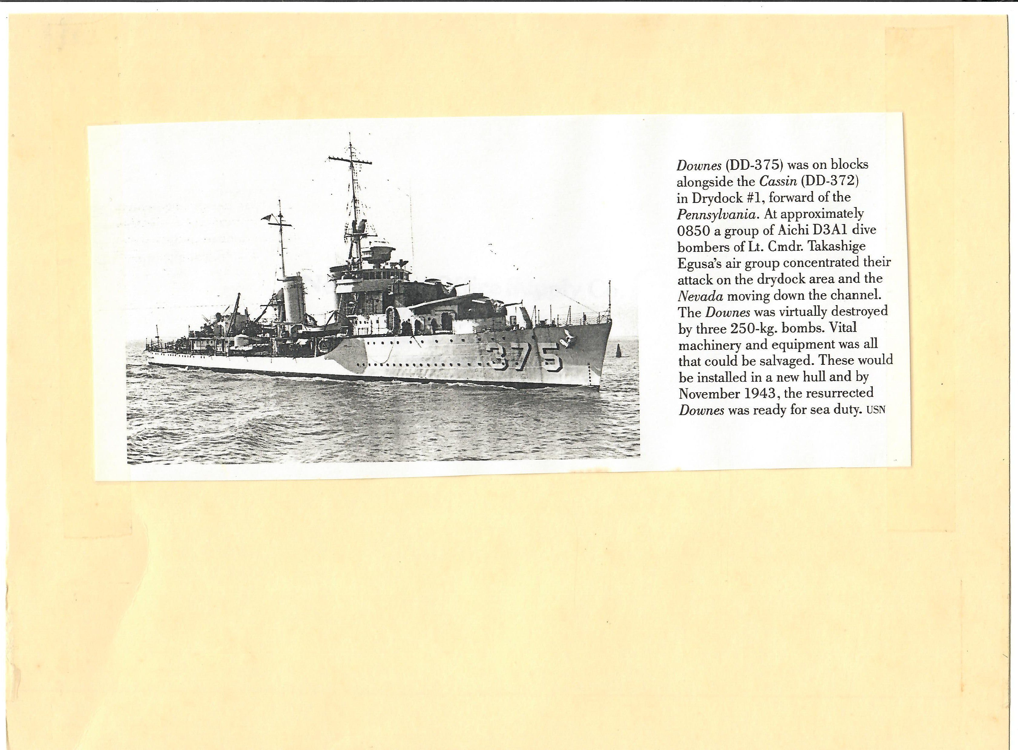 - USS Downes, C.G. - On the morning of December 7, 1941, Downes was in dry dock along with the battleship USS Pennsylvania (BB-38) and destroyer USS Cassin (DD-372). Though neither Downes nor Cassin were high on the list of Japanese attack priorities, Pennsylvania was among the battleships that the aerial fleet aimed to destroy. As the attack began, it was clear that the dry dock was a trap for the three vessels, especially when an incendiary bomb struck between the two destroyers. Fires raged between Cassin and Downes, made worse by a nearby fuel tank that had ruptured and started leaking oil. Japanese fighters strafed the dry dock, pelting the three warships with machine gun fire. As bullets rained from above, the crew of Downes sprang into action, some fighting the fires that threatened the overtake the ship and others manning the destroyer's guns. With Japan’s planes repelled from attacking the dry dock, crews and dock workers were able to fully address the fires. Unfortunately, by then it was too late. An attempt to drown the growing fire was thwarted when the burning oil rose with the water level, spreading the fire even more. Eventually, it was large enough to reach the ammo and torpedo warheads aboard the trapped destroyers. The explosions were devastating, forcing both crews to abandon their ships. Nearly six months after the attack on Pearl Harbor, USS Downes was decommissioned. Her hull was deemed damaged beyond repair, but some of her machinery and equipment that weren’t damaged during the attack were salvaged and shipped to Mare Island Navy Yard, where a new ship incorporating parts from the original Downes was built and given her name and hull number.