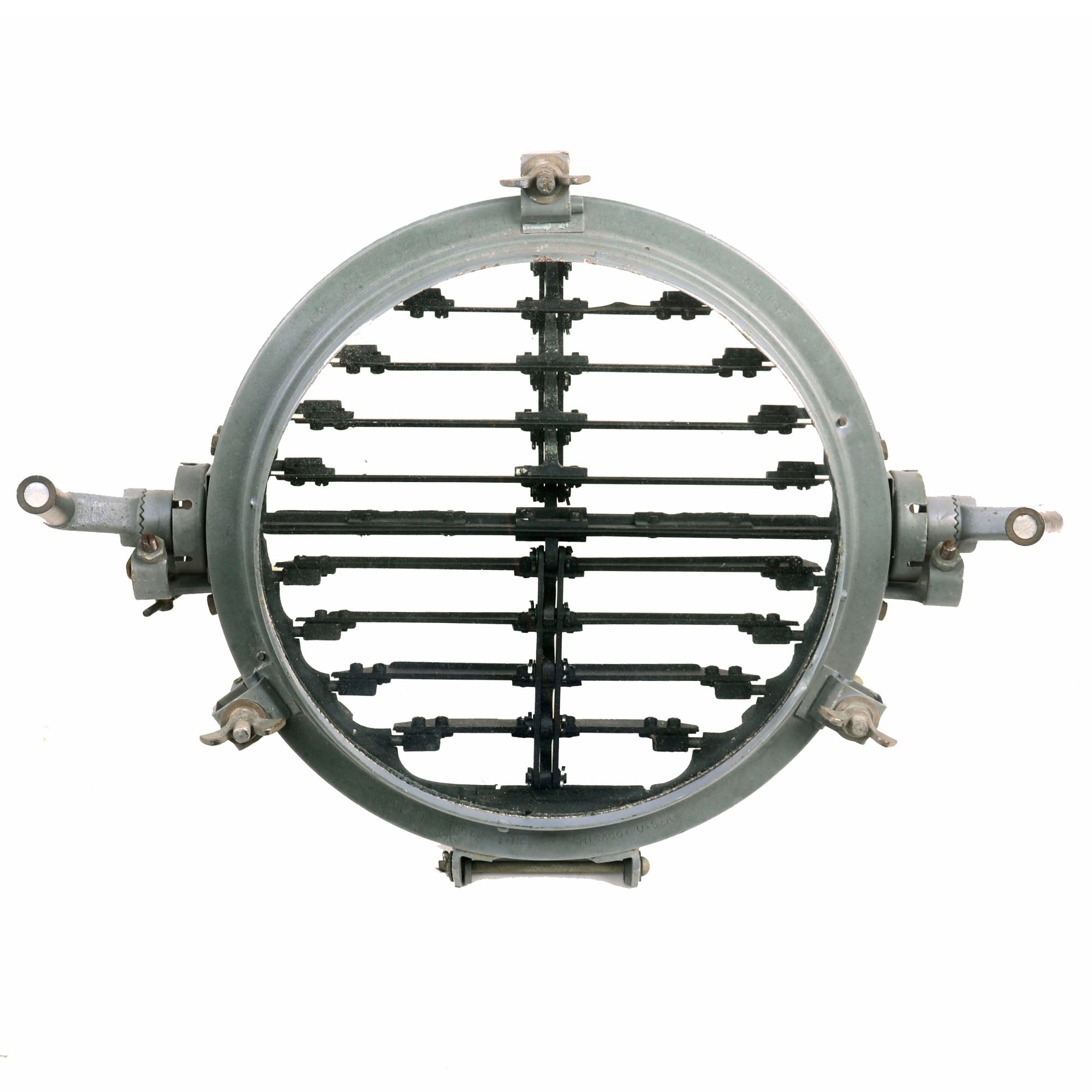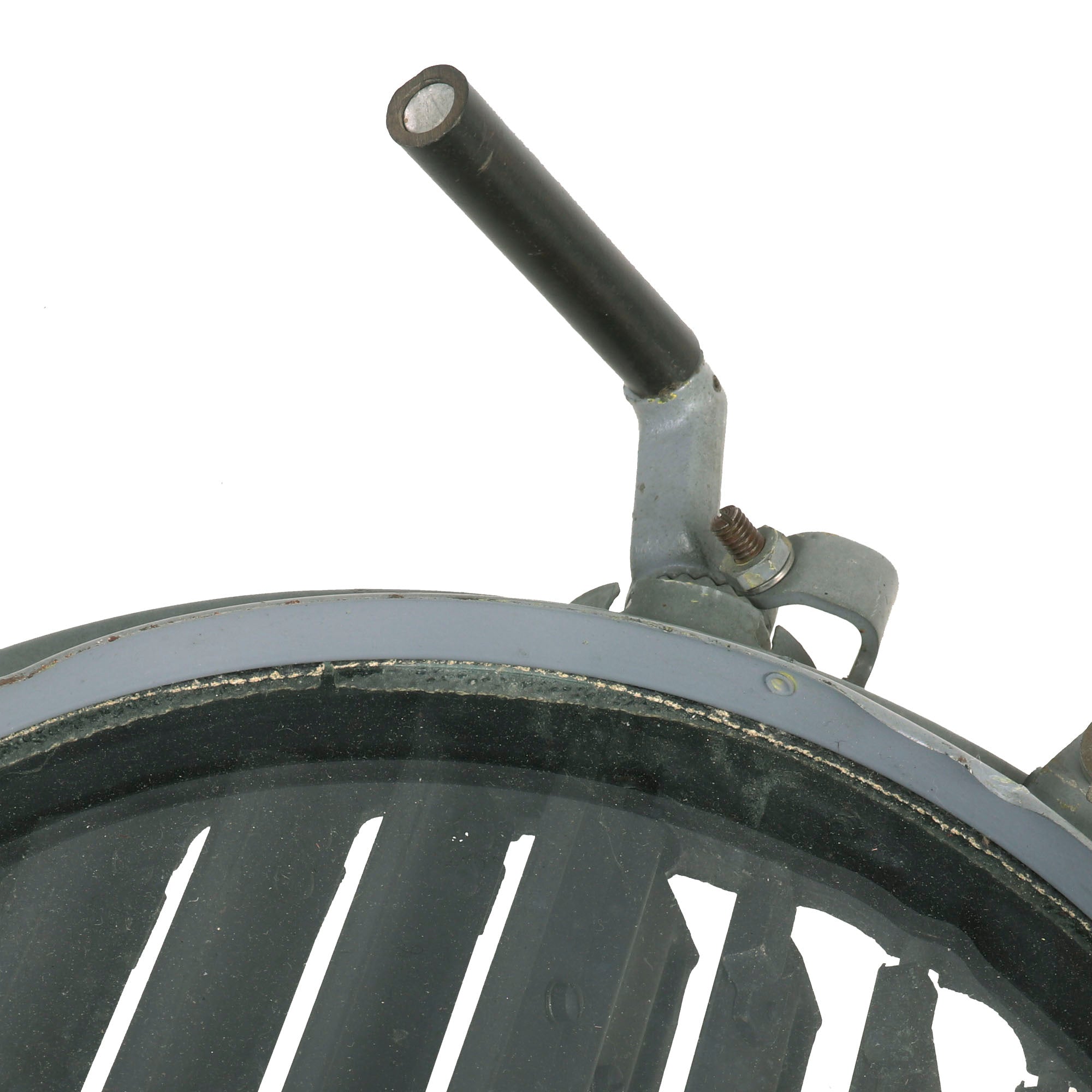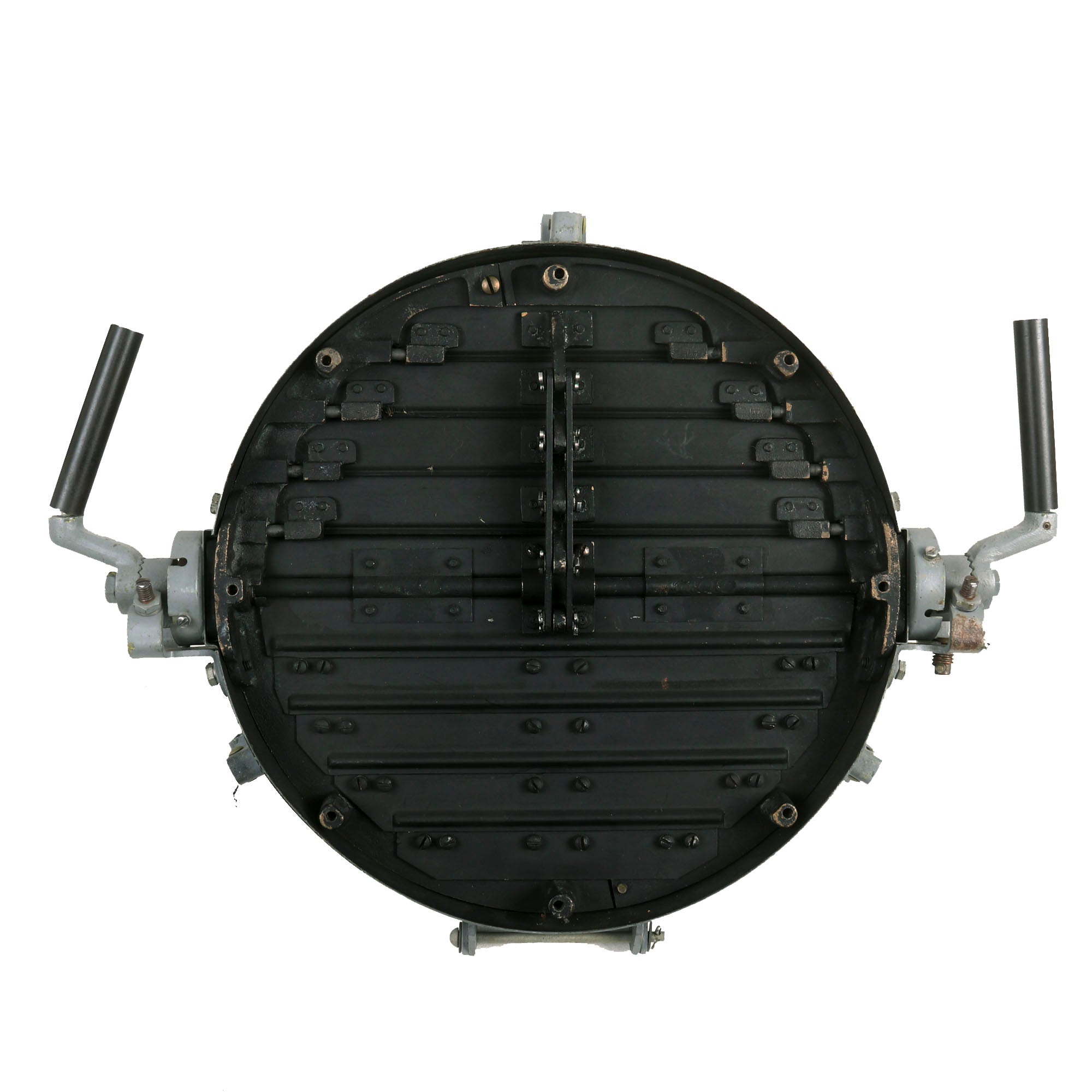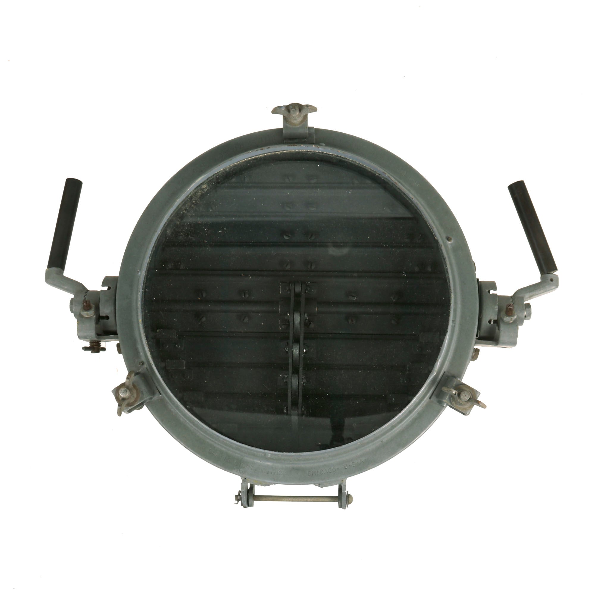 Original Item: Only One Available. This is a fantastic condition unissued SHUTTER FOR 12" SIGNALING SEARCHLIGHT faceplate, as used on the USN Model 95001 12 inch Signaling Searchlight. These were mounted on ships during WWII, and were able to be used as a searchlight, and also have a shutter in the front to send messages to other ships. The mechanism on the front is somewhat delicate, so spares were kept on hand in case there was damage.