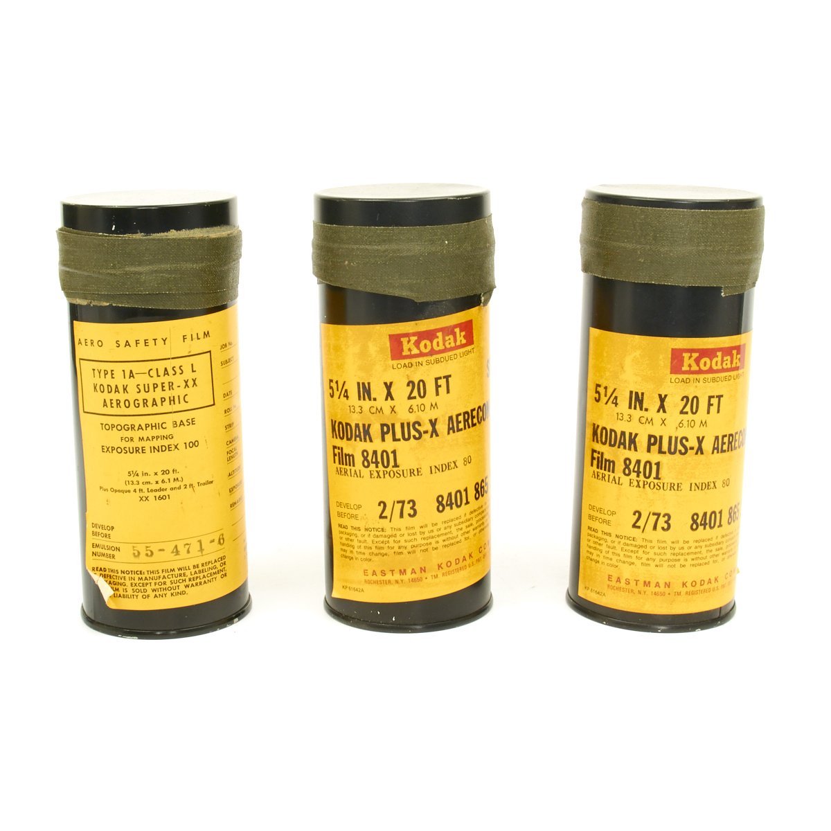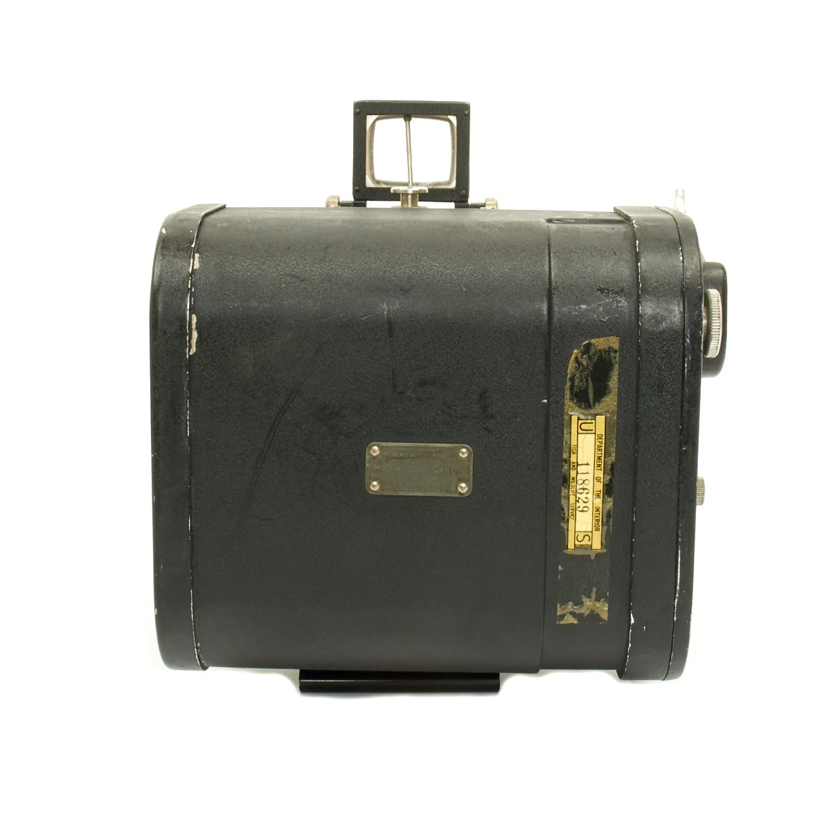 The K-20 uses a 5.25" x 20' to 5.25" x 200' foot Roll Film, with an image size of 4x5 inches. Lenses were 6 3/8" f/4.5 with an adjustable diaphragm and were non interchangeable, these were made by Kodak, Ilex, or Bausch & Lomb, as available at the time of order. This example has an Eastman Kodak marked lens. The camera featured the use of a vacuum to keep the film flat.