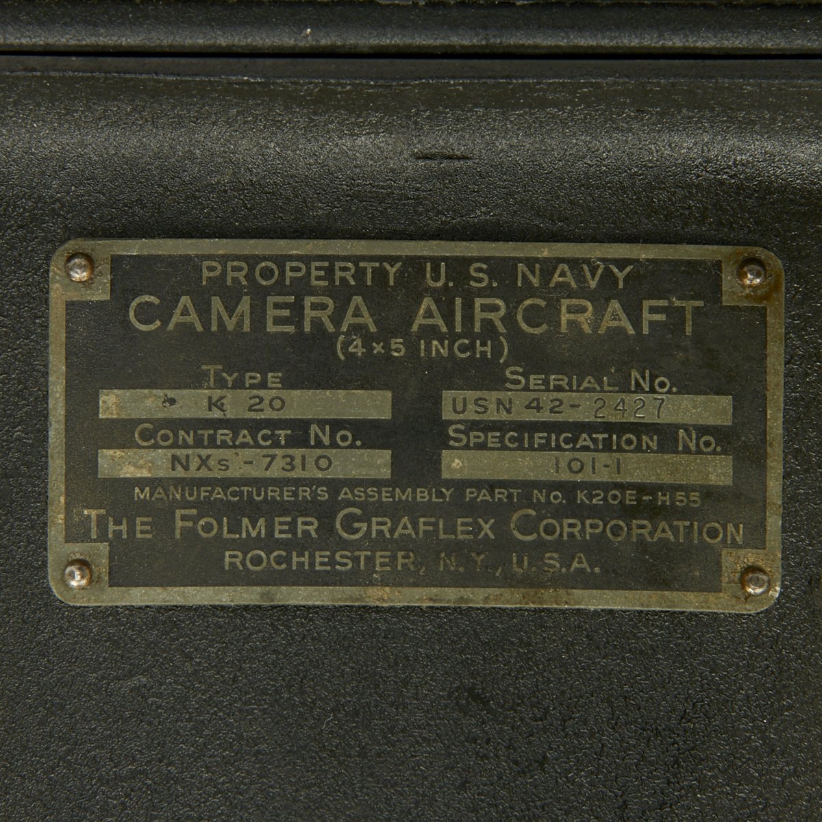 Original Item: Only One Available. The K-20 (K20) is an aerial photography camera used during World War II, e.g., from the Enola Gay's tail gunner position of the mushroom cloud over Hiroshima. Designed by Fairchild Camera and Instrument, approximately 15,000 were manufactured under license for military contract by Folmer Graflex Corporation in Rochester, NY between 1941 and 1945. There is a data plate on the top of the camera with contract and manufacturer information: