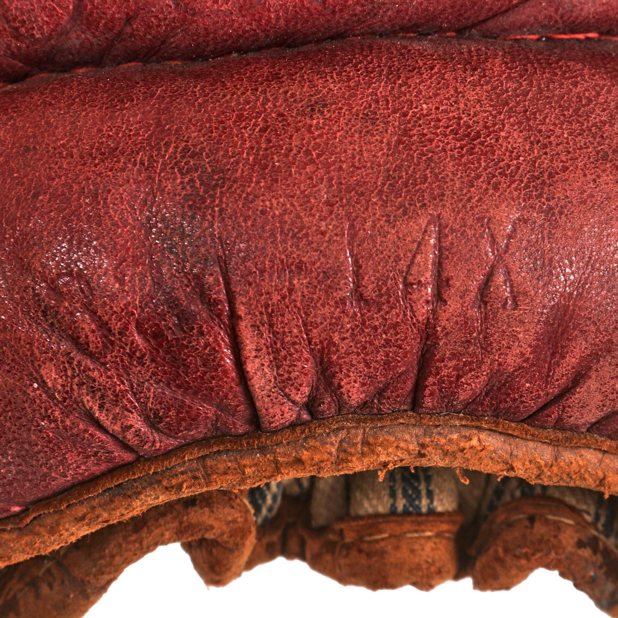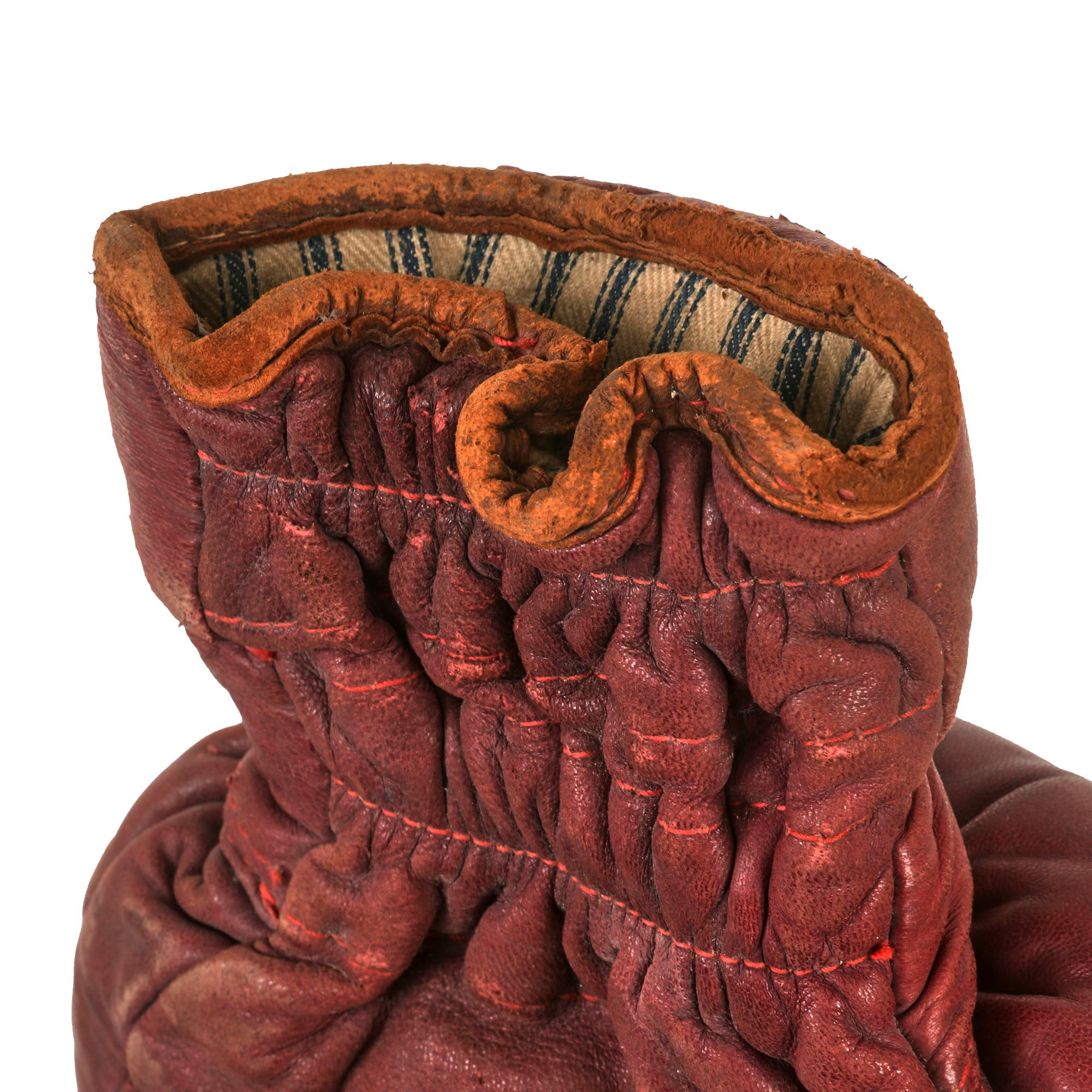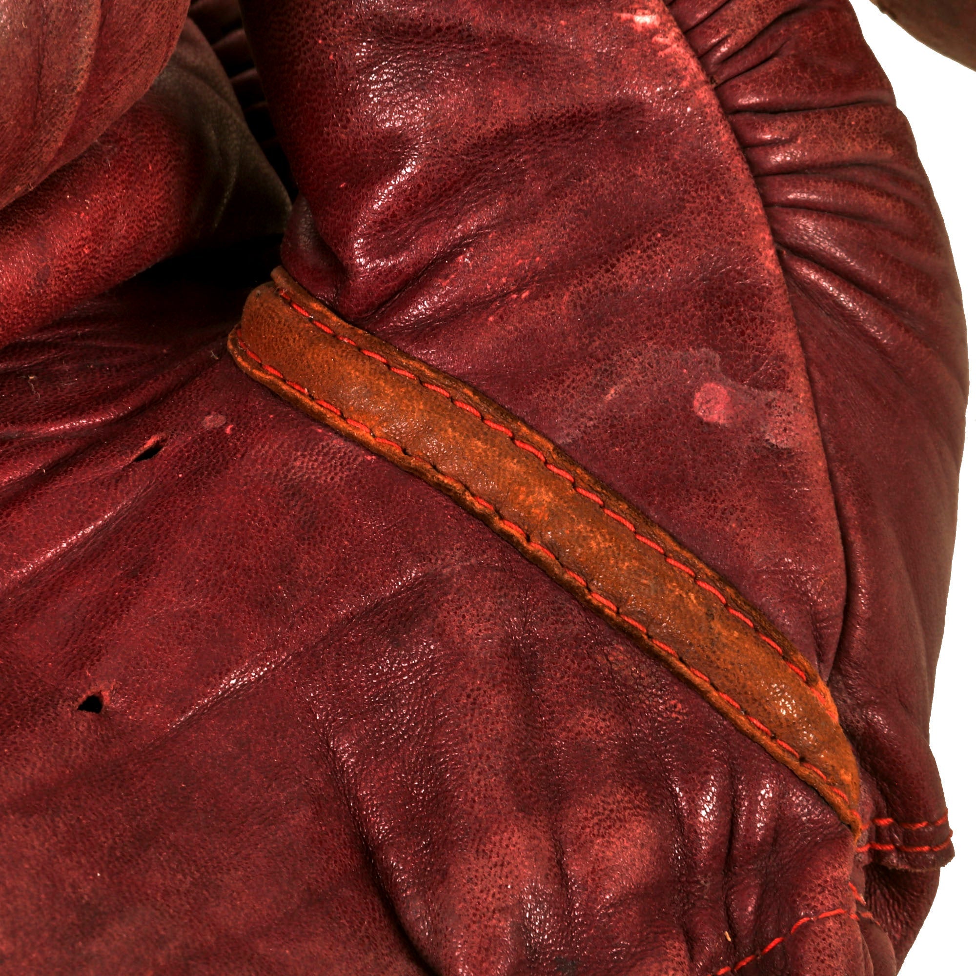 The gloves retain their red color well with some staining and wear to the material. The palms have five small holes which are still retained.