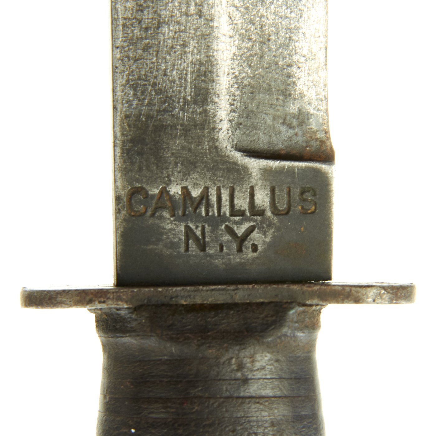 This knife is a nice solid service used example with all leather grip washers intact and present, though worn. The plastic butt cap is in great shape, with no major chips or dents, though it is a bit loose. The knife measures 9 1/2" overall, with a 4 7/8" clip point blade. Blade nicely marked U.S.N. / MARK 1 on the ricasso and CAMILLUS / N.Y. on the reverse. About 30% of the original blade finish remains, and there are no major chips or dings on the edge, though there are some dents on the spint. Knife has been used and sharpened though, which has shortened the blade by around 1/8".