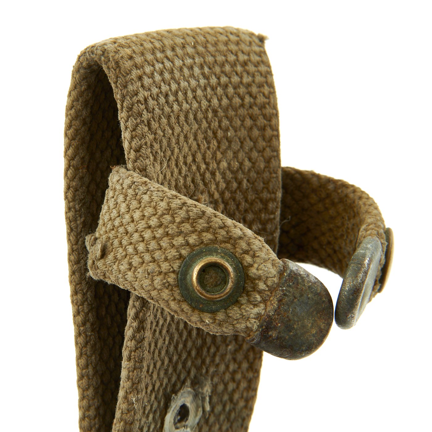 The scabbard is the early MK 1 version, very similar in construction to the M8 scabbard for the M3 fighting knife, with a thermoplastic impregnated cotton fabric body, metal throat, and canvas frog and securing strap. The front of the throat is marked U.S.N MK 1, and the rear is marked NORD - 8114 / B.M. Co. with a stylized V P logo. The NORD number is for the US Navy contract it was produced under, which was delivered between March 1945 and May 1945. It was manufactured by Beckwith Mfg Co. a division of Victory Plastics. Scabbard is in good condition, with some wear and staining on the canvas of the integral frog.
