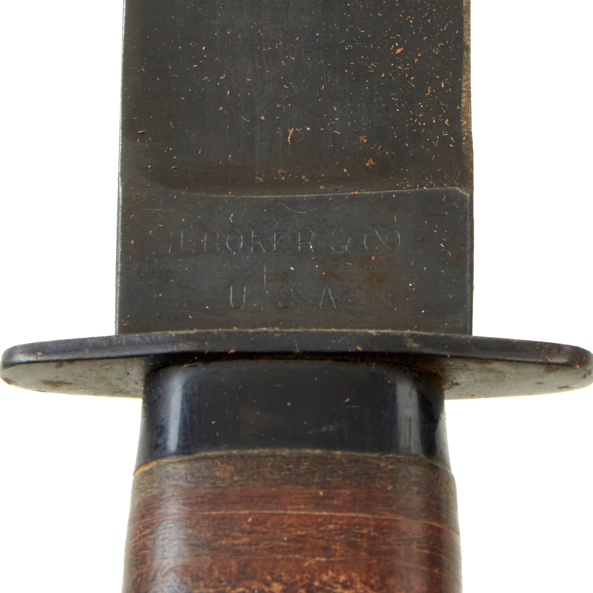 This knife is a nice solid example with all leather grip washers intact and present, made by H. Boker. The plastic butt cap is in great shape, with no major chips or dents, and is tight on the grip. The knife measures 9 5/8" overall, with a 5" clip point blade. The blade is nicely marked U.S.N. on the ricasso and H. BOKER / U.S.A. on the reverse. About 95% of the original blade finish remains. Knife has been used and sharpened though, so the edge is moved in slightly with the finish removed.