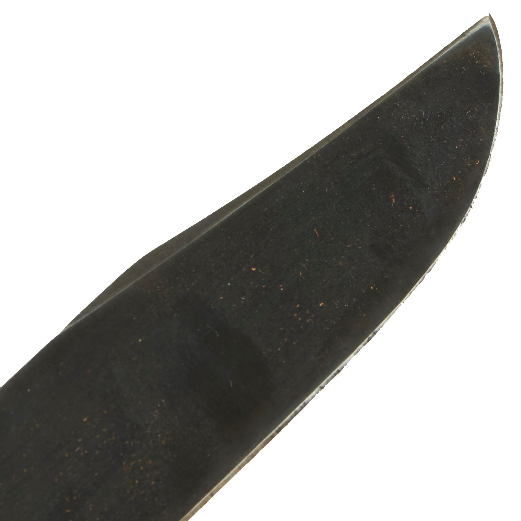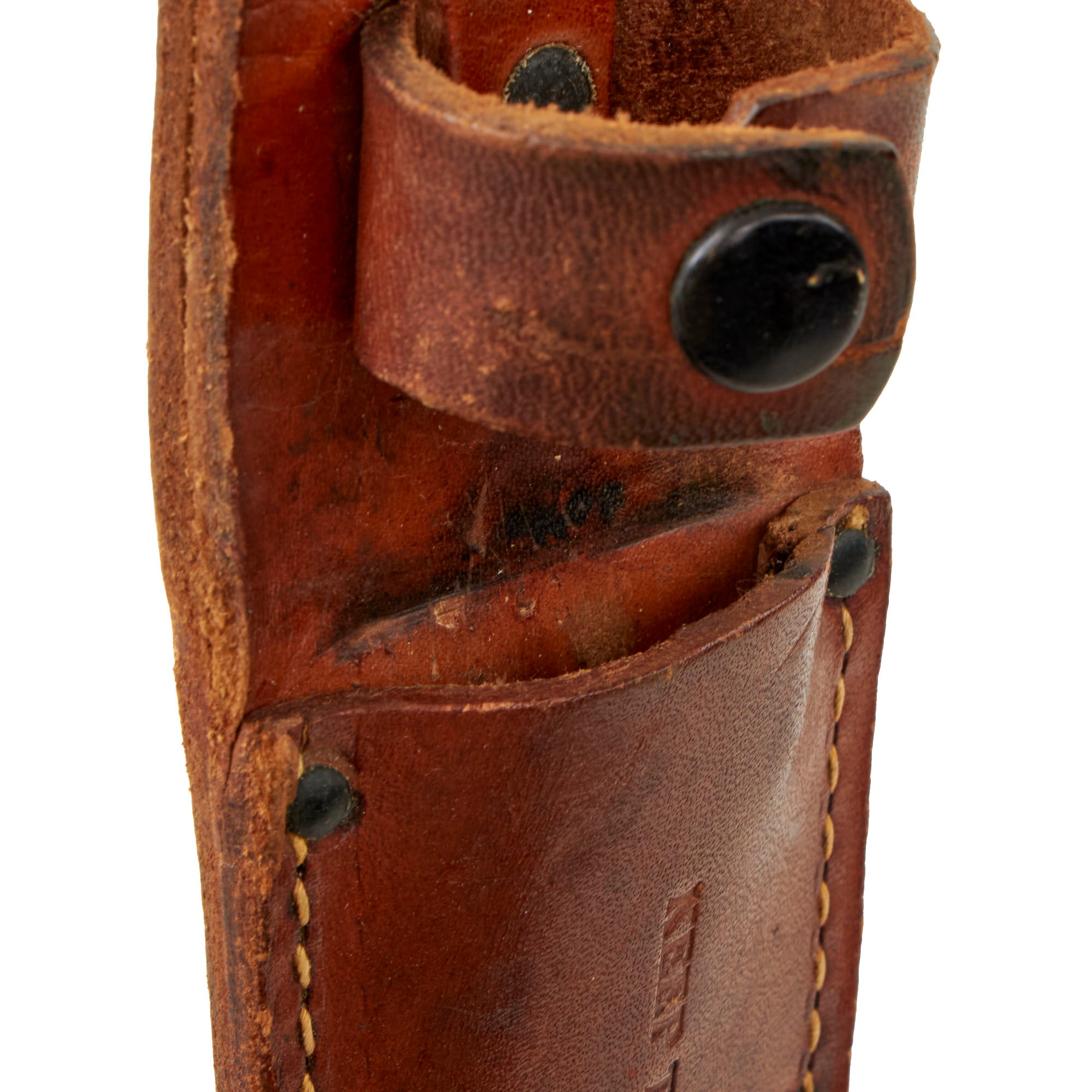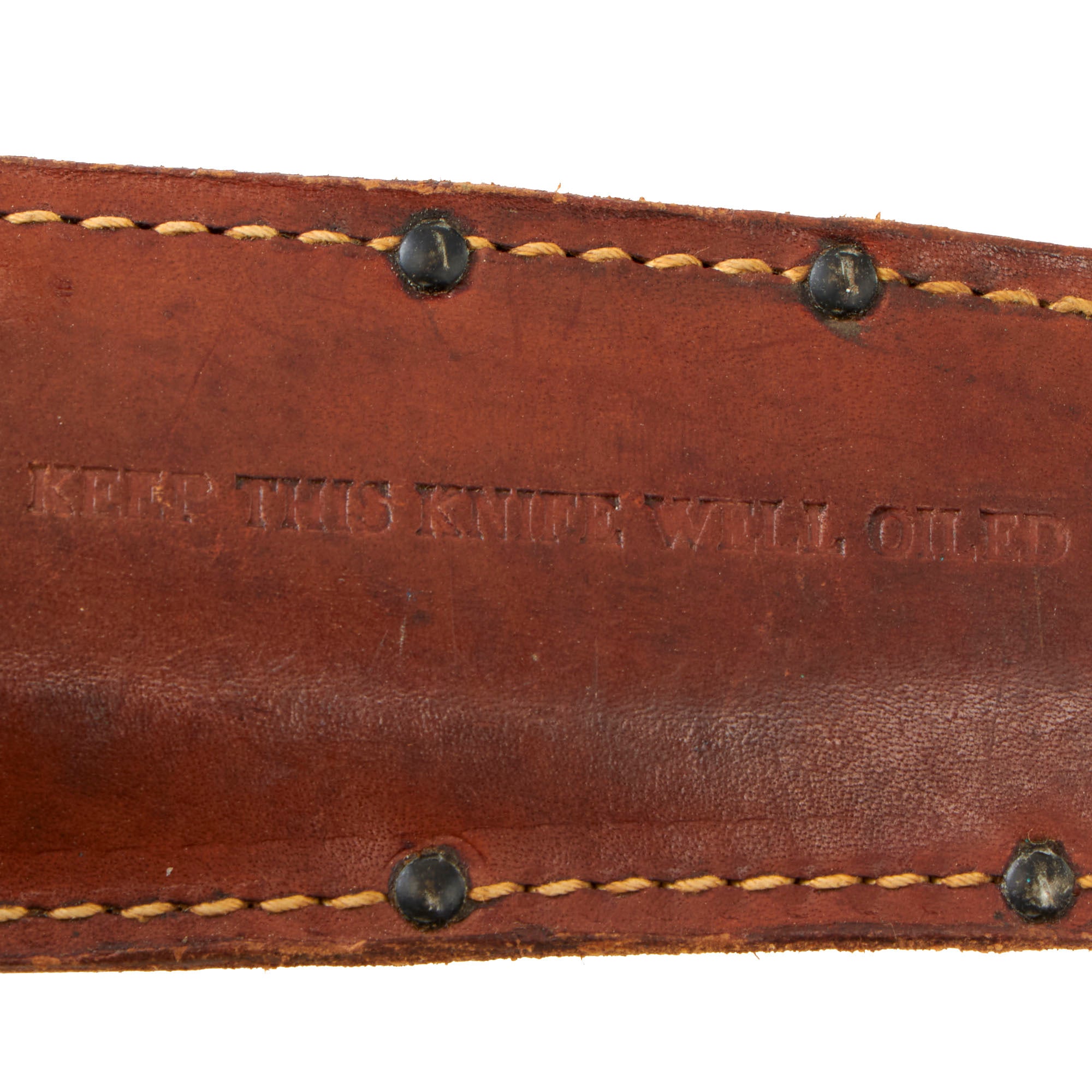 The leather sheath is in fantastic condition and retains all 9 rivets as well as solid stitching. The retaining strap is still present, slightly worn but still fully functional. There are no markings or anything aside from the “Keep This Knife Well Oiled” instruction on the front.
