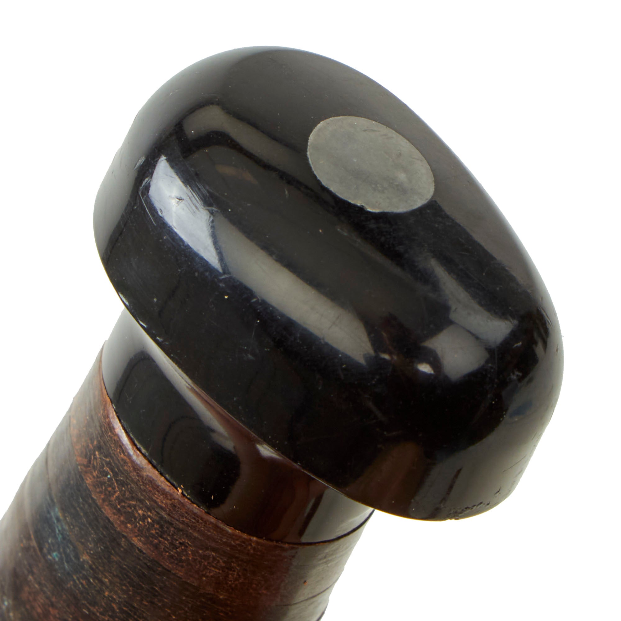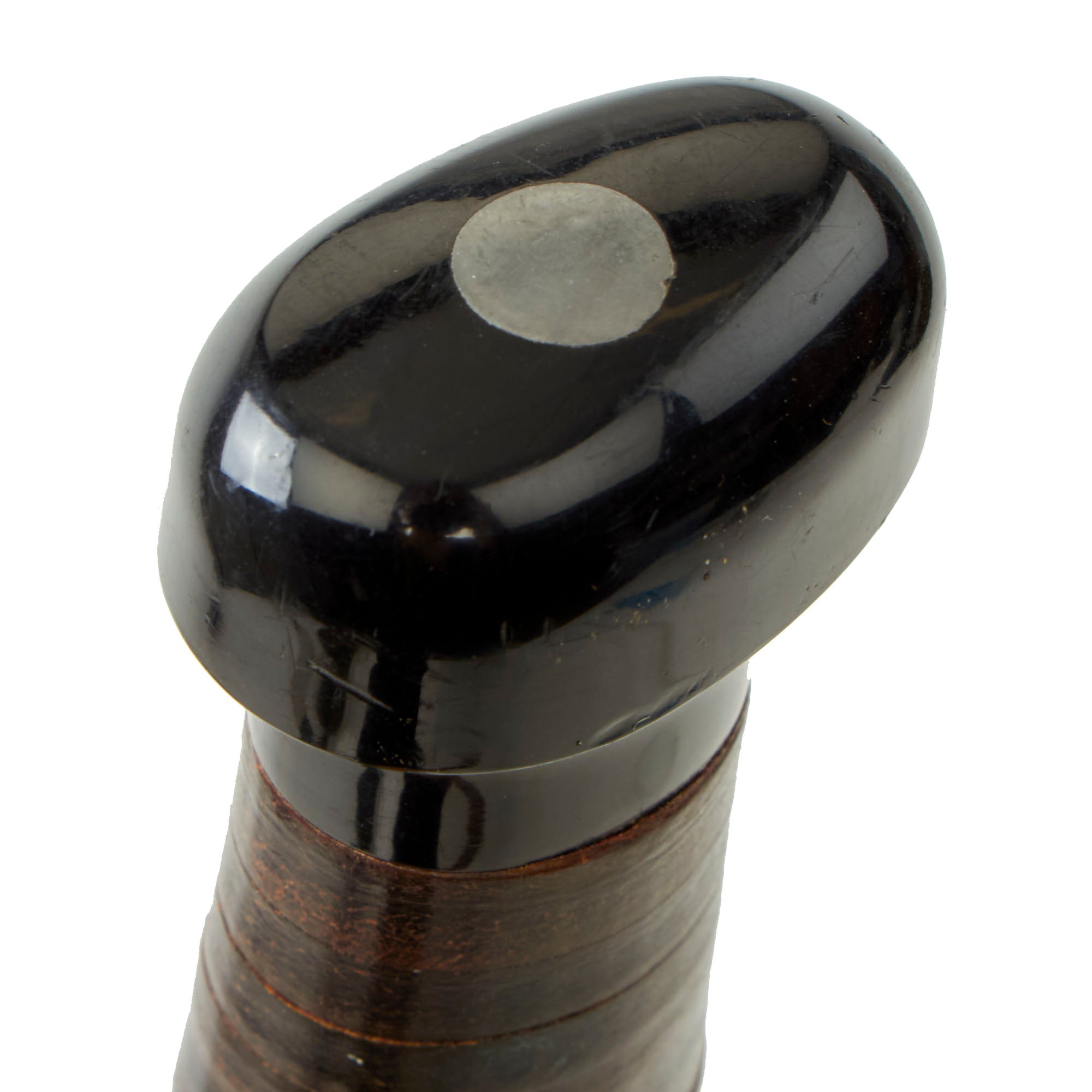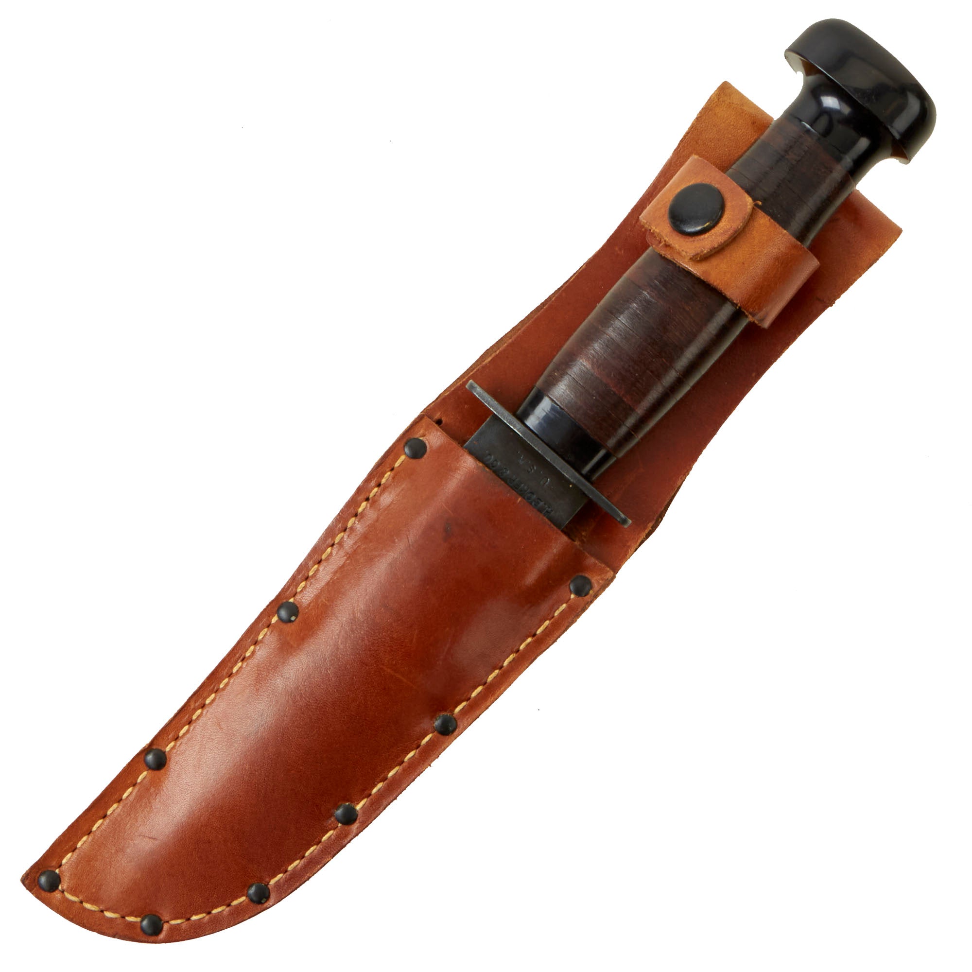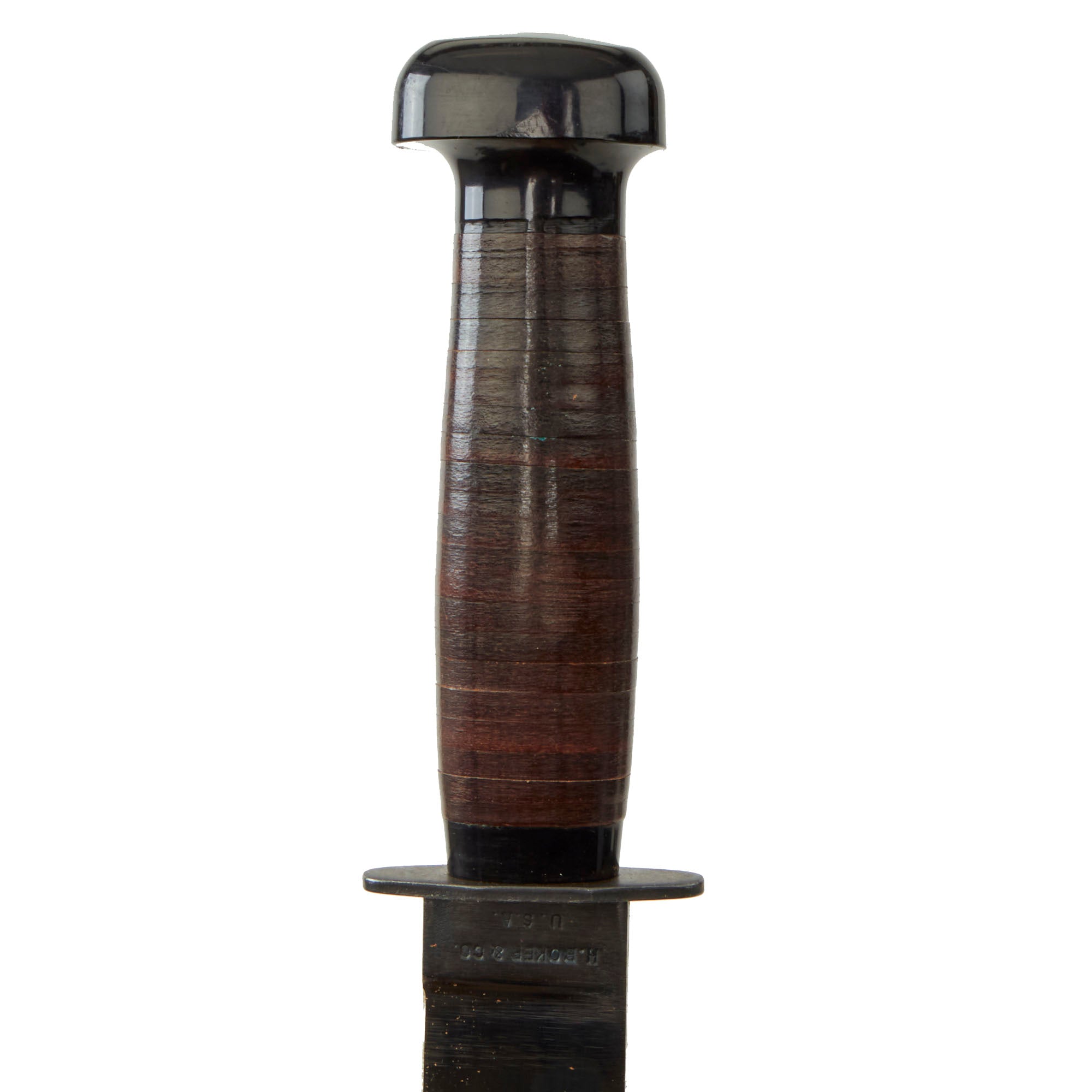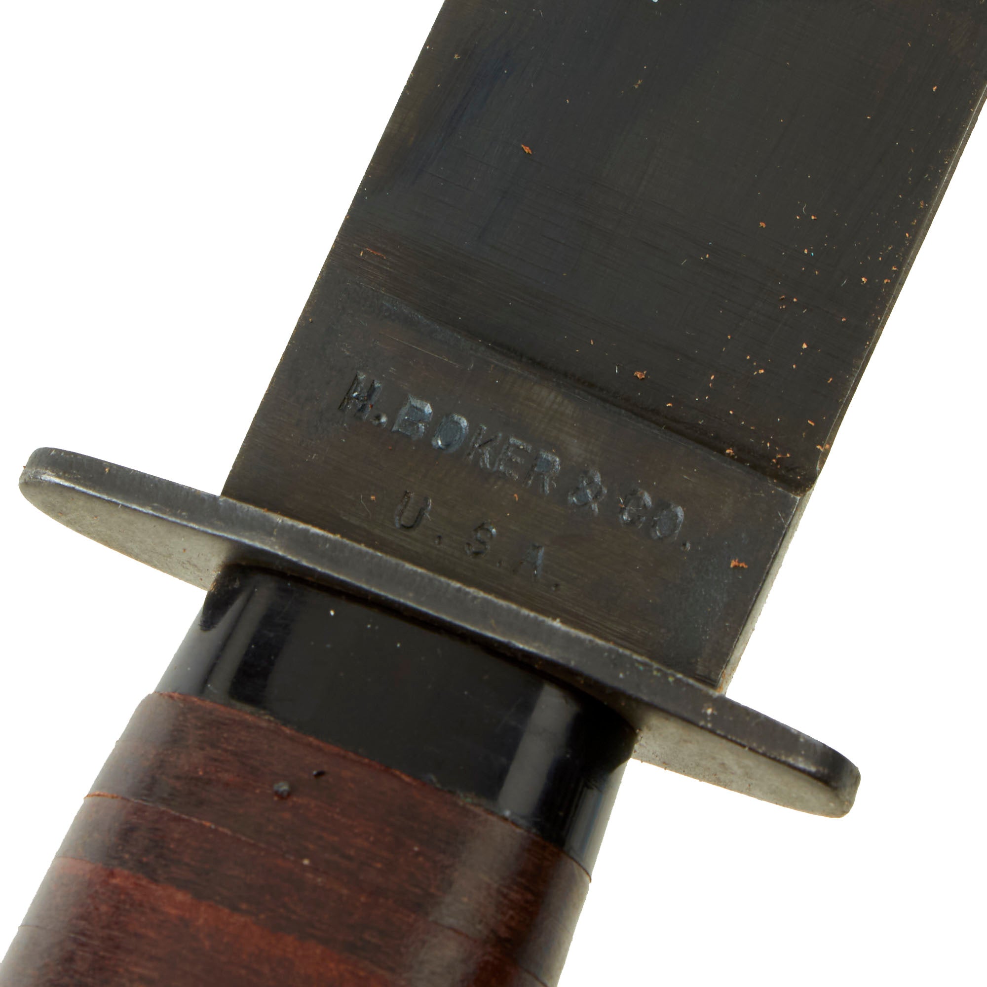 This knife is a nice solid example with all leather grip washers intact and present, made by H. Boker. The plastic butt cap is in great shape, with no major chips or dents, and is tight on the grip. The knife measures 9 5/8" overall, with a 5" clip point blade. The blade is nicely marked U.S.N. on the ricasso and H. BOKER / U.S.A. on the reverse. About 99% of the original blade finish remains.