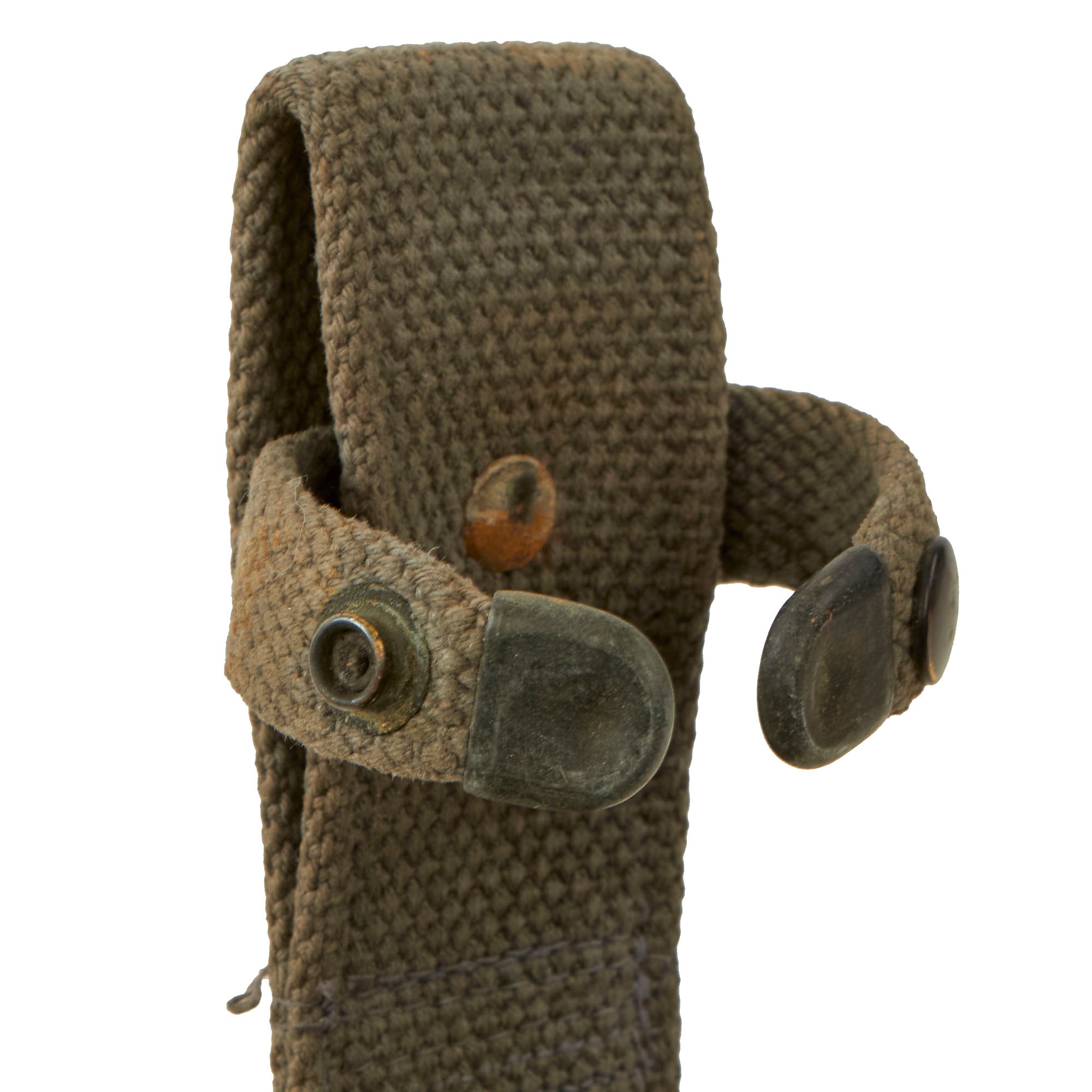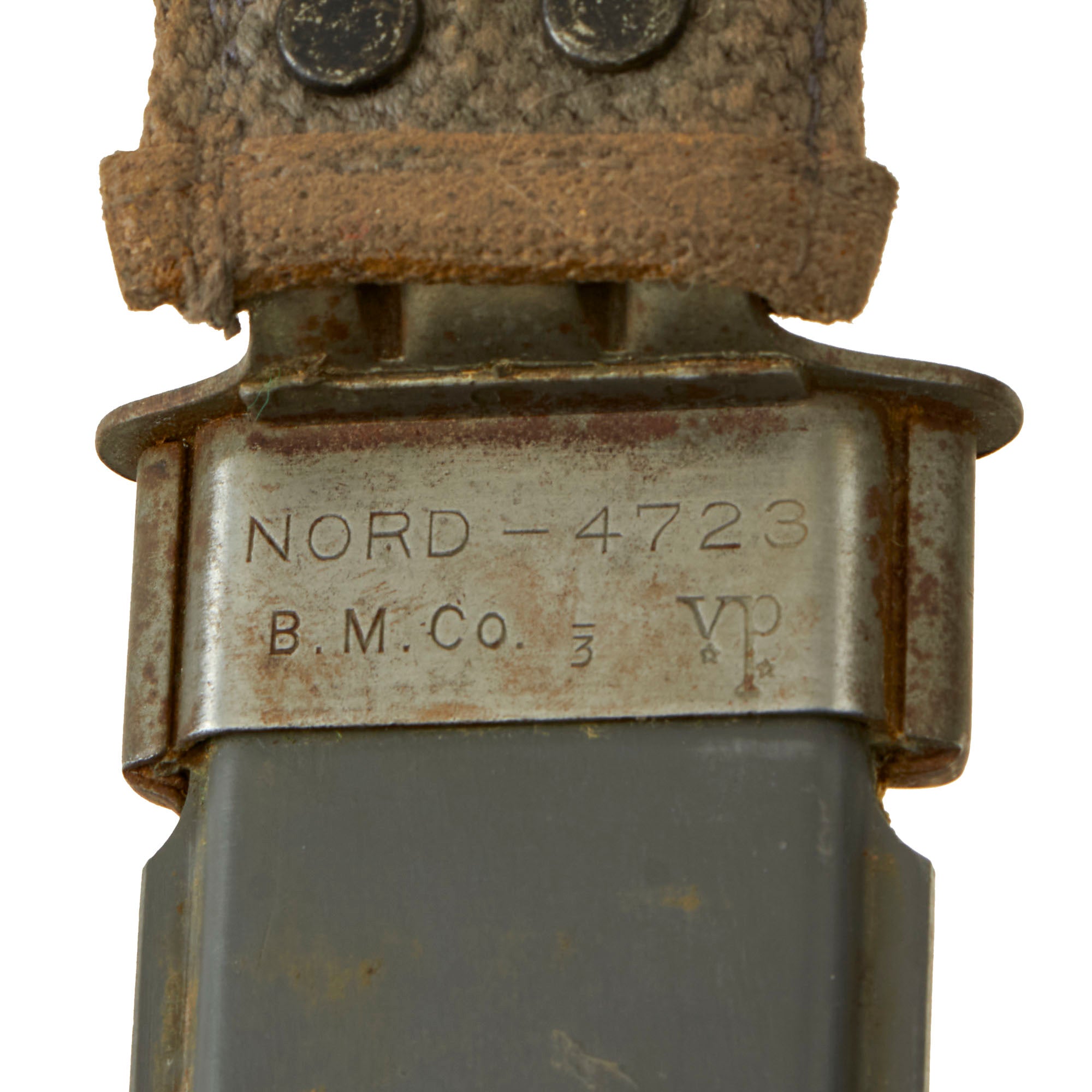 The scabbard is the early MK 1 version, very similar in construction to the M8 scabbard for the M3 fighting knife, with a thermoplastic impregnated cotton fabric body, metal throat, and canvas frog and securing strap. The front of the throat is marked U.S.N / MK 1, and the rear is marked NORD - 4723 / B.M. Co. with a stylized V P logo. The NORD number is for the US Navy contract it was produced under, which was delivered between November 1943 and July 1944. It was manufactured by Beckwith Mfg Co. a division of Victory Plastics. Scabbard is in good condition, with a nice scabbard body, and some staining and oxidation on the fittings.