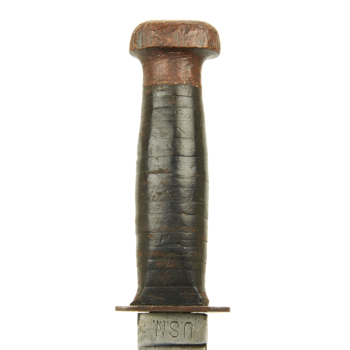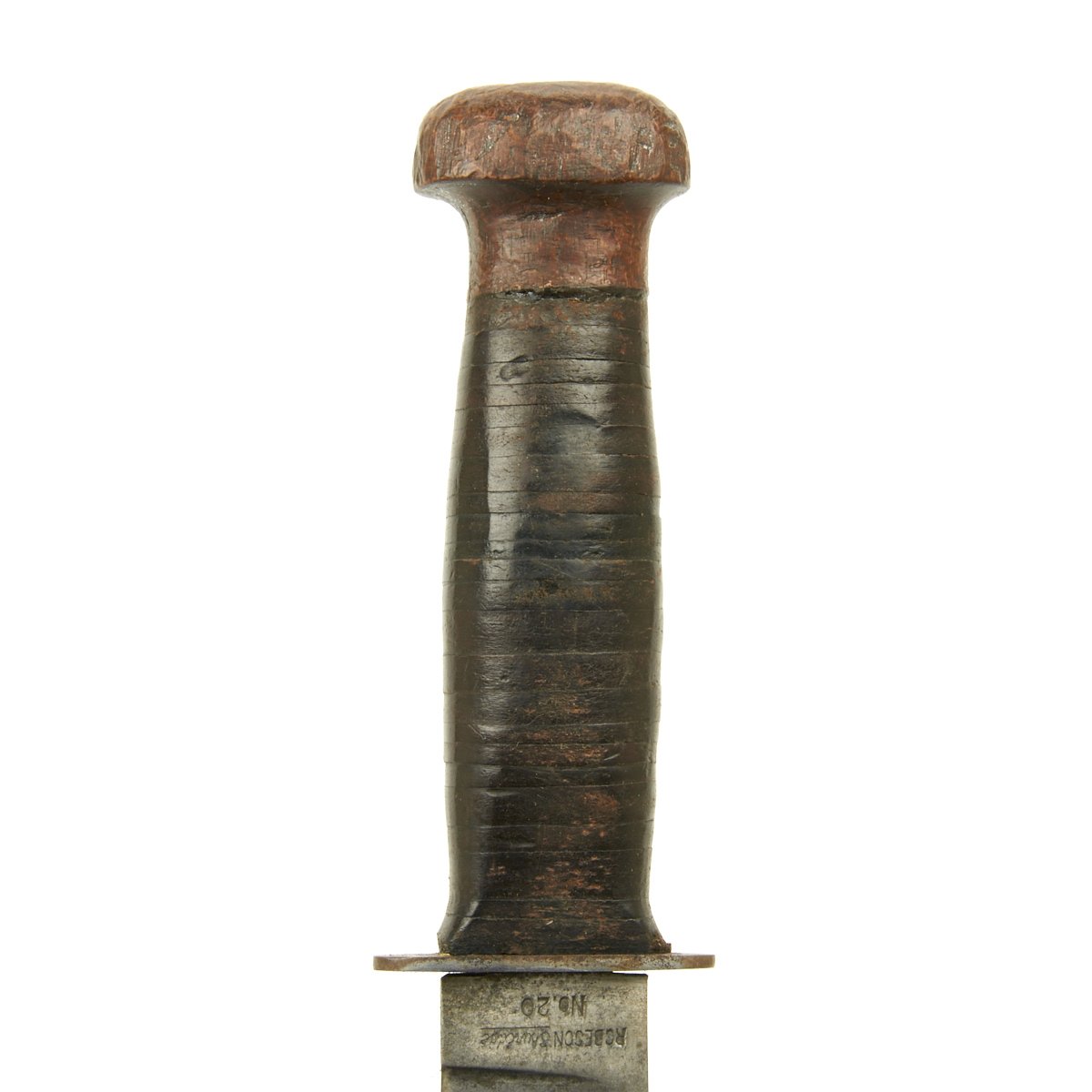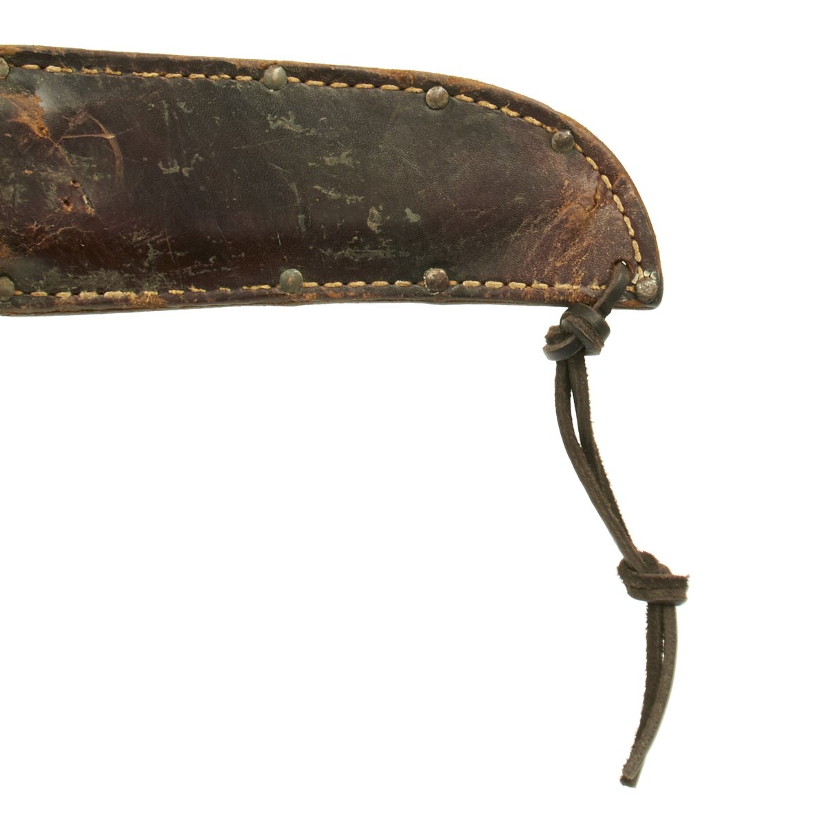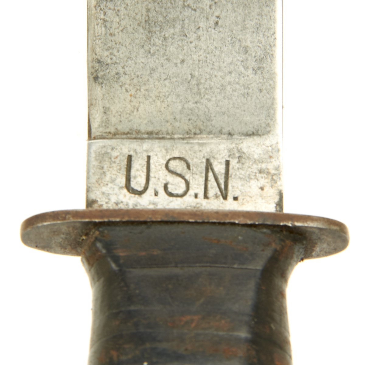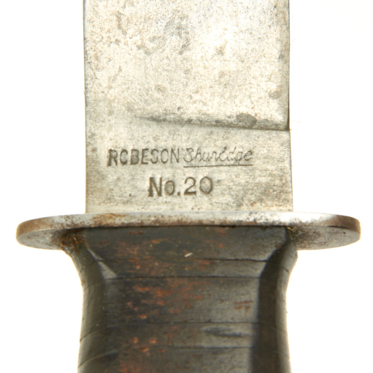 This knife is a nice solid example with all leather grip washers intact and present. The clip-point blade measures 5 1/8" with an overall length of 9 5/8". The blade is nicely marked on the ricasso with U.S.N. on one side, and ROBESON ShurEdge No. 20 on the reverse. Leather sheath present with all stitching intact and in good condition, though the retaining strap is worn. Overall a nice example of an iconic knife used in WWII.