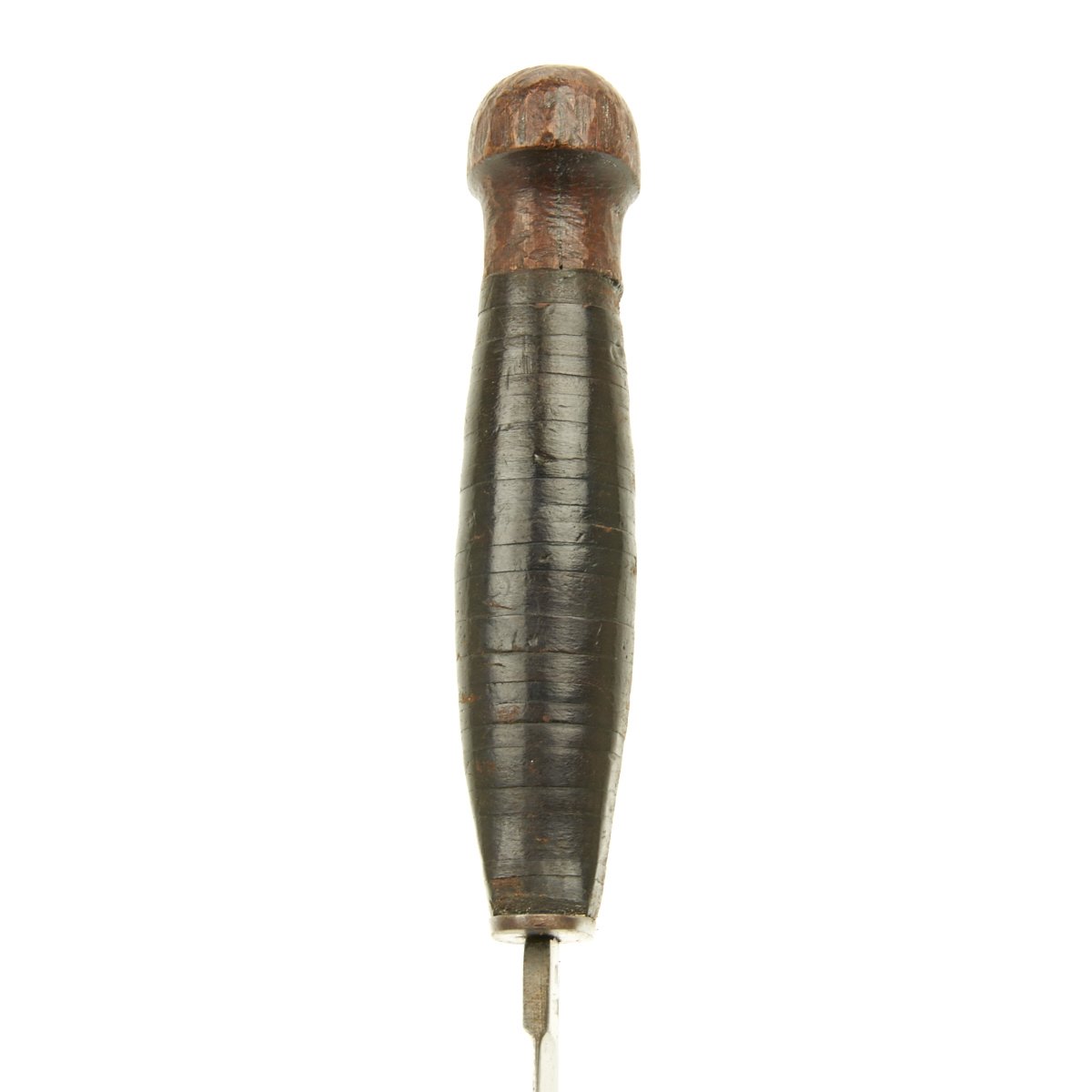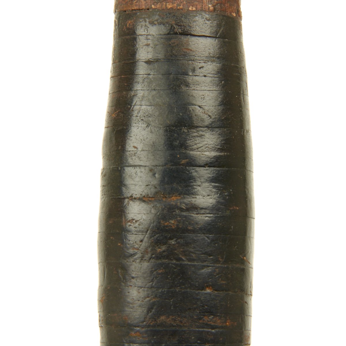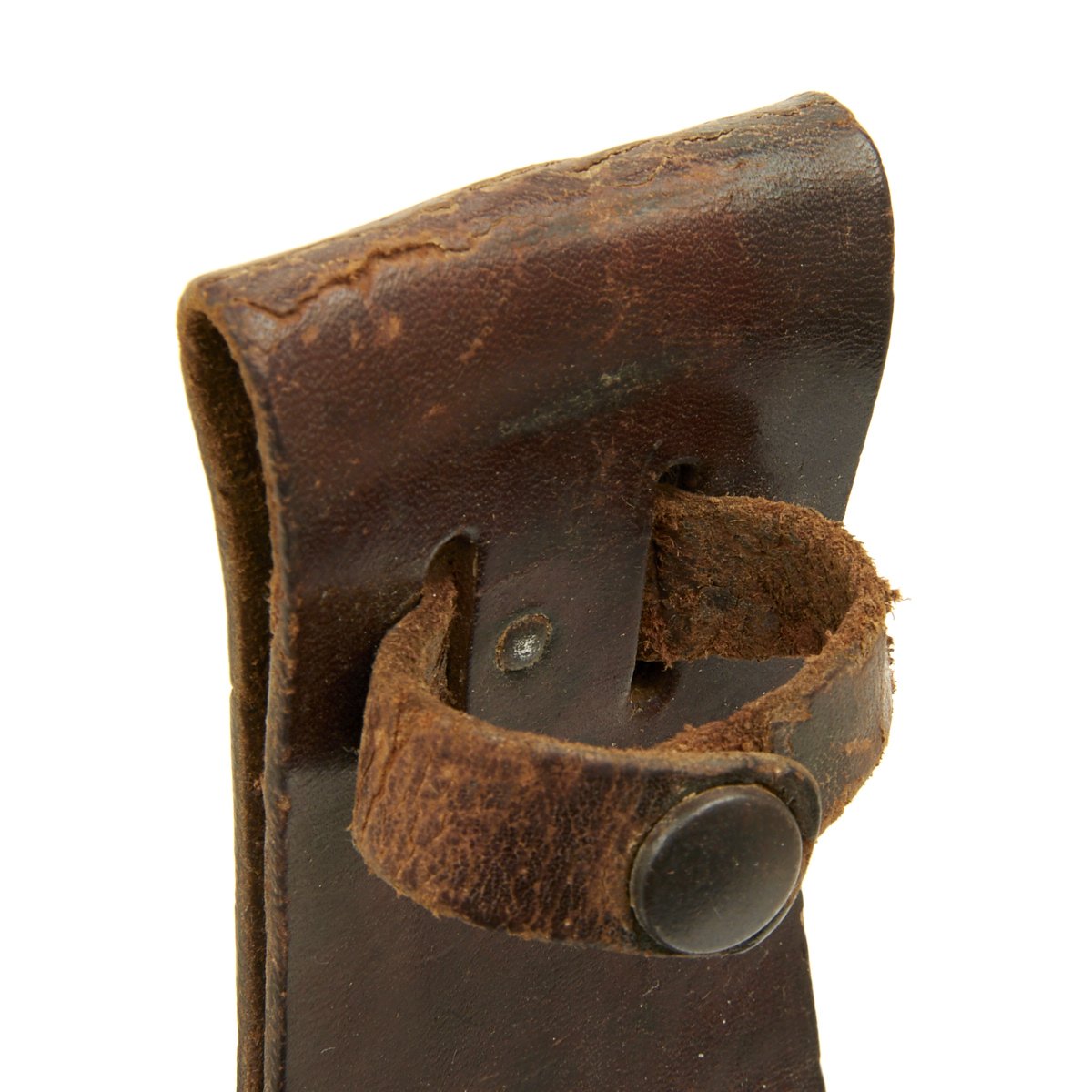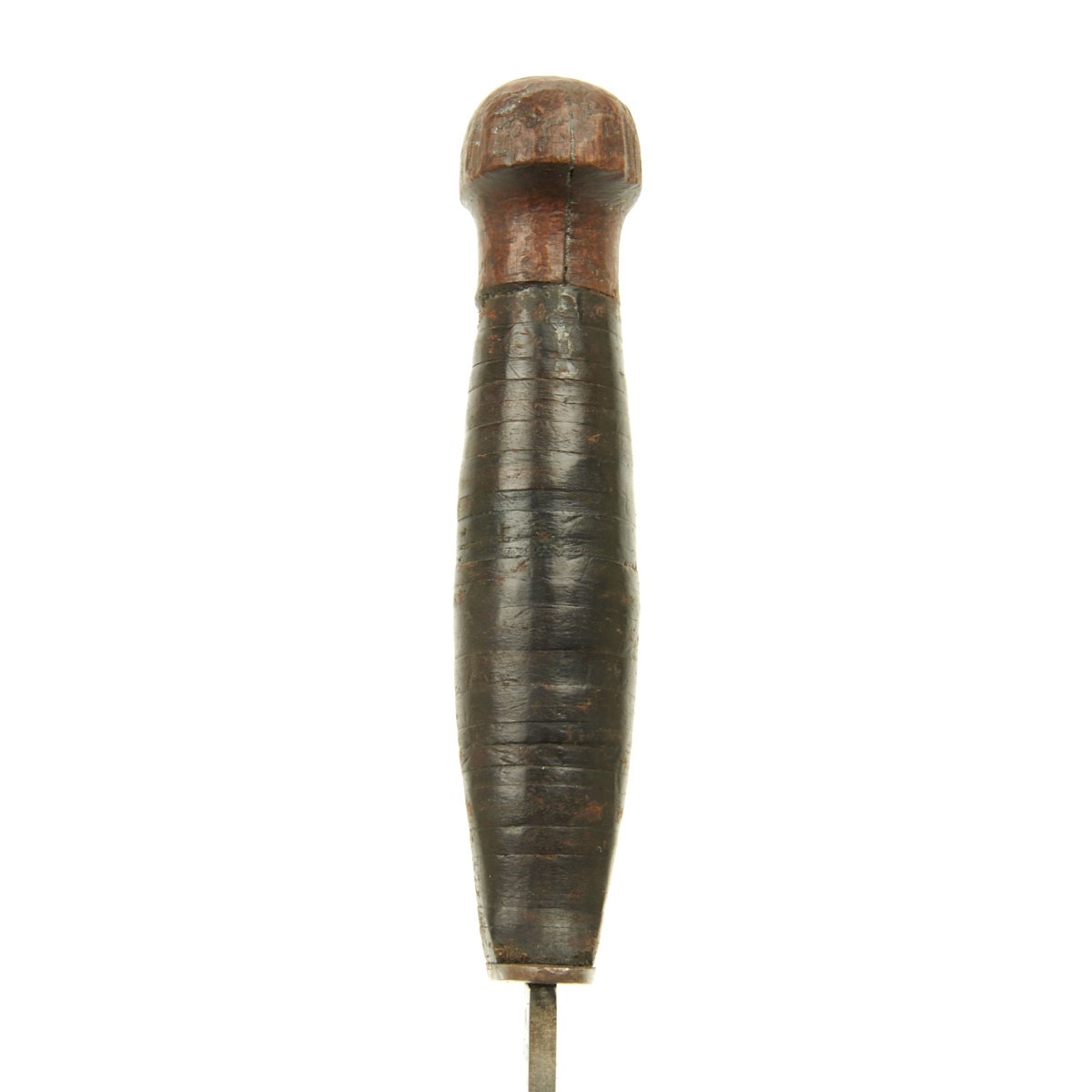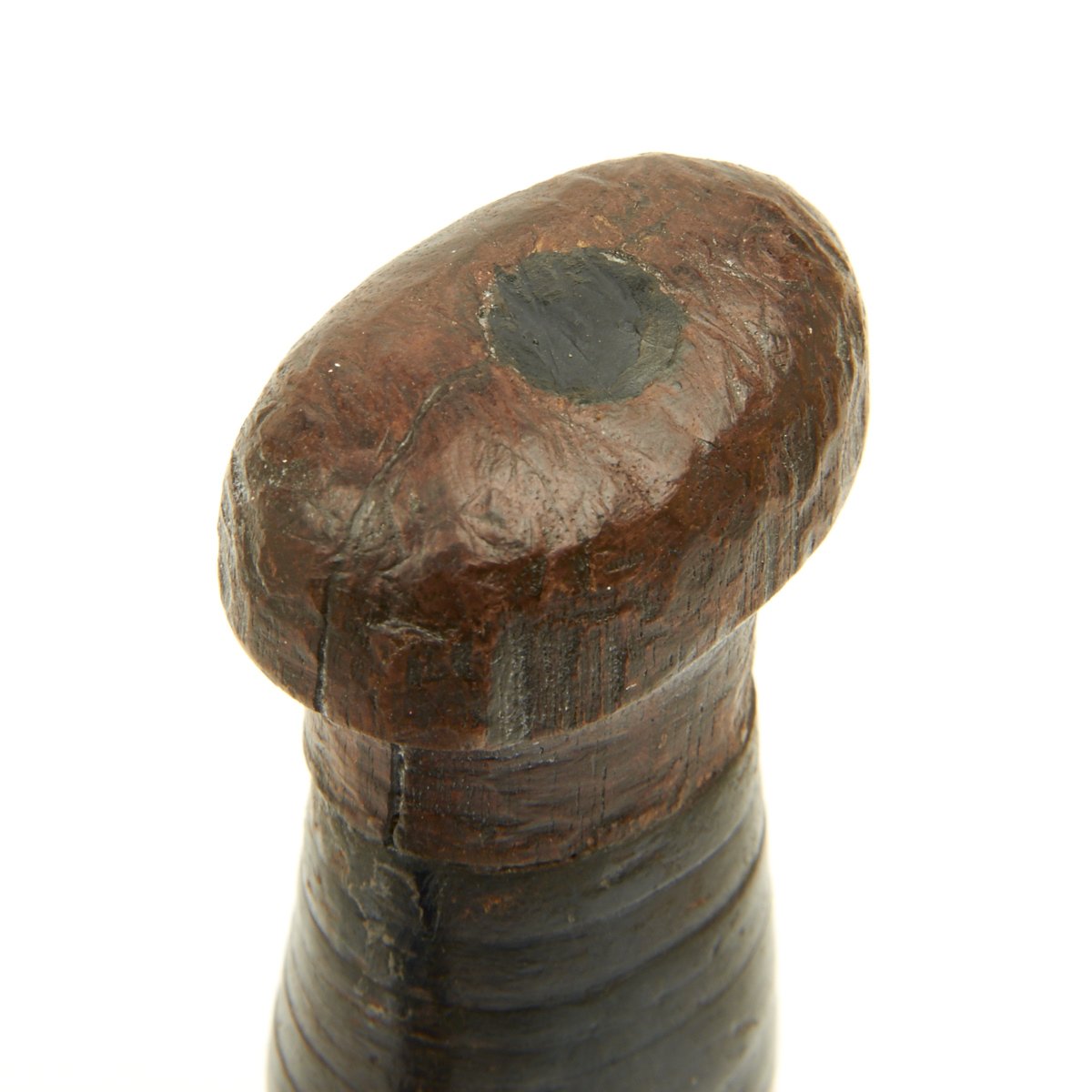 This knife is a nice solid example with all leather grip washers intact and present. The clip-point blade measures 5 1/8" with an overall length of 9 5/8". The blade is nicely marked on the ricasso with U.S.N. on one side, and ROBESON ShurEdge No. 20 on the reverse. Leather sheath present with all stitching intact and in good condition, though the retaining strap is worn. Overall a nice example of an iconic knife used in WWII.