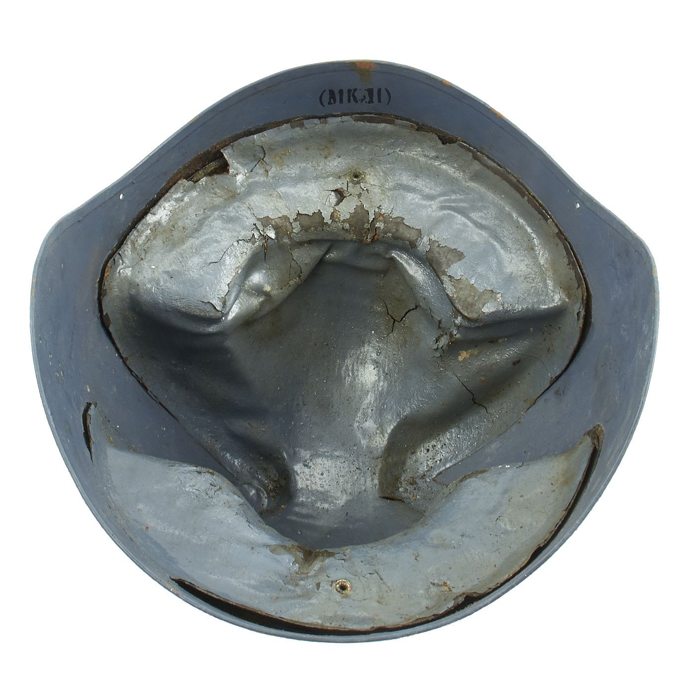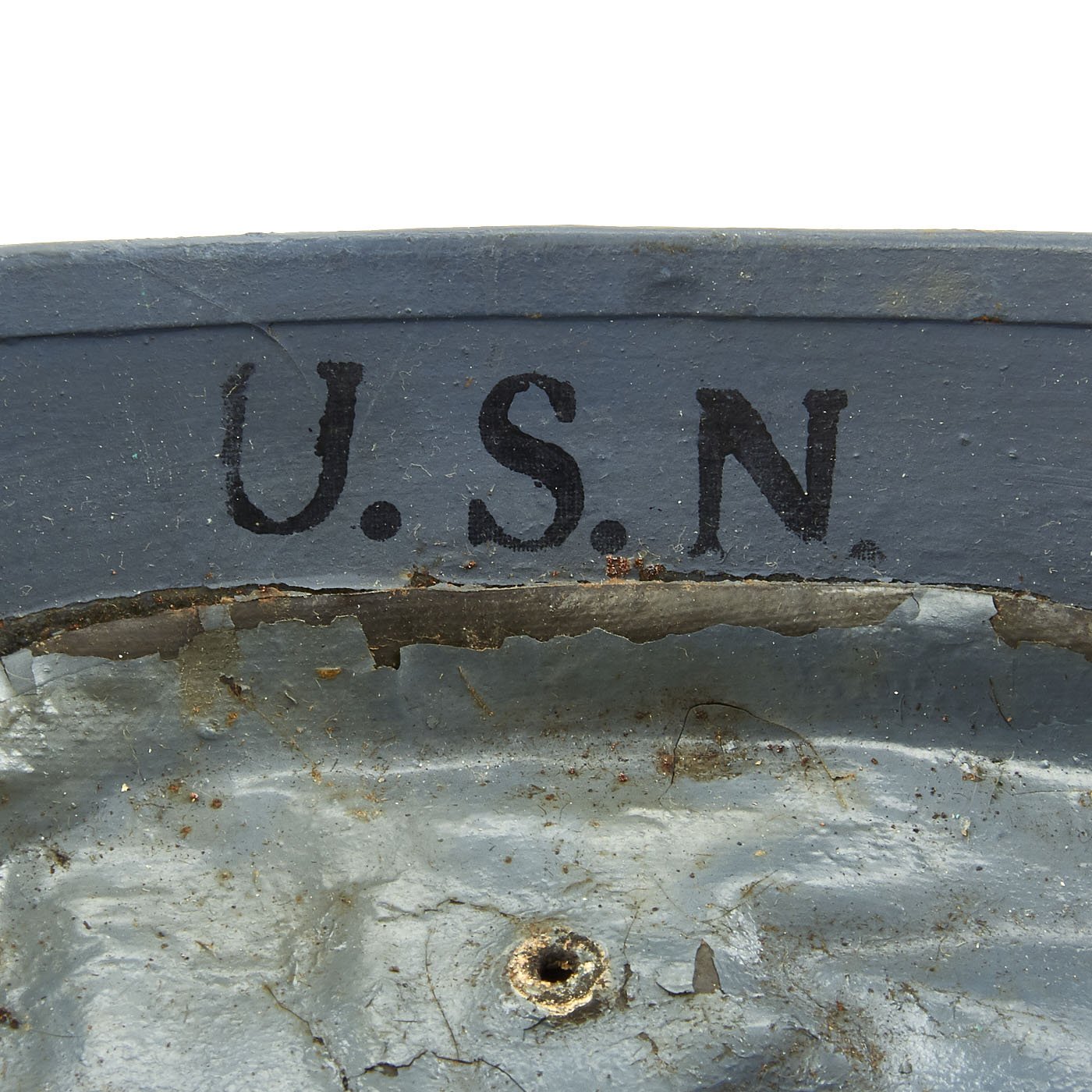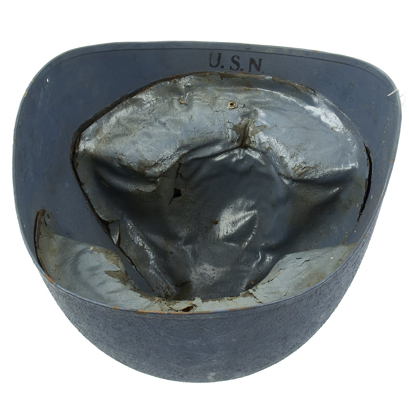 These helmets have become much harder to find lately, especially genuine WWII examples. This example is in very good condition, with great paint job. Also, the original paint stamped U.S.N. and MK-2 markings are fully visible. There is some paint chipping and light rust on the interior around the rim. The original liner is intact, though when the helmet was last repainted at arsenal, they painted over the liner, so it is in somewhat delicate condition, and cracks easily. The foam inside has most likely deteriorated. The chin strap is unfortunately missing, however they can be found on the surplus market.
