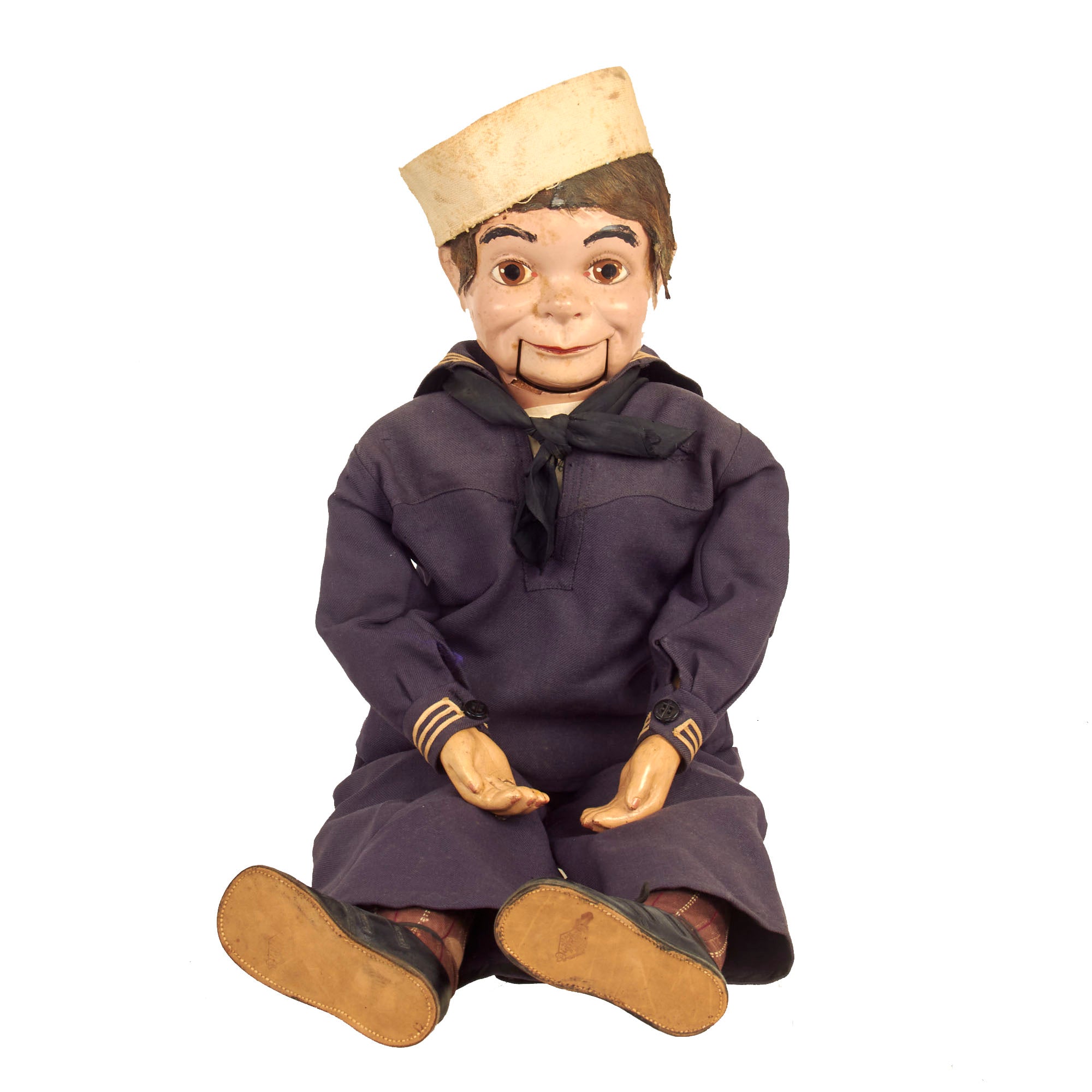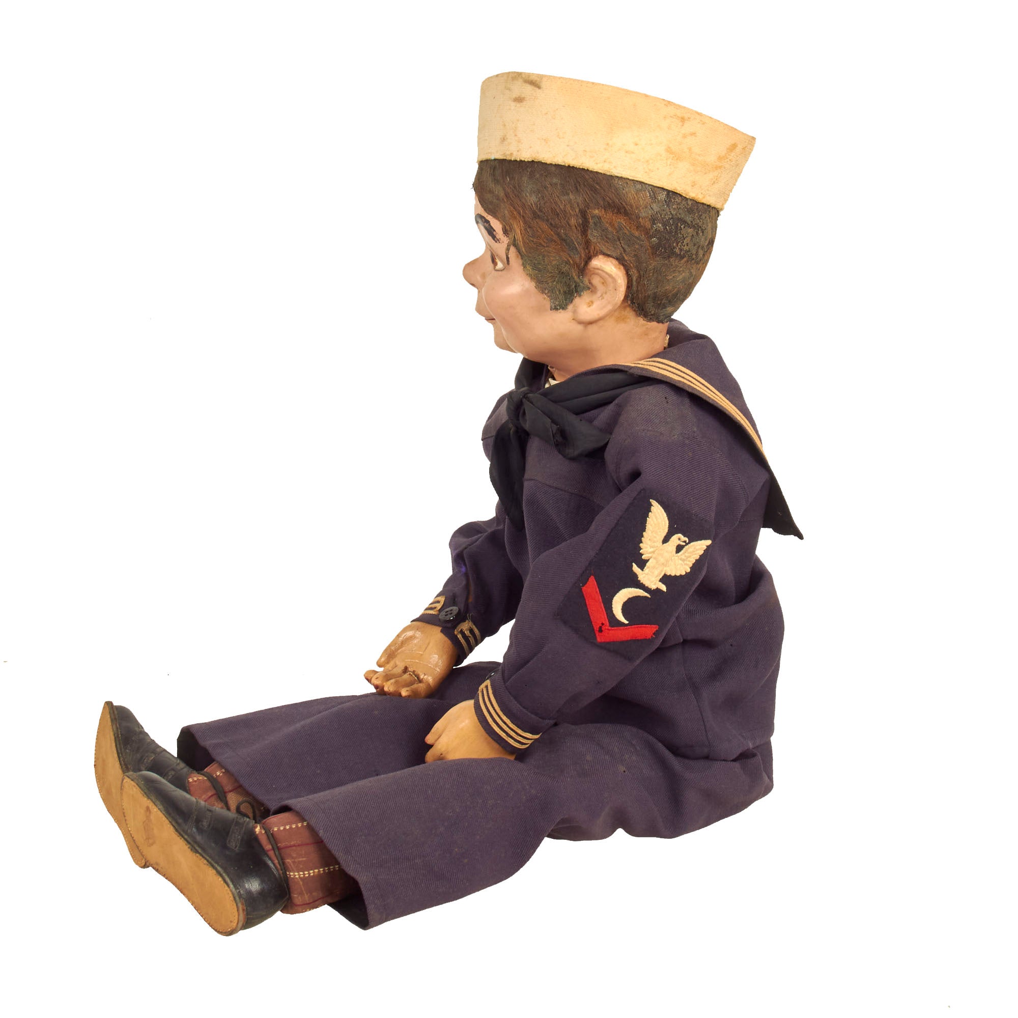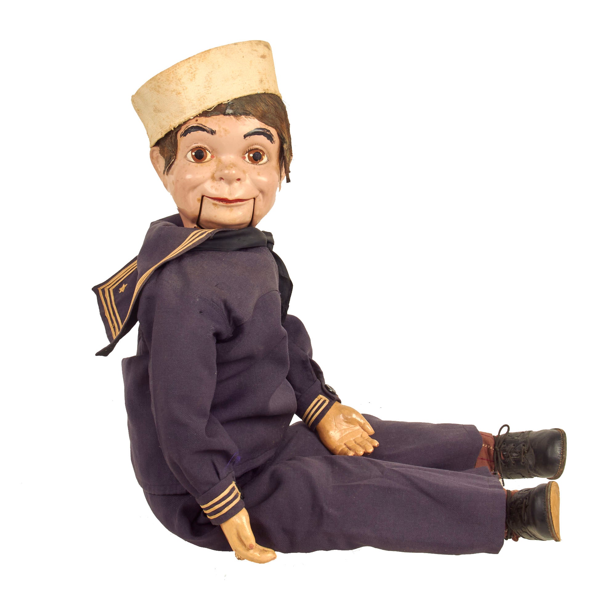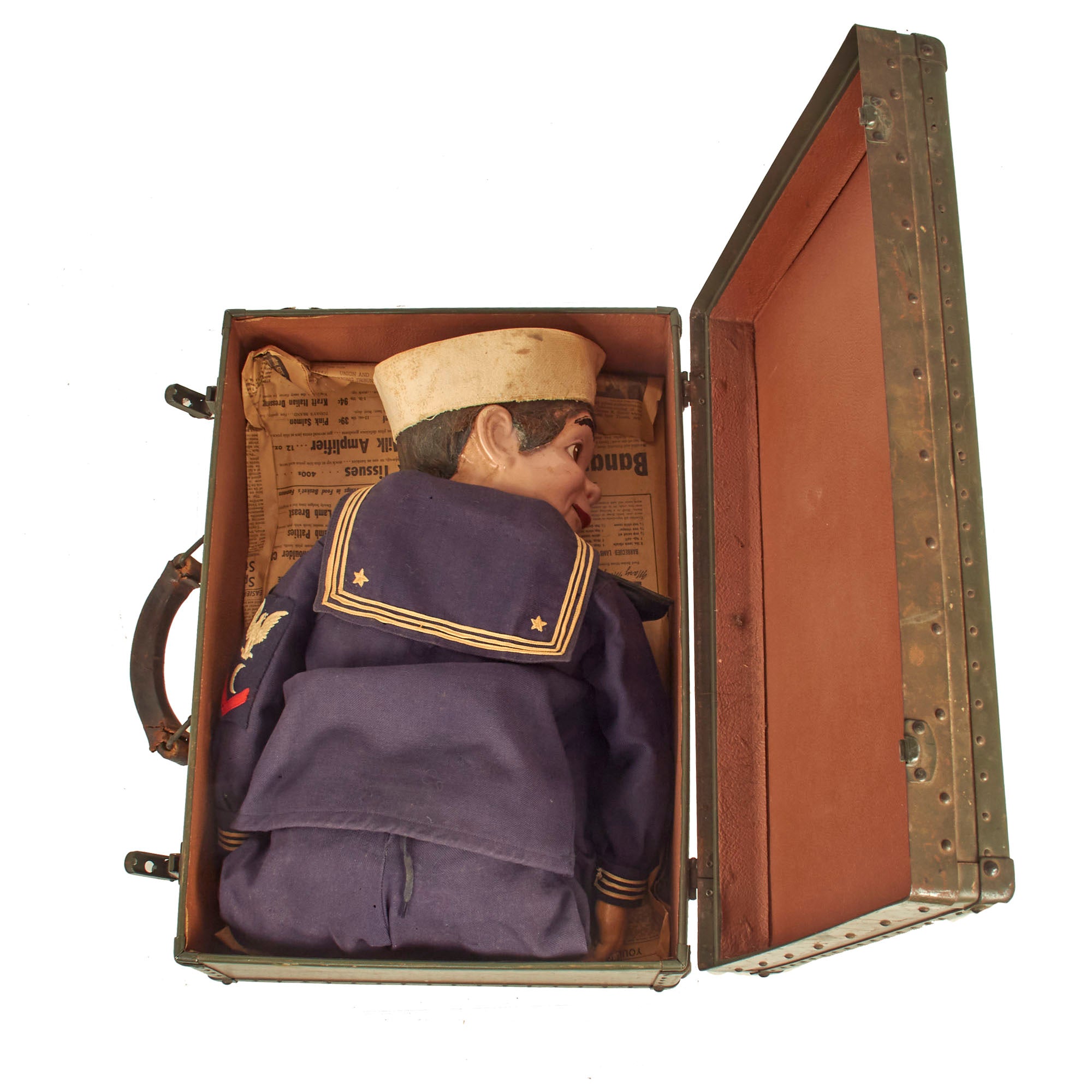 Original item: One-of-a-kind. William E. Schackelford served as Chief Steward aboard the USS Teton (AGC-14) during World War Two. He was a writer, poet, lyricist, singer and a Ventriloquist. Included in this set is his original WWII manufactured Ventriloquist Dummy who is dressed in a Navy uniform with the rank of Steward 3rd Grade. The dummy or "Ventriloquist figure" is fully operational with a moving moth and head. It is constructed of mostly of wood with stuffed fabric legs and arms. It measures approximately 34 inches tall and comes in the original carry case which measures 20" x 14 1/2" x 7" and was manufactured by Hartmann as the U.S. Navy Seapack. Of particular interest is that one of the large photographs included in the photo album is of Schackelford performing on stage with this very dummy.