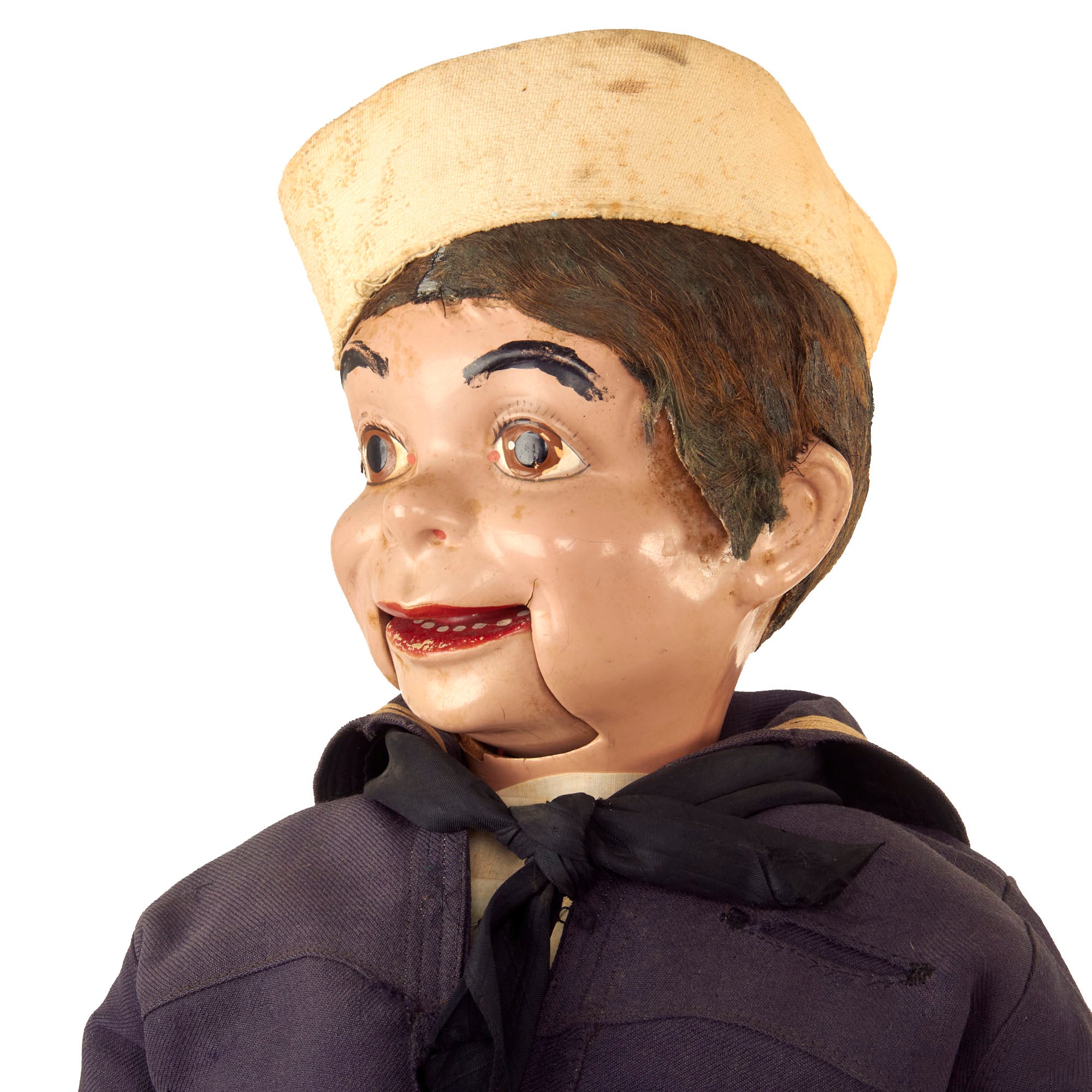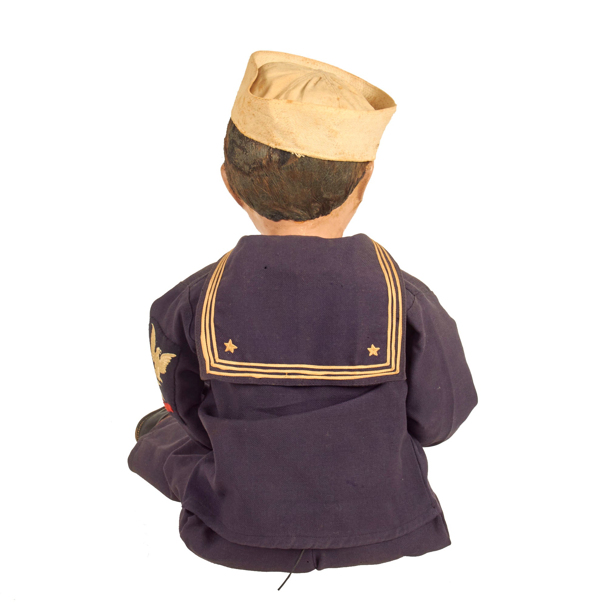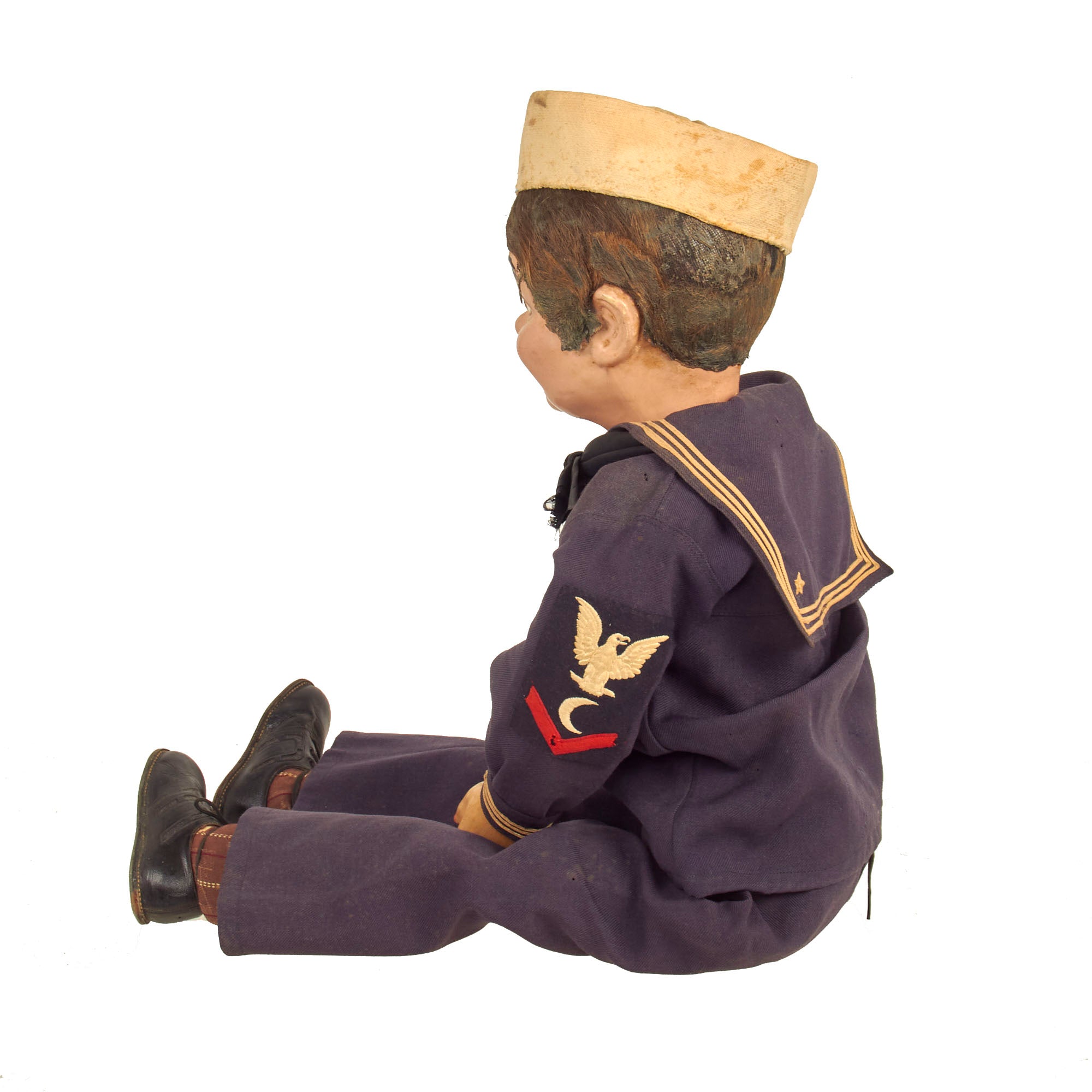 Original item: One-of-a-kind. William E. Schackelford served as Chief Steward aboard the USS Teton (AGC-14) during World War Two. He was a writer, poet, lyricist, singer and a Ventriloquist. Included in this set is his original WWII manufactured Ventriloquist Dummy who is dressed in a Navy uniform with the rank of Steward 3rd Grade. The dummy or "Ventriloquist figure" is fully operational with a moving moth and head. It is constructed of mostly of wood with stuffed fabric legs and arms. It measures approximately 34 inches tall and comes in the original carry case which measures 20" x 14 1/2" x 7" and was manufactured by Hartmann as the U.S. Navy Seapack. Of particular interest is that one of the large photographs included in the photo album is of Schackelford performing on stage with this very dummy.