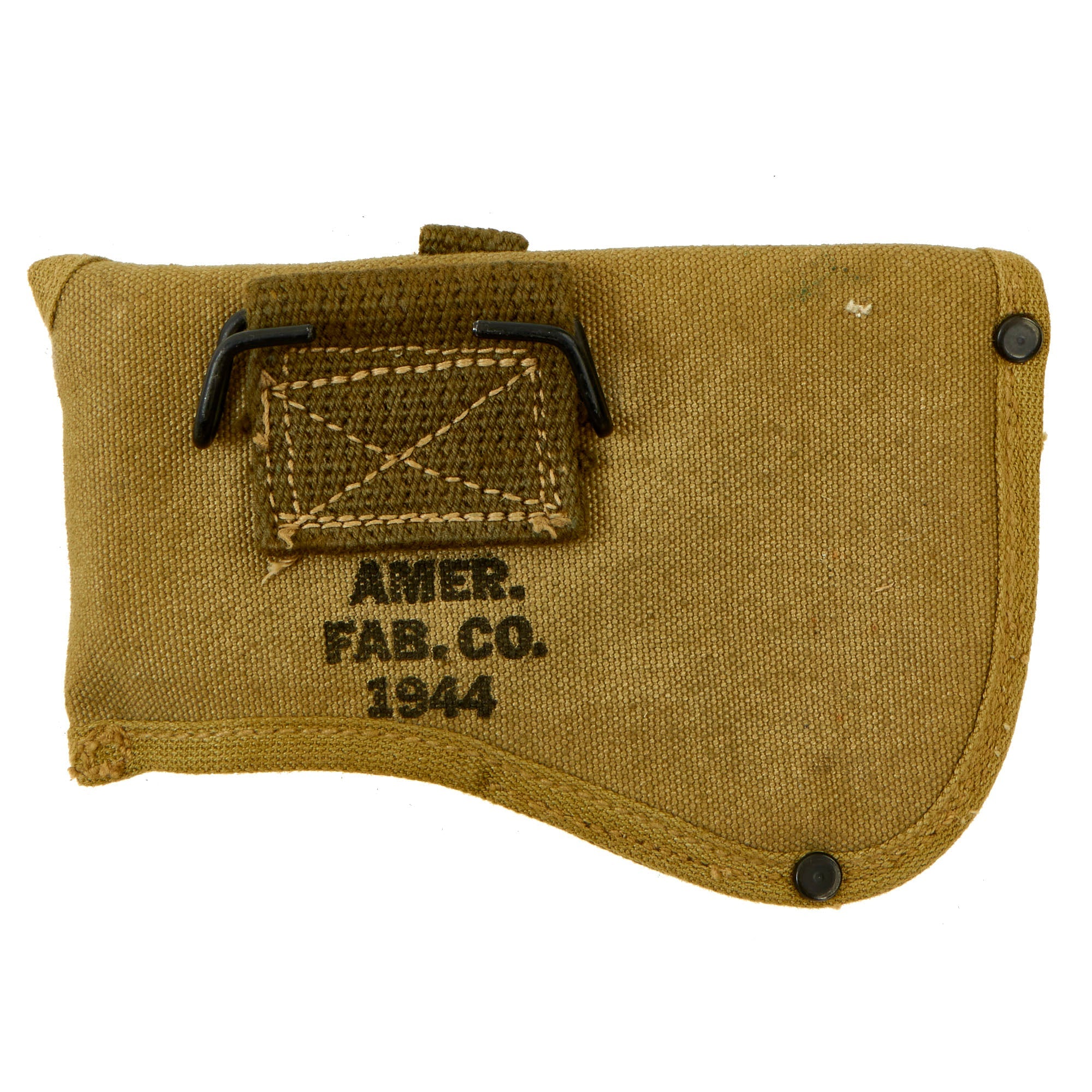 The canvas carry case is also in excellent, unissued condition with clear bold markings. The front cover is marked with the correct U.S. while the back side retains full manufacture information; AMER. FAB. CO. 1944. The buckle and belt loop retain nearly all of the original black paint with only a minor blemish present on the loop though buckle.