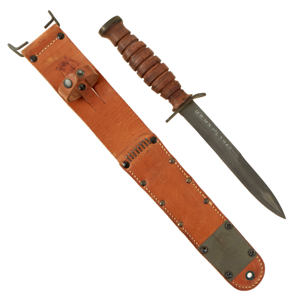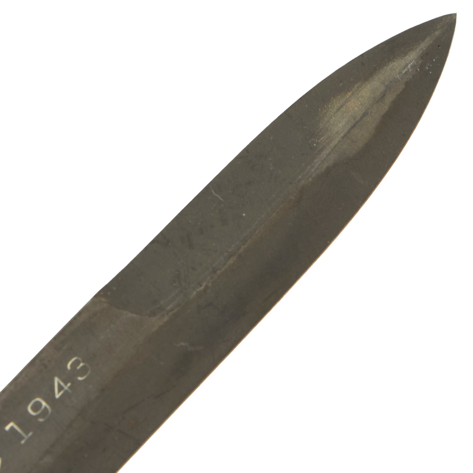 These fighting knives were preferred by American infantry during World War Two for hand to hand combat. This knife is very early production, indicated by the maker information being stamped directly on the blade: U.S. M3 - PAL 1943. The 6 1/2 inch spear point blade is in very good unused condition, with all of the original finish present.