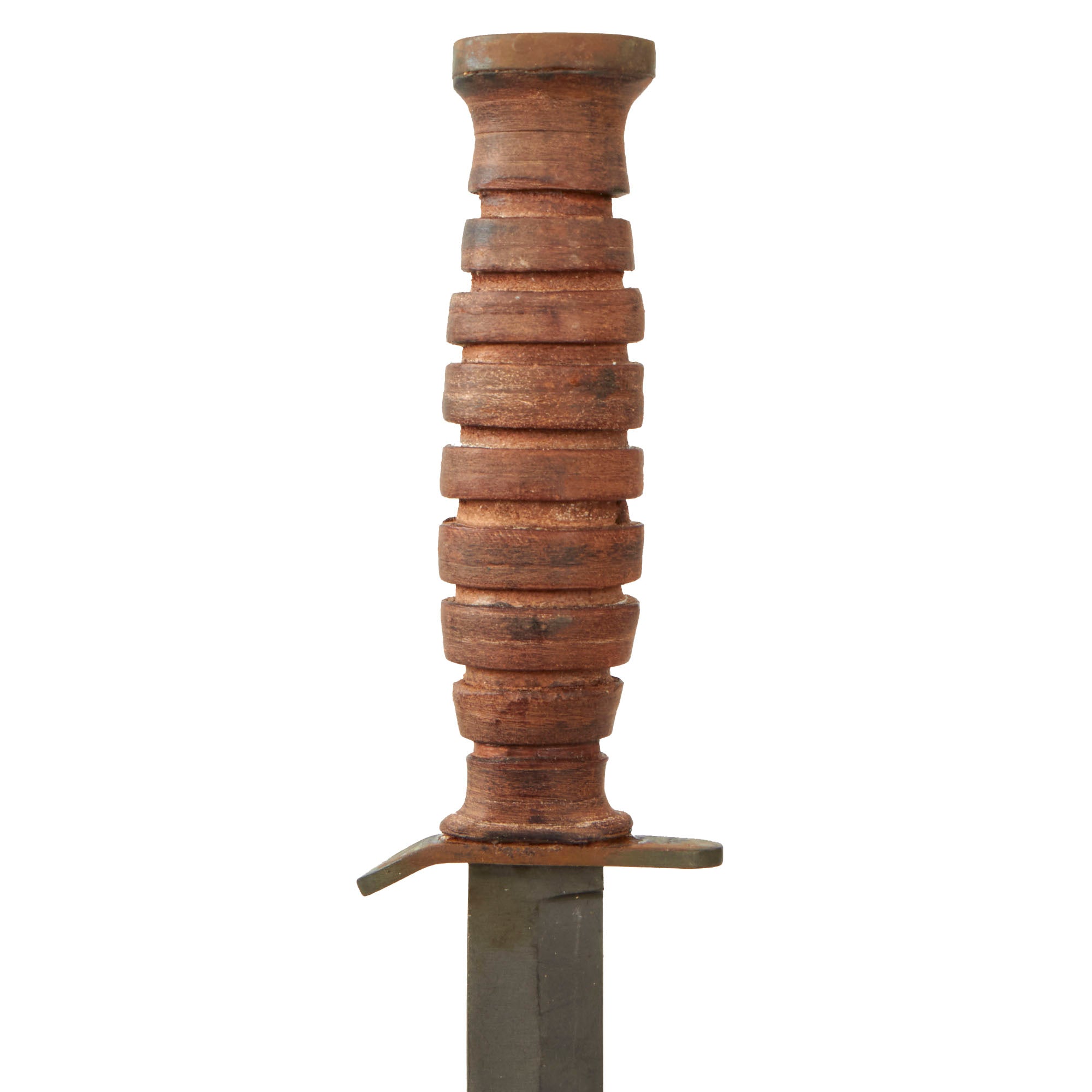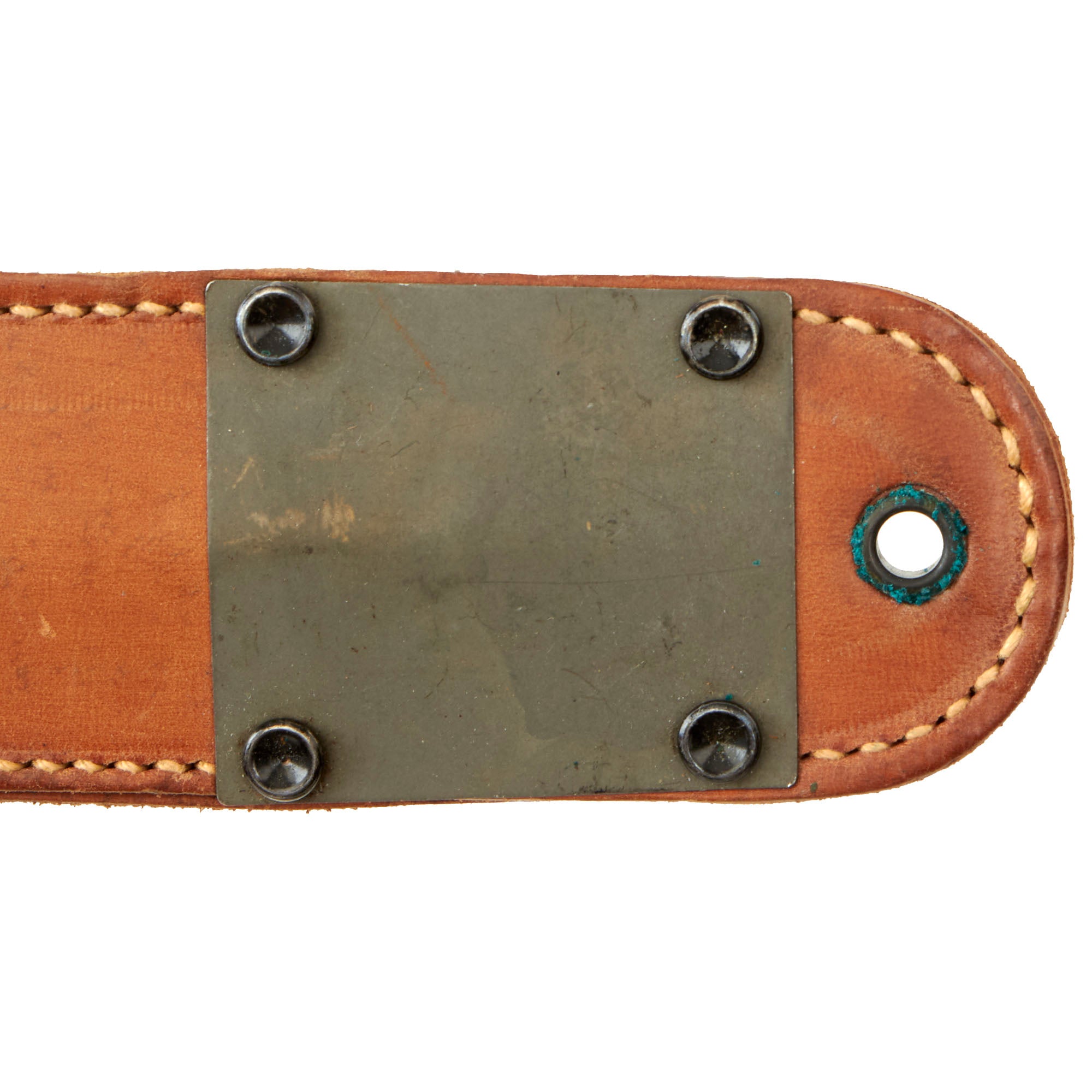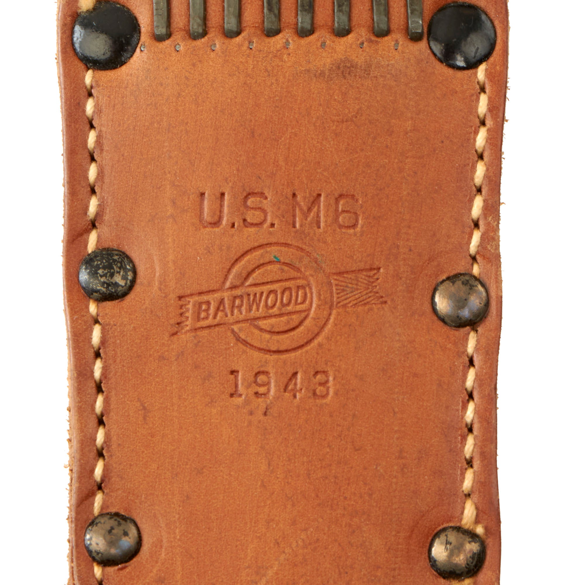 The original M6 leather scabbard is in great shape, and still clearly marked U.S. M6 / BARNWOOD / 1943 just under the stapled throat. The scabbard leather is a nice gently aged brown, with no cracking or major staining.