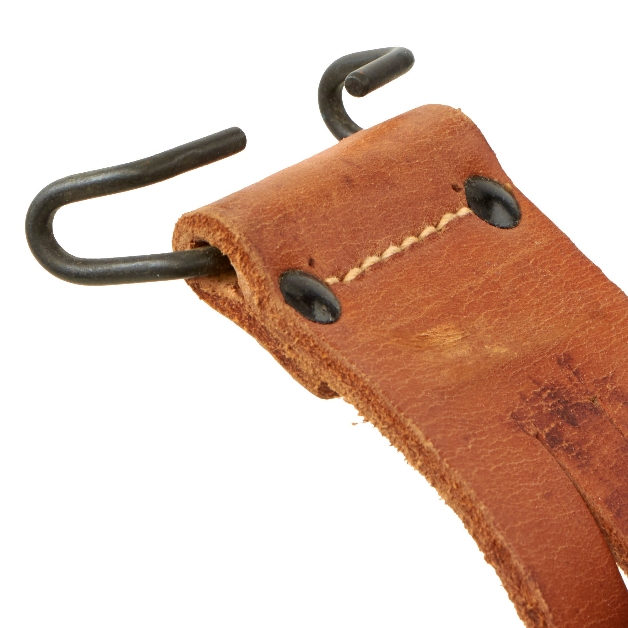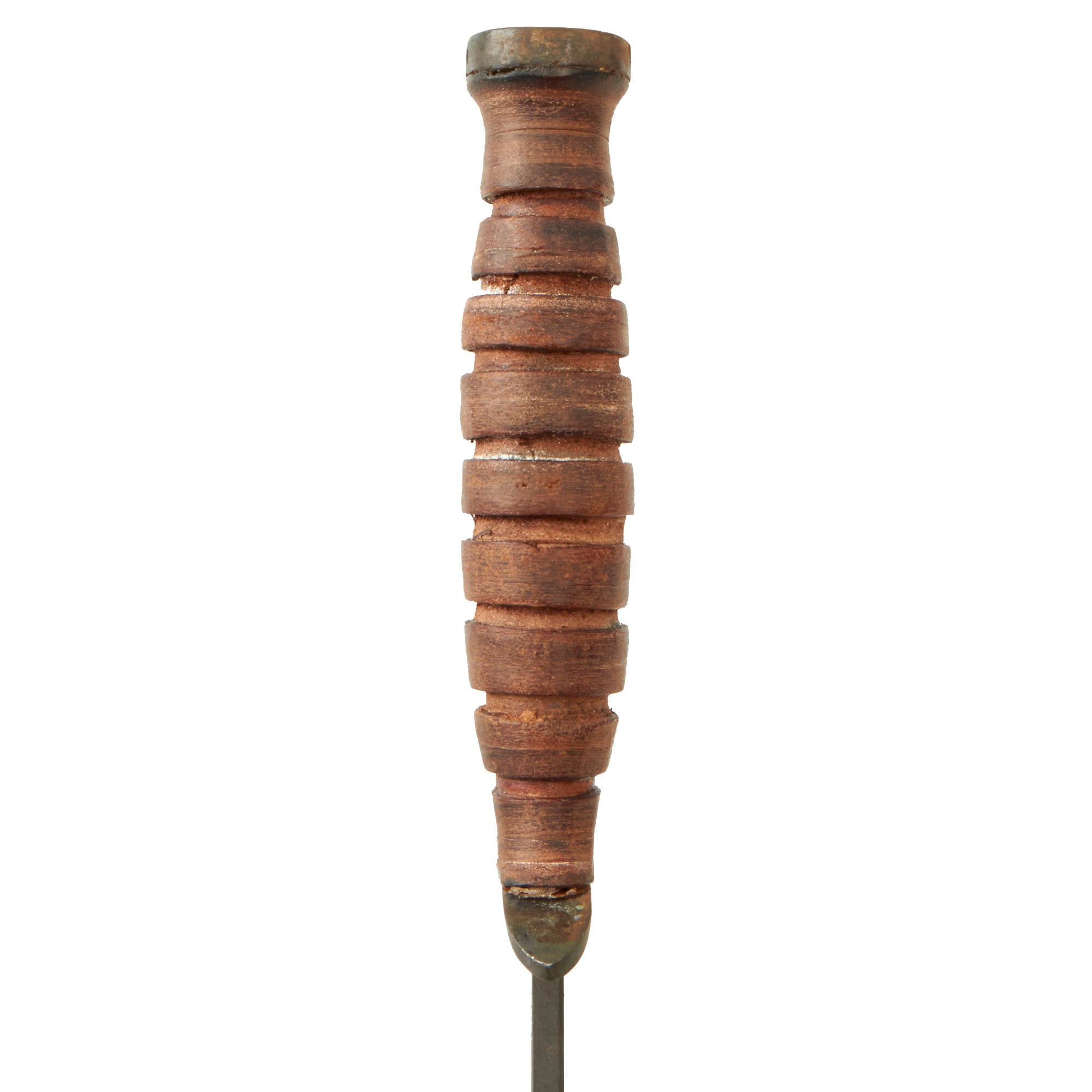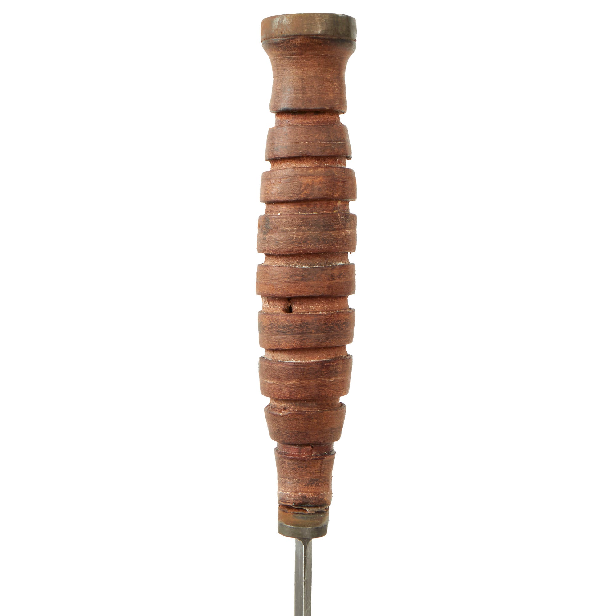 The original M6 leather scabbard is in great shape, and still clearly marked U.S. M6 / BARNWOOD / 1943 just under the stapled throat. The scabbard leather is a nice gently aged brown, with no cracking or major staining.