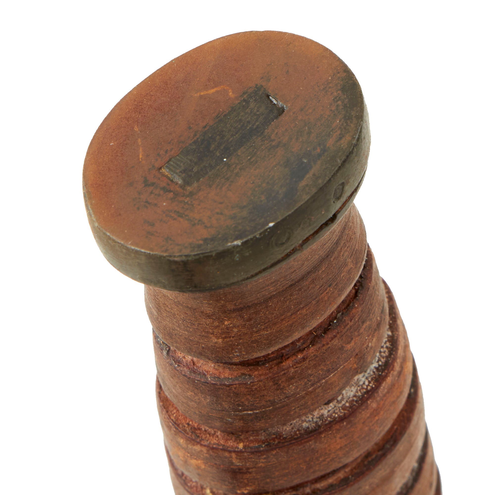 All of the rivets and staple pins holding the scabbard body together are still intact. This is the original scabbard designed for this knife, which was then replaced with the Fiberglass M8/M8A1 scabbards, which were also used with the M4 bayonet.