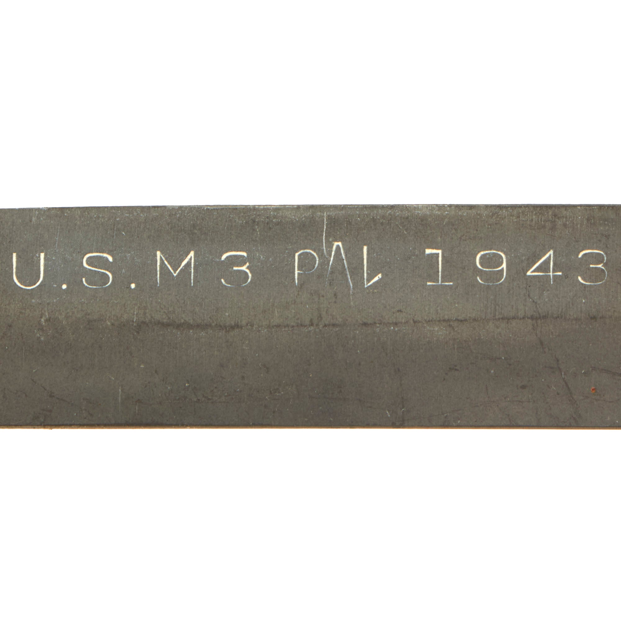 Original Item: Only One Available. This is a stunning NEW OLD STOCK condition WWII M3 U.S. fighting knife, made by the desirable maker, PAL Cutlery. With the marking on the blade, this is the more desirable "2nd Pattern", which was replaced quickly by the 3rd pattern with markings on the crossguard. It comes complete in a correct 1943 dated M6 leather belt scabbard, which is also in near mint condition. A collector cannot upgrade from this M3 knife.