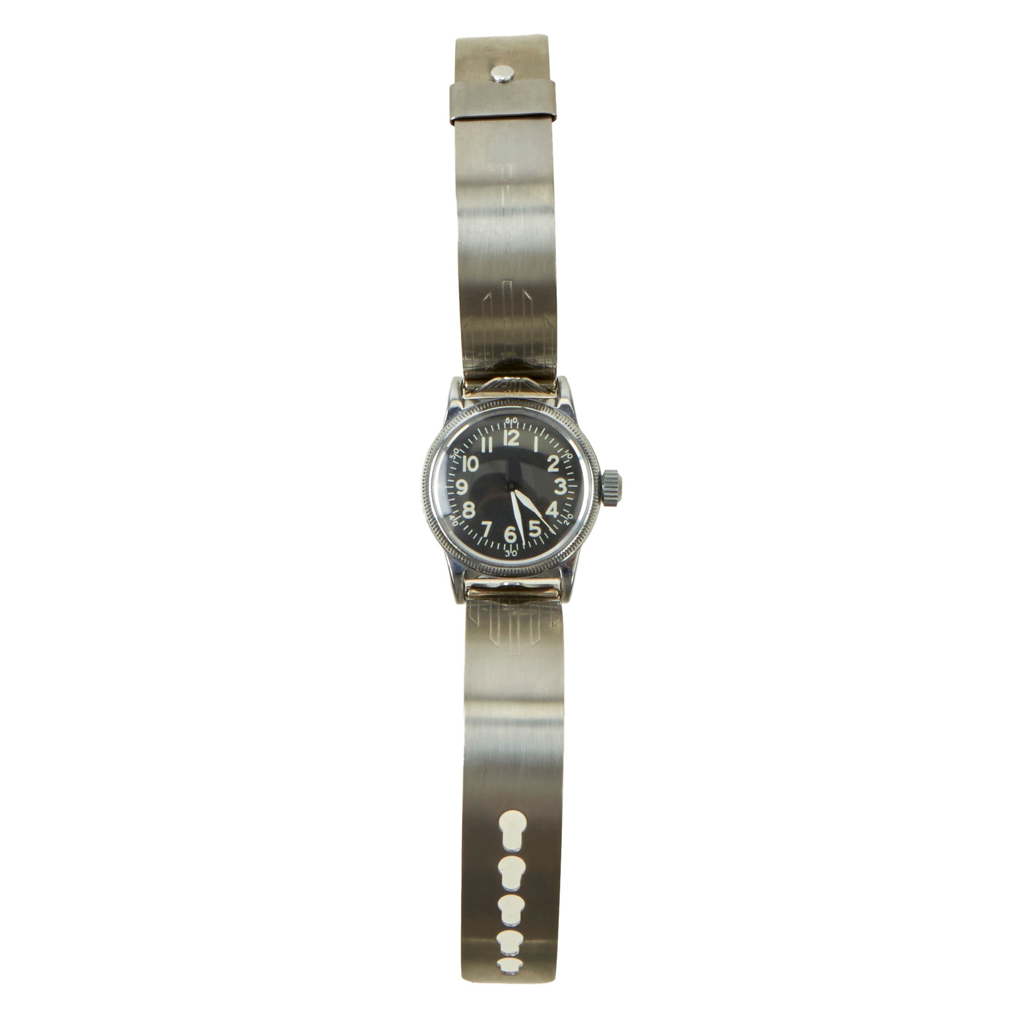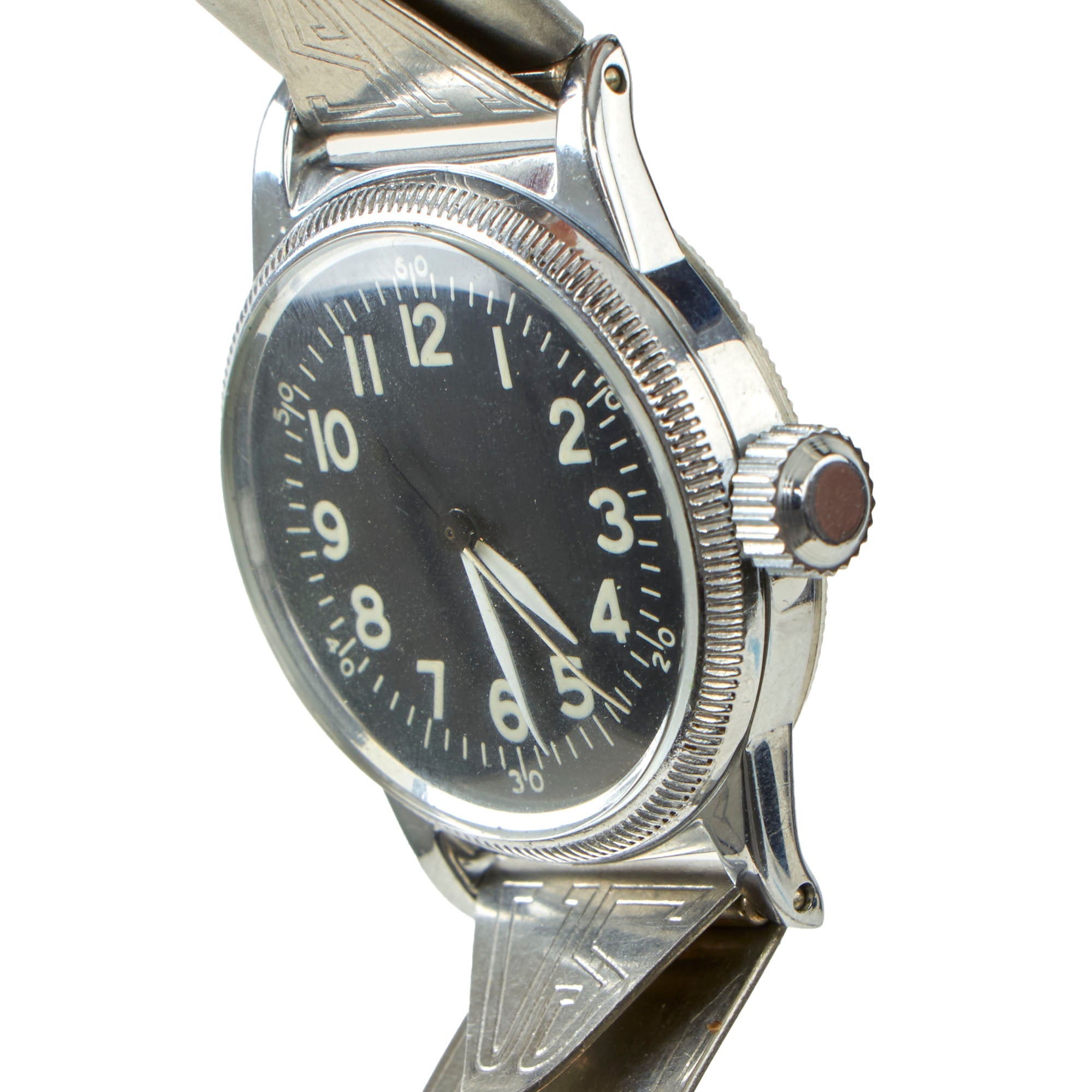 Original Item: Only One Available. This is an New Old Stock condition genuine WW2 unissued 1945 dated Elgin A-11 military watch. This example has been fully cleaned, tested and runs perfectly. The watch was manufactured in 1945 for Pilots and Navigators in the US Army Air Force (USAAF). Watch case is 30mm. It features an Elgin hand-winding and hacking movement, which allowed the movement to be stopped for "watch synchronization". The band is an original (as purchased/issued) aluminum example by Berkely. It is not very often you find a mint condition unissued A-11 watch in the original configuration!