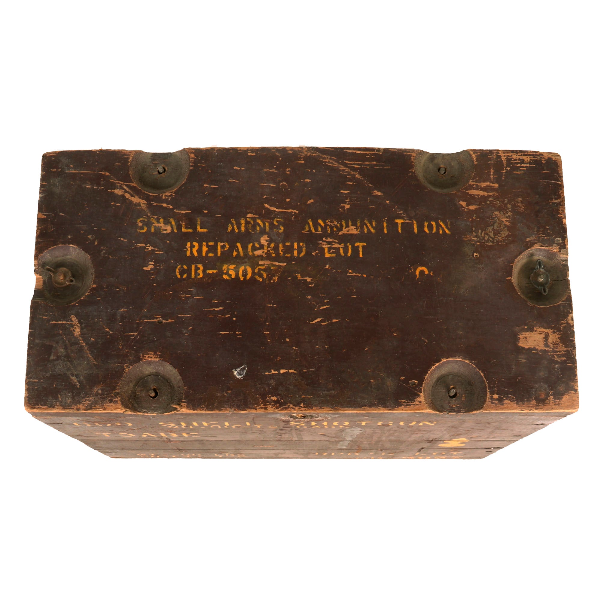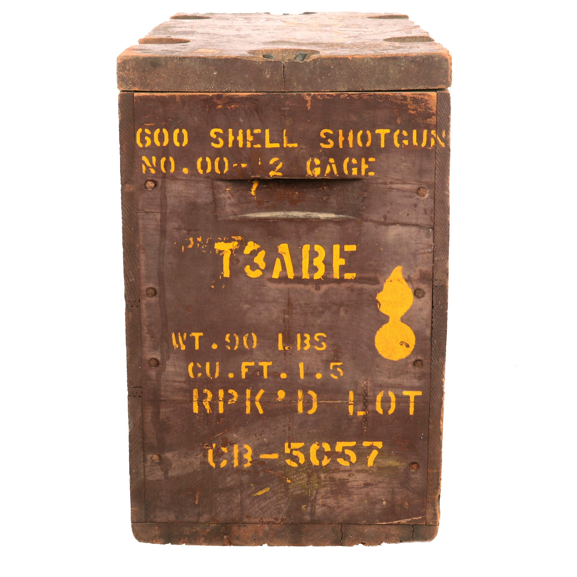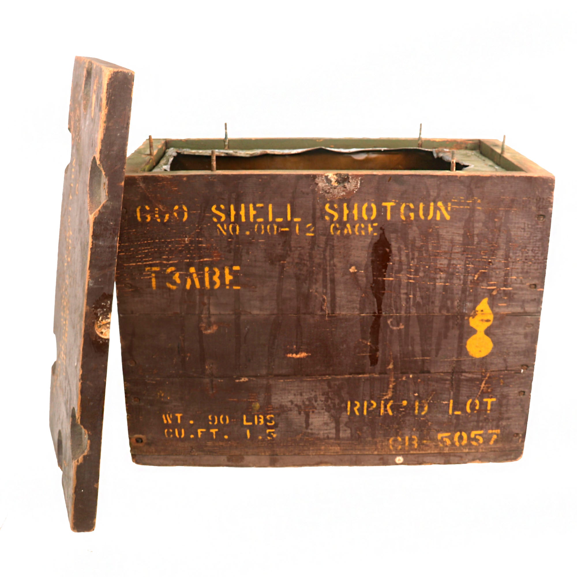 Original Item: Only One Available. This is a very nice WWII Issue "Packing box M1917" ammunition crate with a tinned steel liner for No.00 12 gauge shotgun shells, often called "Double Ought Buck" after the "00" designation. This was used in the various service shotguns used during WWII, including the venerable Winchester Model 1897, Winchester Model 12, Ithaca Model 37, and others. The front of the crate still bears the original packing information from when it was repacked:
