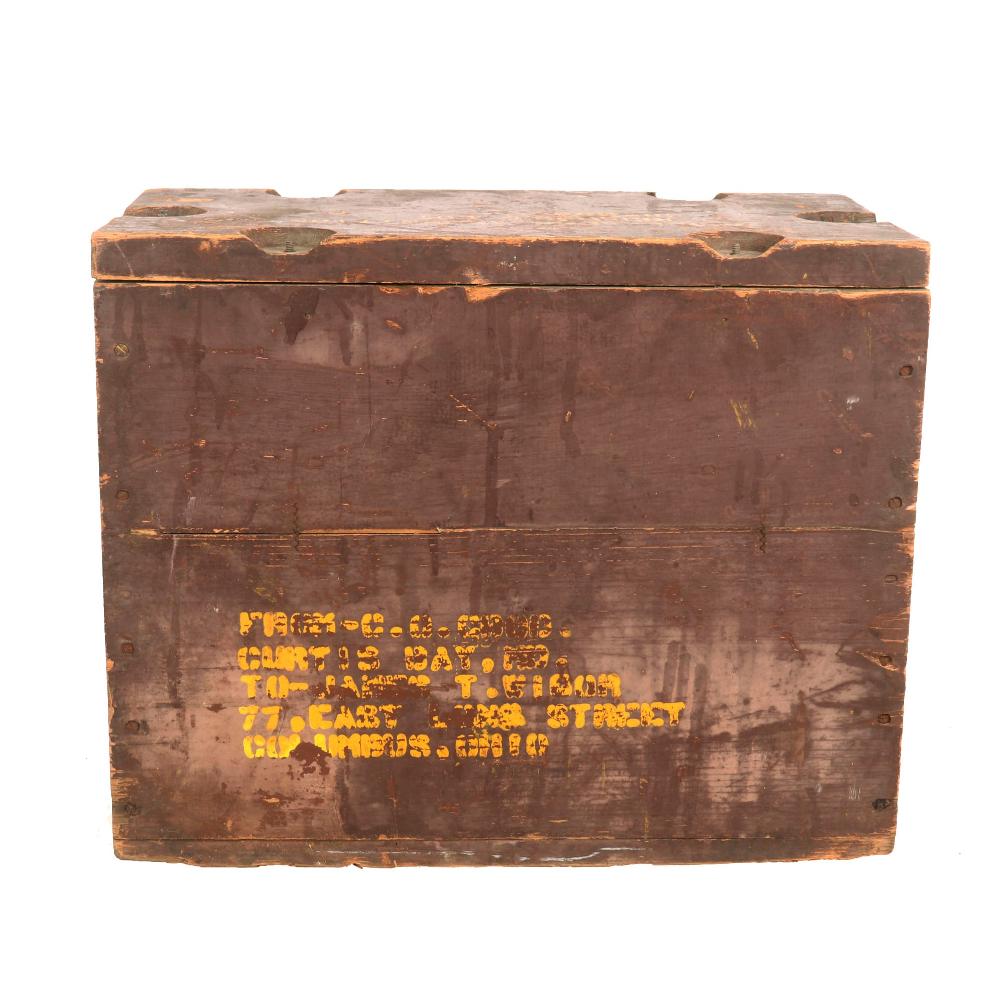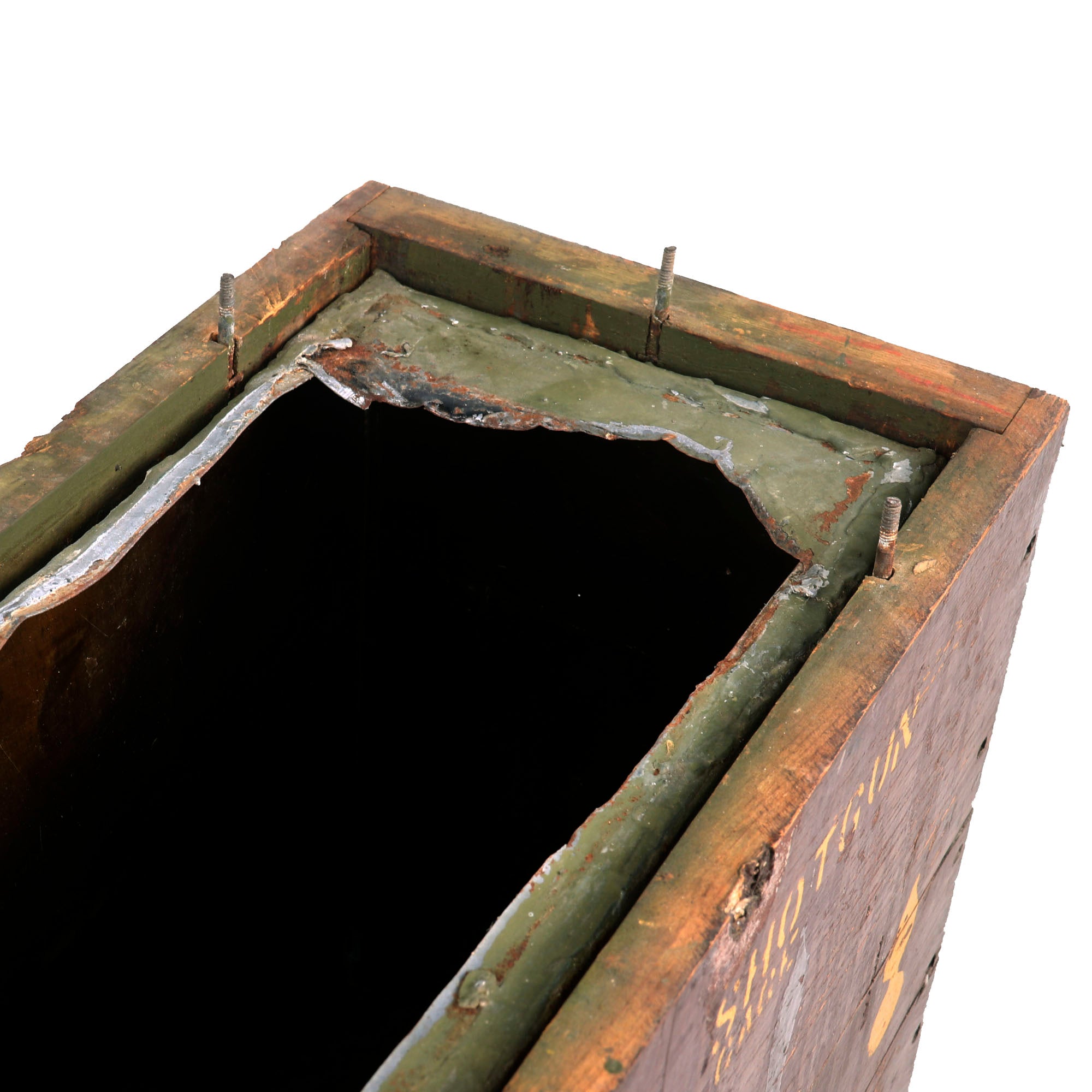 The right side of the box has the exact same information stenciled, and there is also shortened version of this on the lid of the box under SMALL ARMS AMMUNITION. THe lid also has a matching lot number, indicating that it is the ORIGINAL LID. The crate measures approximately 18"W × 14 ½"H × 9 ½"D, and is constructed using rabbet joint corners. It is painted brown, indicating mid war production, with the markings stenciled in yellow, and bears the ordnance "flaming bomb" on the front and right sides. The interior steel liner is in good condition, and cannot currently be removed. The top was removed when it was opened long ago.