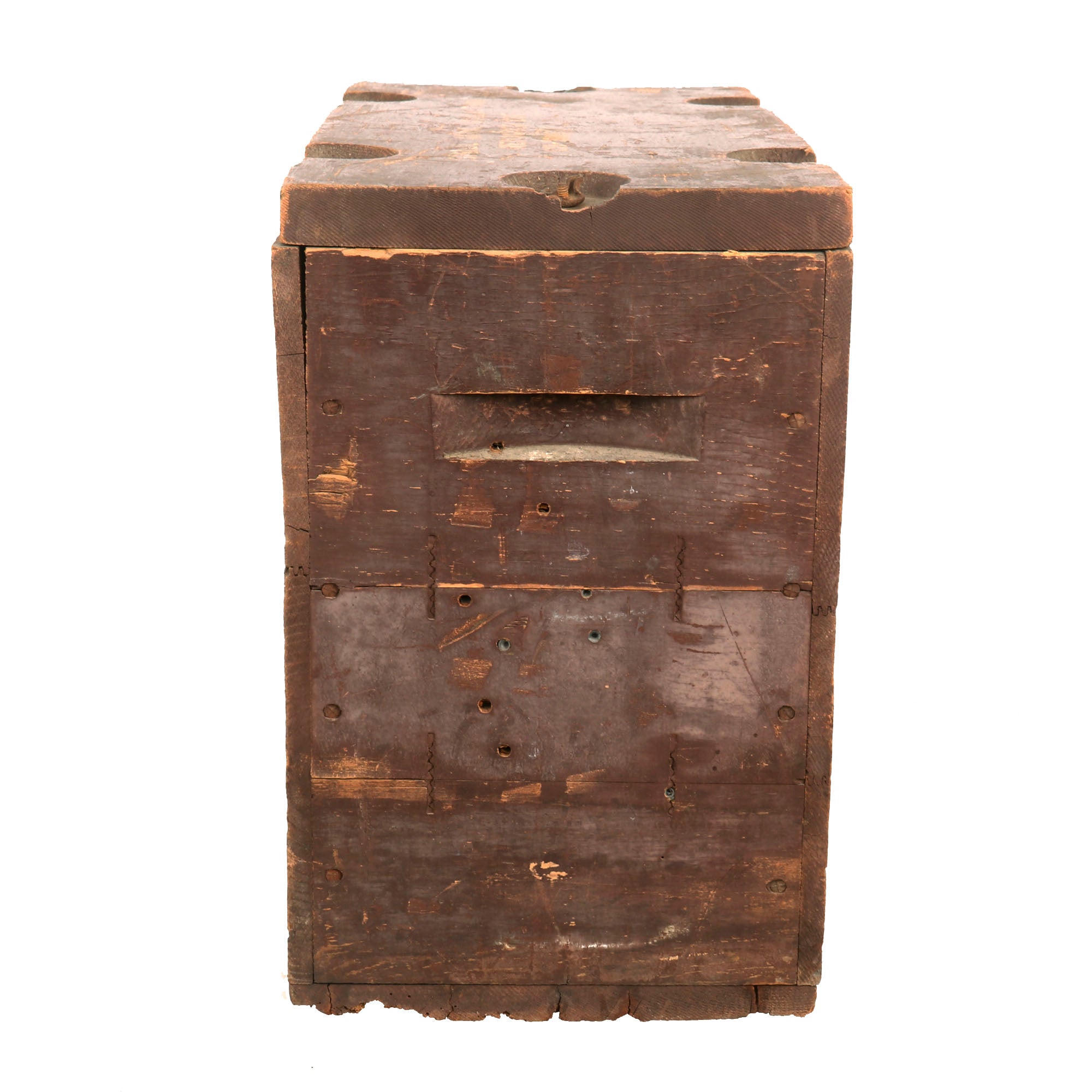 Overall condition is very good, showing wear commensurate with age and service. It still retains all of the threaded posts on the top to attach the lid, and even still has two of the original wing nuts! Also, as shown clearly in the pictures, the crate is empty.