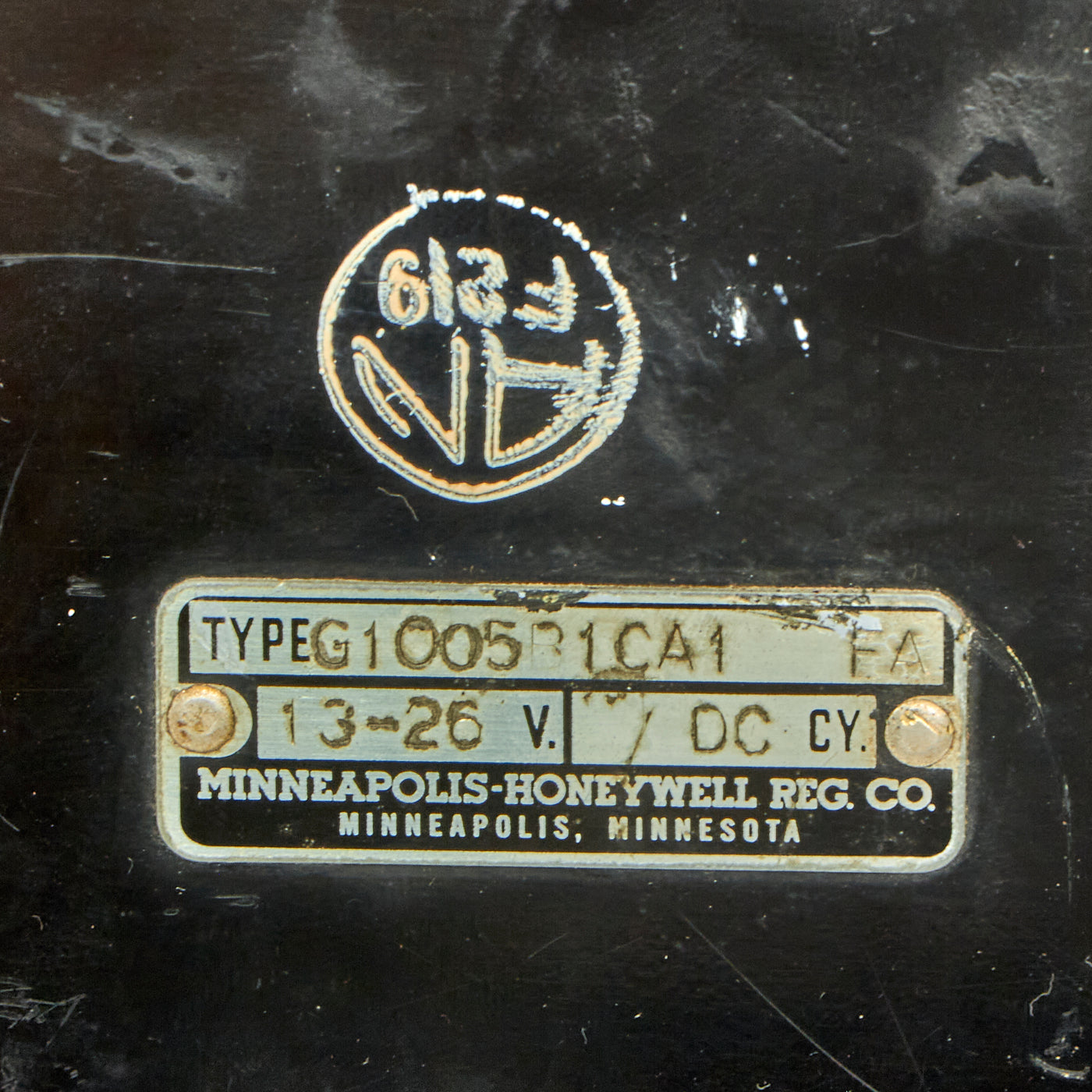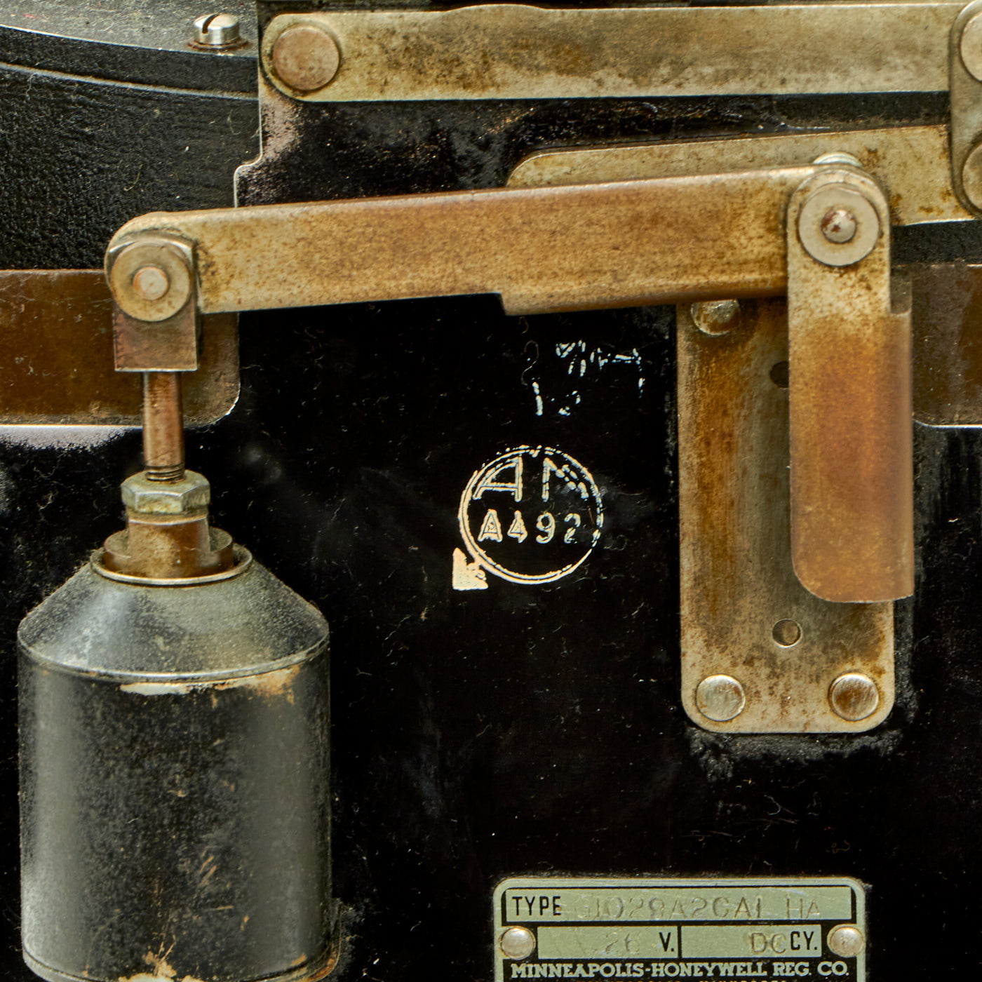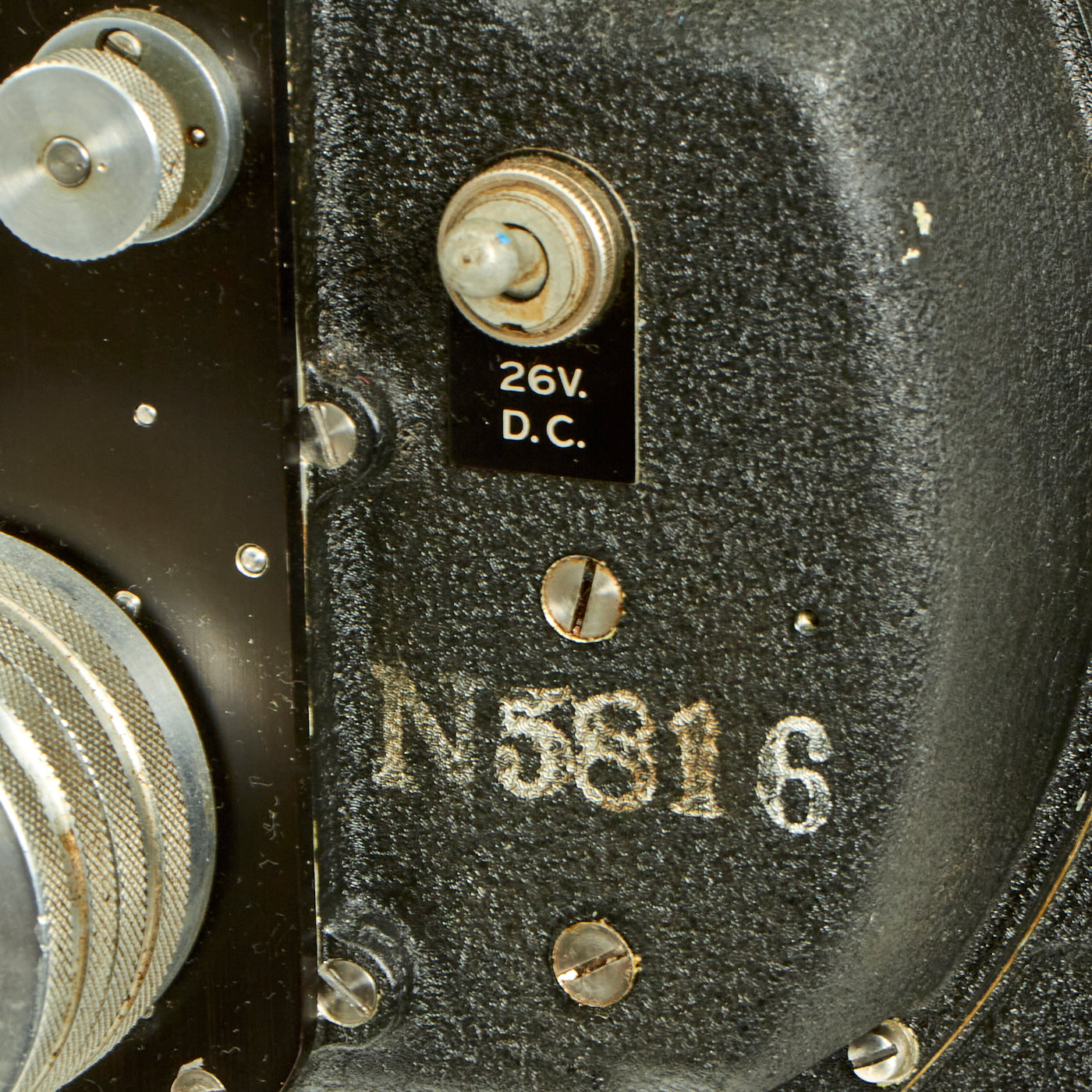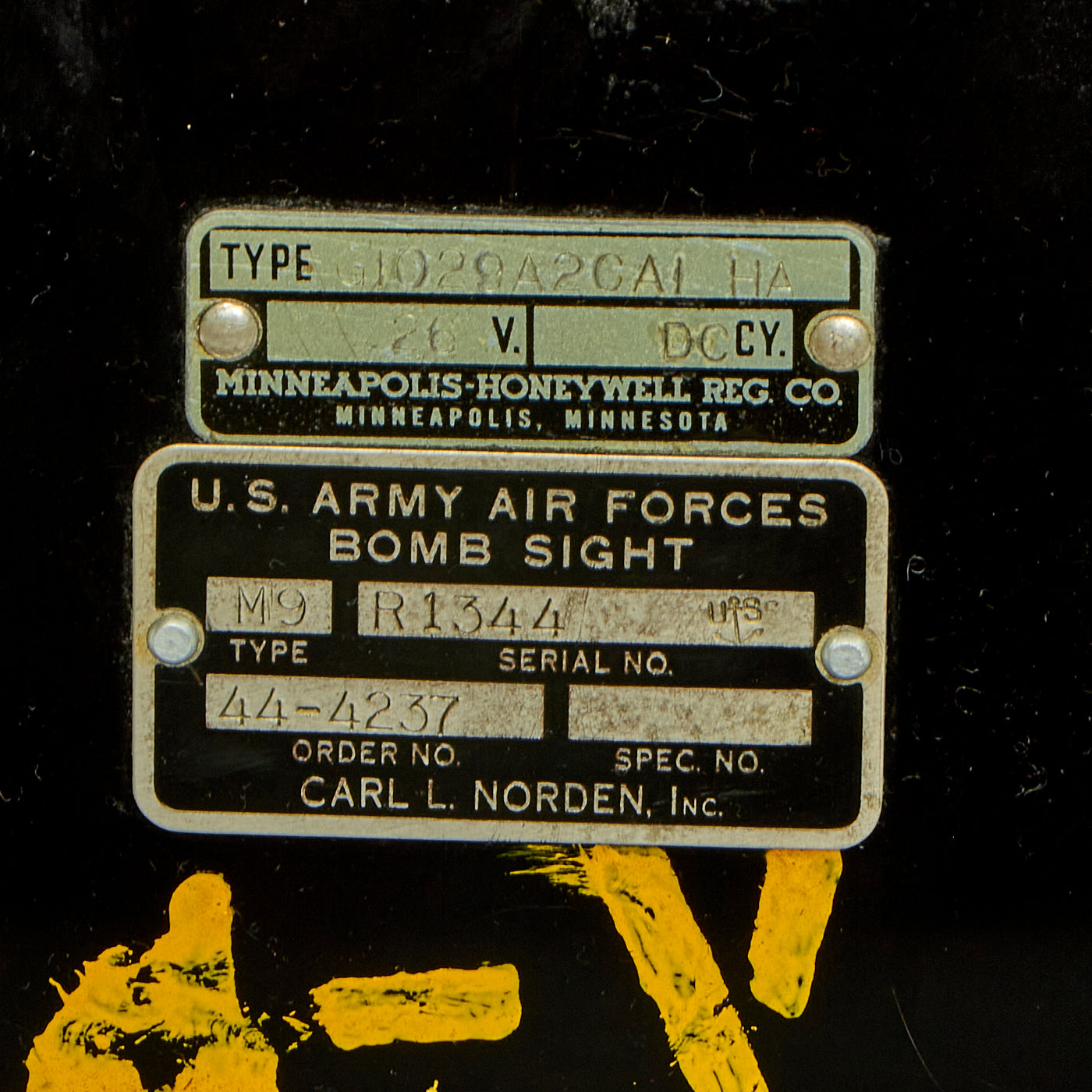 The sight is attached to the top of a USAAF marked Stabilizer / Autopilot, which normally already be attached to the mechanical and electrical hookups at the bombadier / chin turret station in the bomber. The stabilizer was manufactured by subcontractor MINNEAPOLIS-HONEYWELL REG. CO., as indicated by the data plate. Below this is the U.S. Army Air Forces data plate, marked with serial number R1344 and a 1944 contract date. It is marked at the bottom of the plate by CARL. L NORDEN, and also has the U (Anchor) S Navy inspection marking, so while it is a USAAF order, it was used by the U.S. Navy and bears their inspection marking. It is mounted on the carrier used to load it into the bomber and store it when not installed.
