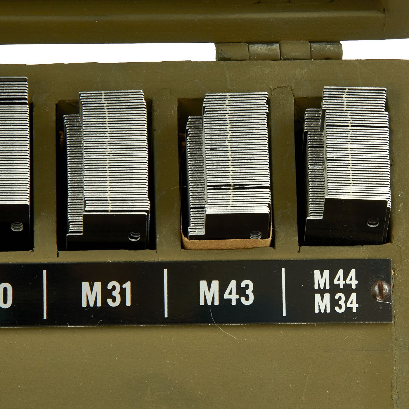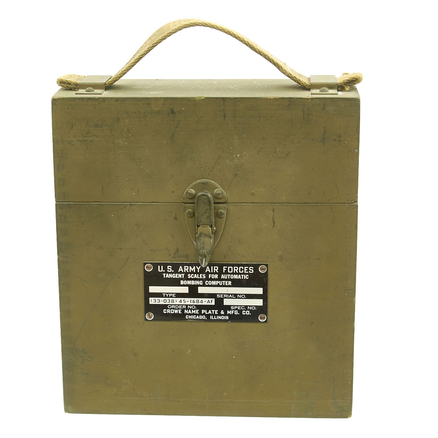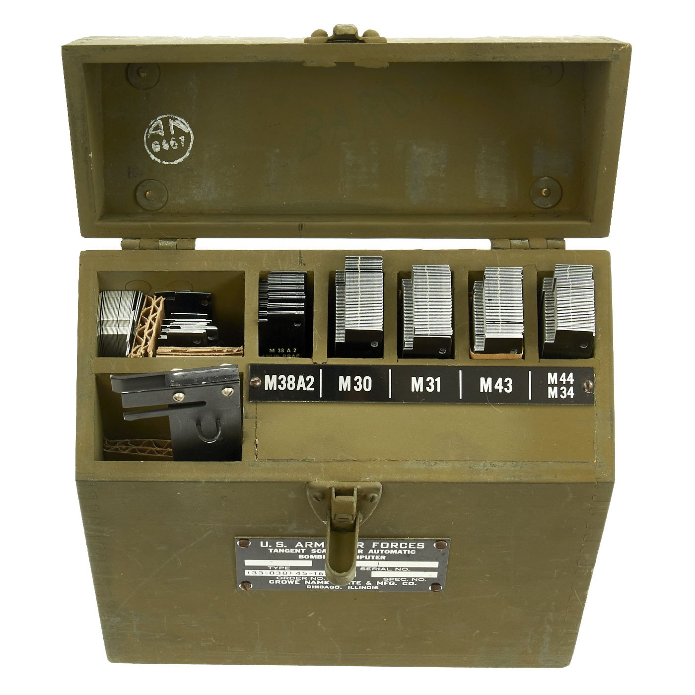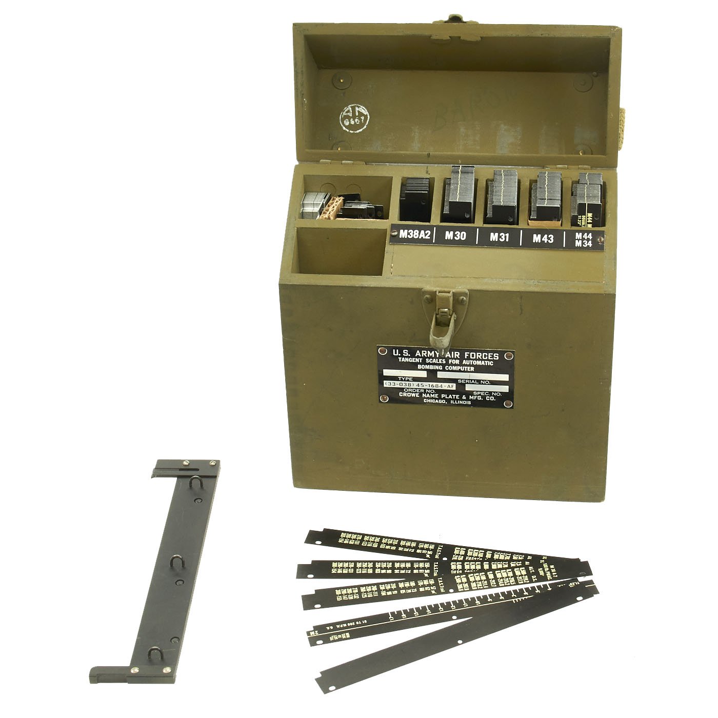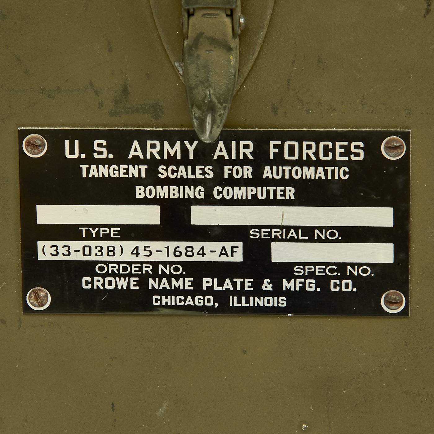 Original Item: Only One Kit Available. This is a genuine WWII issue set of USAAF Tangent Scales for Automatic Bombing Computer, in excellent nearly unissued condition in the original case. As far as we can tell, the set appears to be complete, and was never marked with a Type or Serial number for the Bombing computer it was to be matched to, further suggesting that it is unissued.