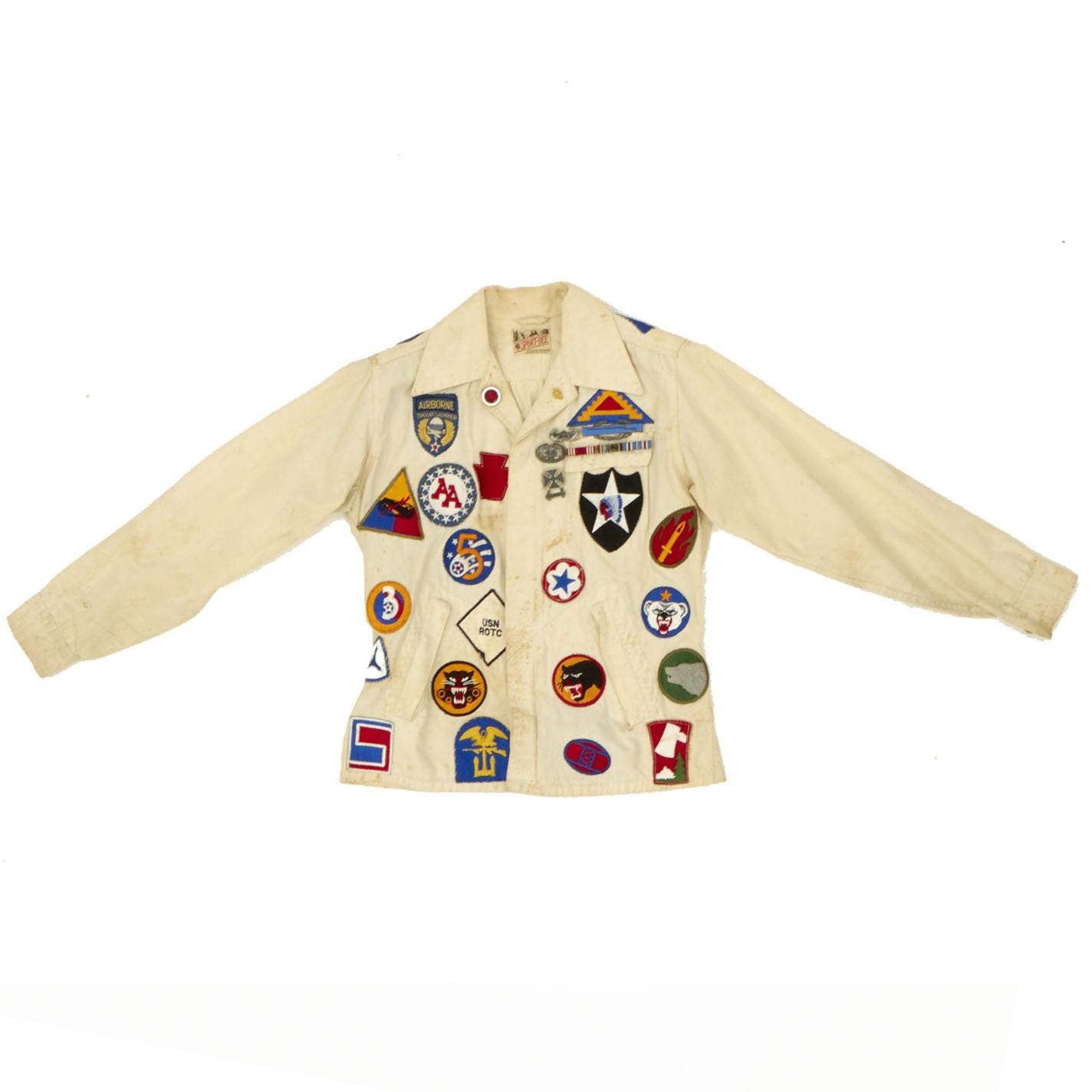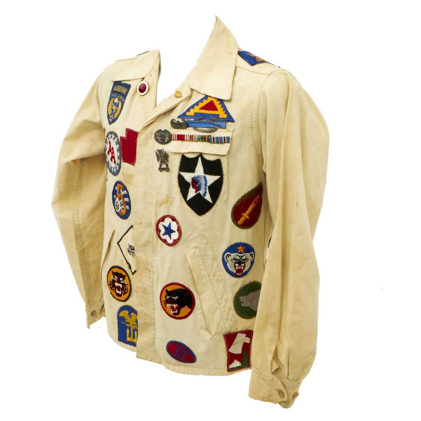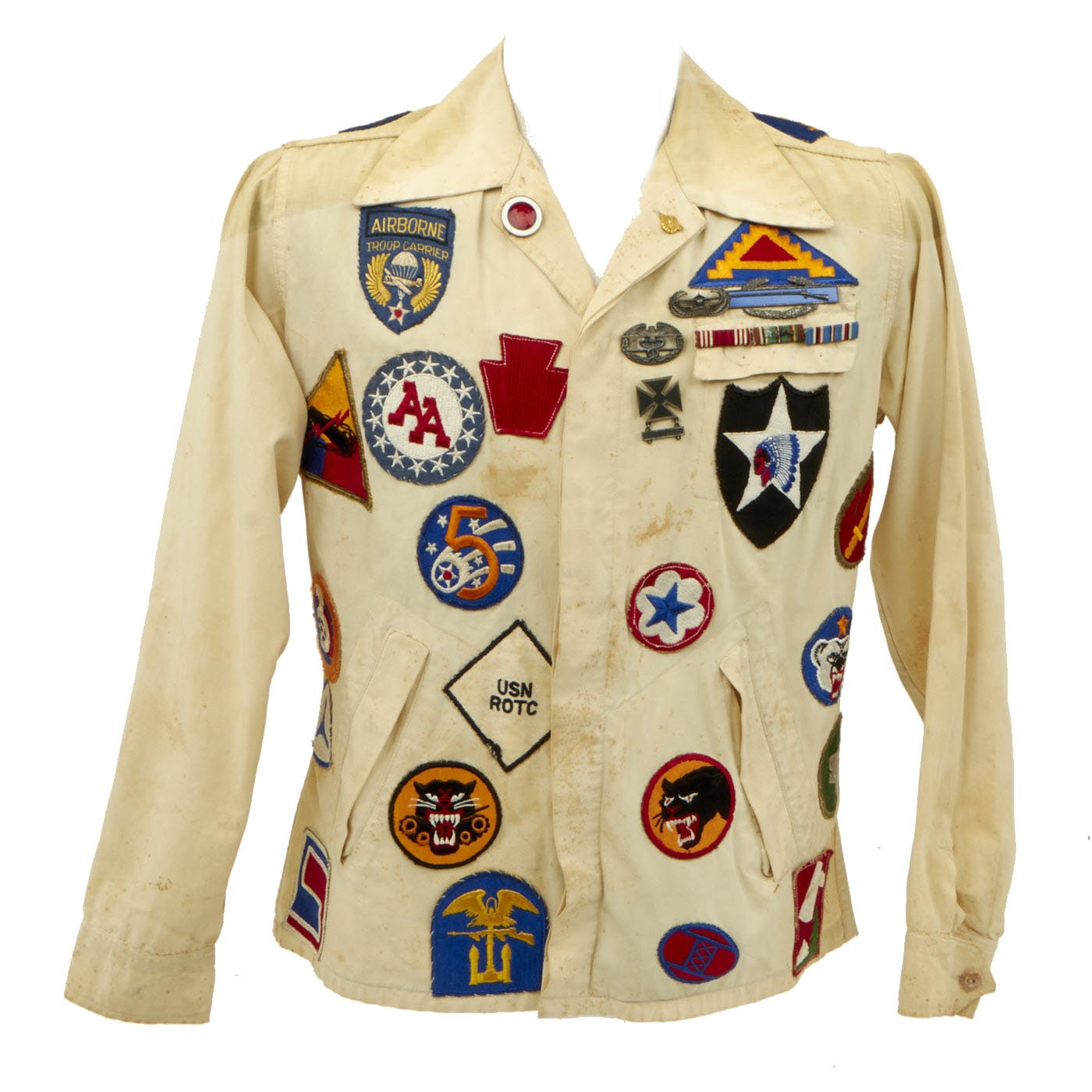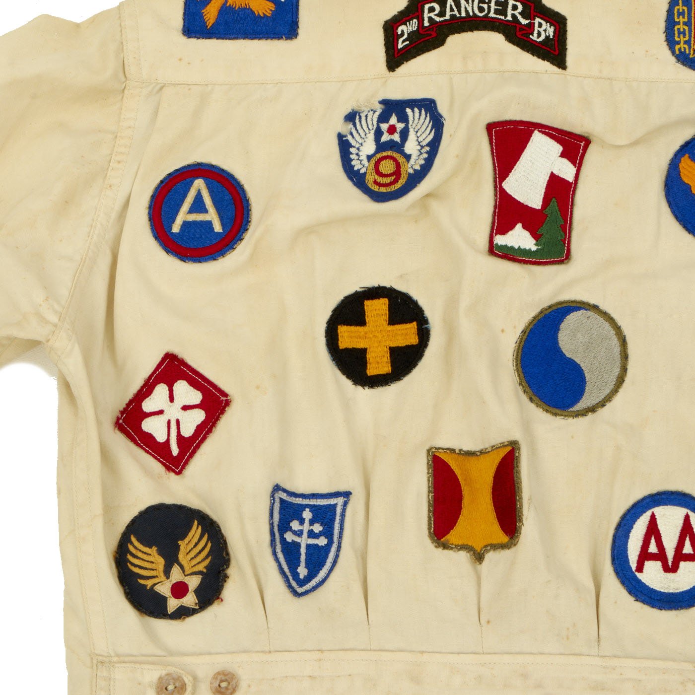 Original Item: One-of-a-kind. This is a civilian made "Sport-dee" M41 style white cotton jacket which came to us third party from the family of a World War Two Army nurse veteran who hailed from Kentucky. It has over 40 original patches stitched to it as well original pins and insignia. There are also 14 unattached patches which were stuffed into the pocket.