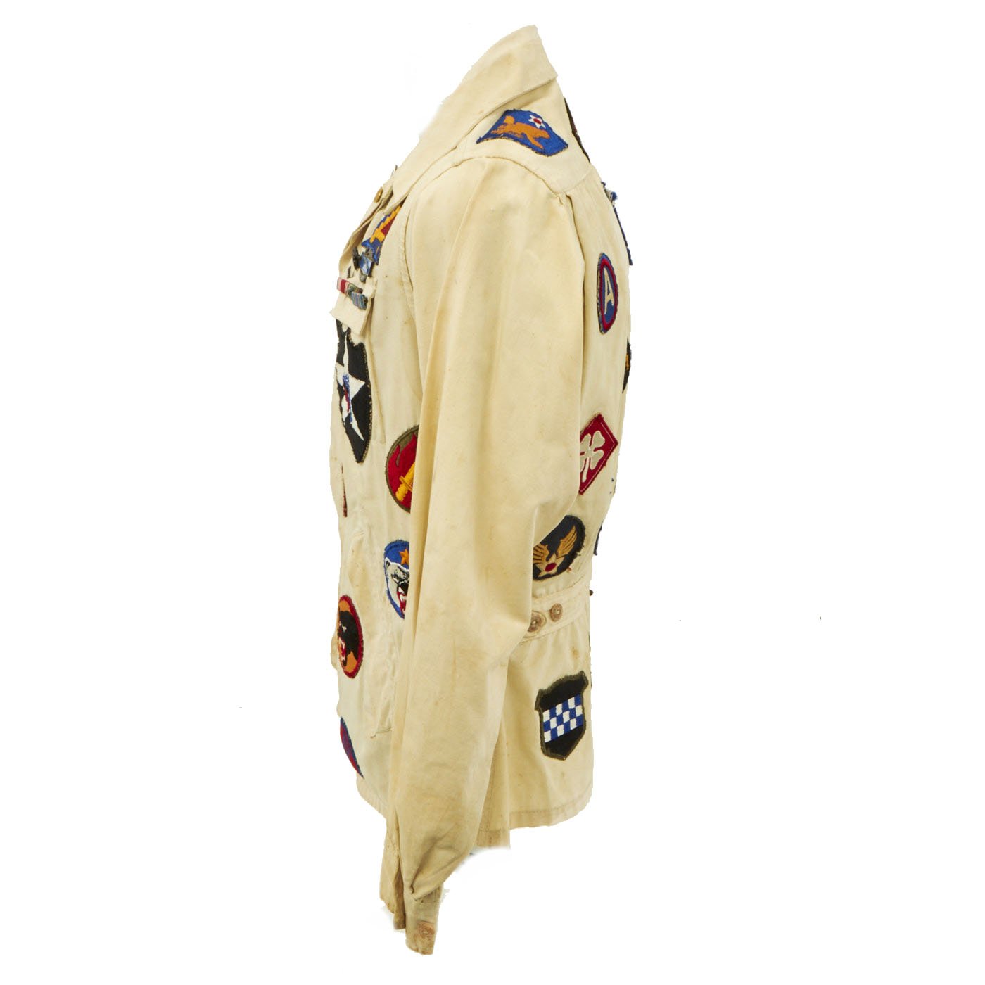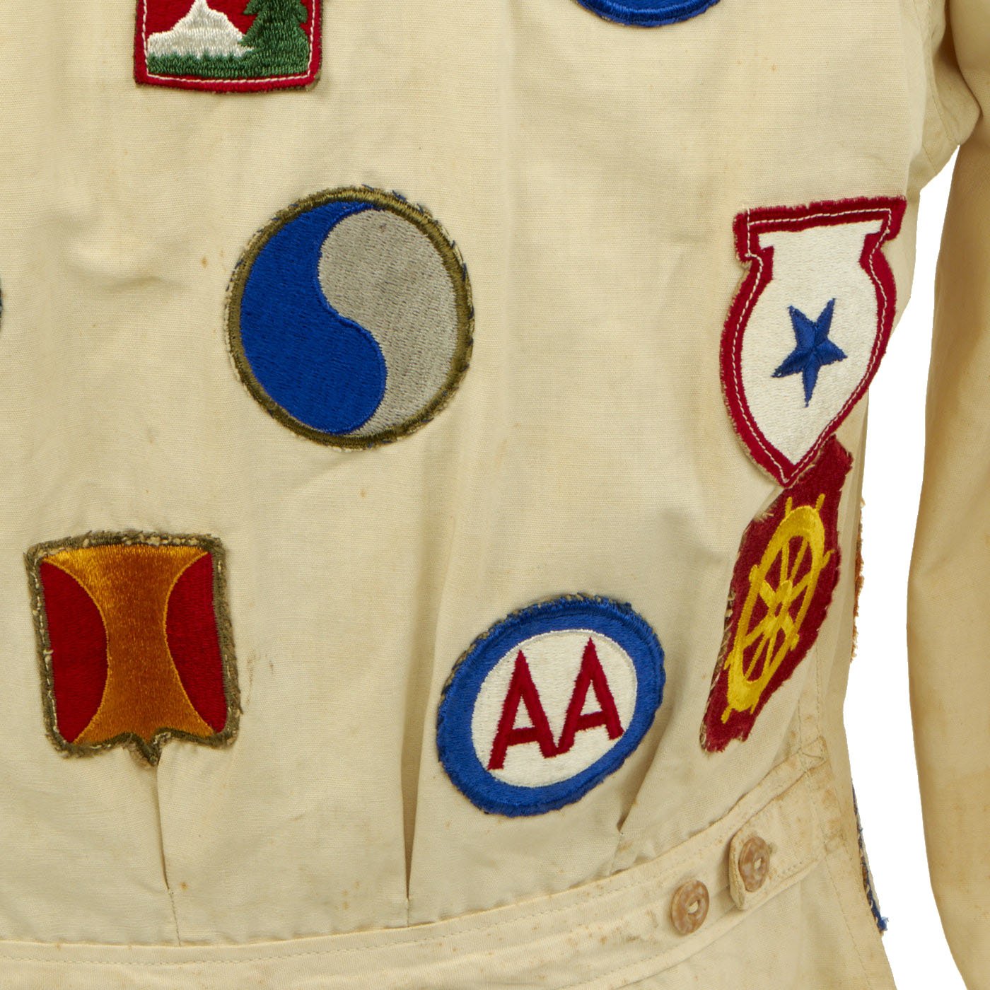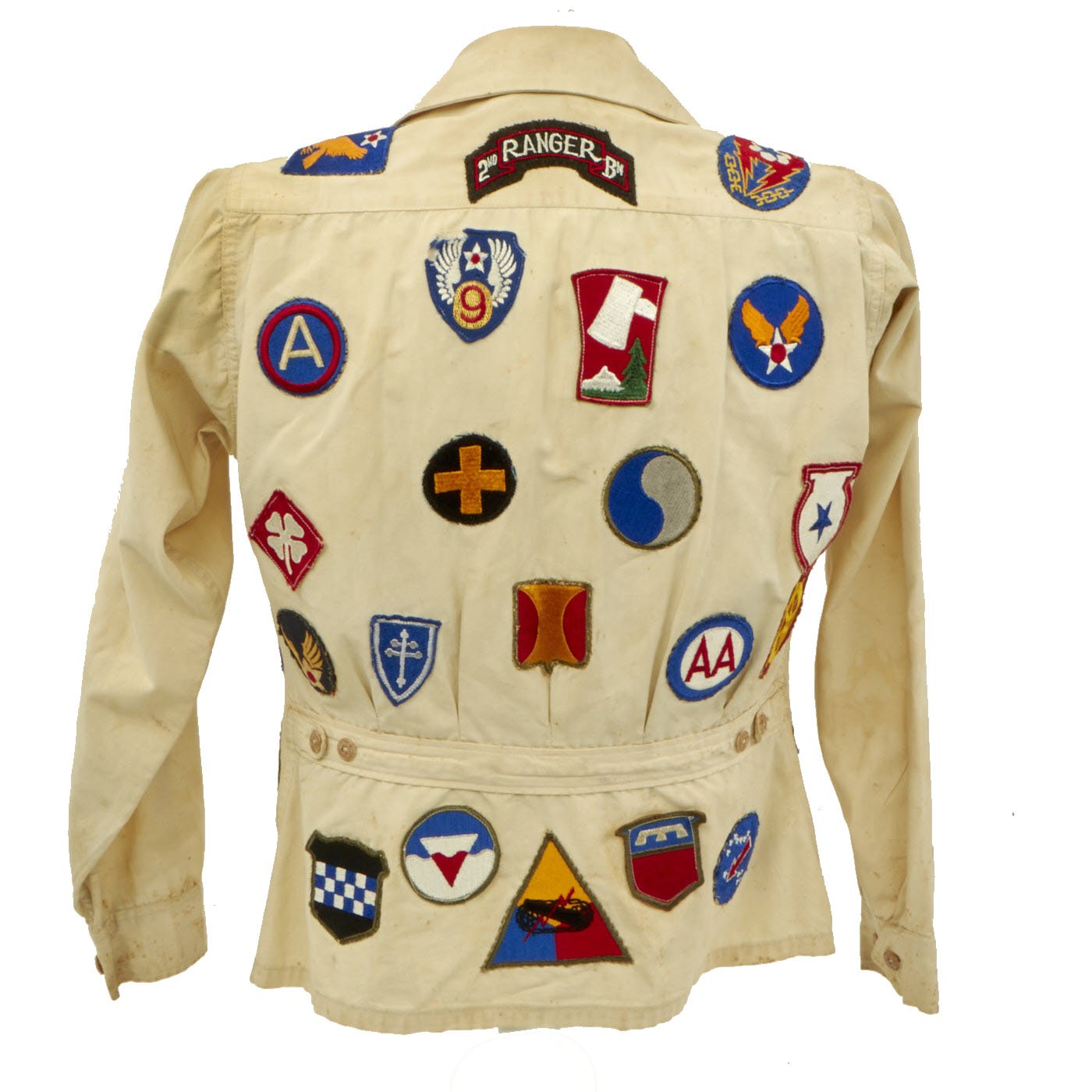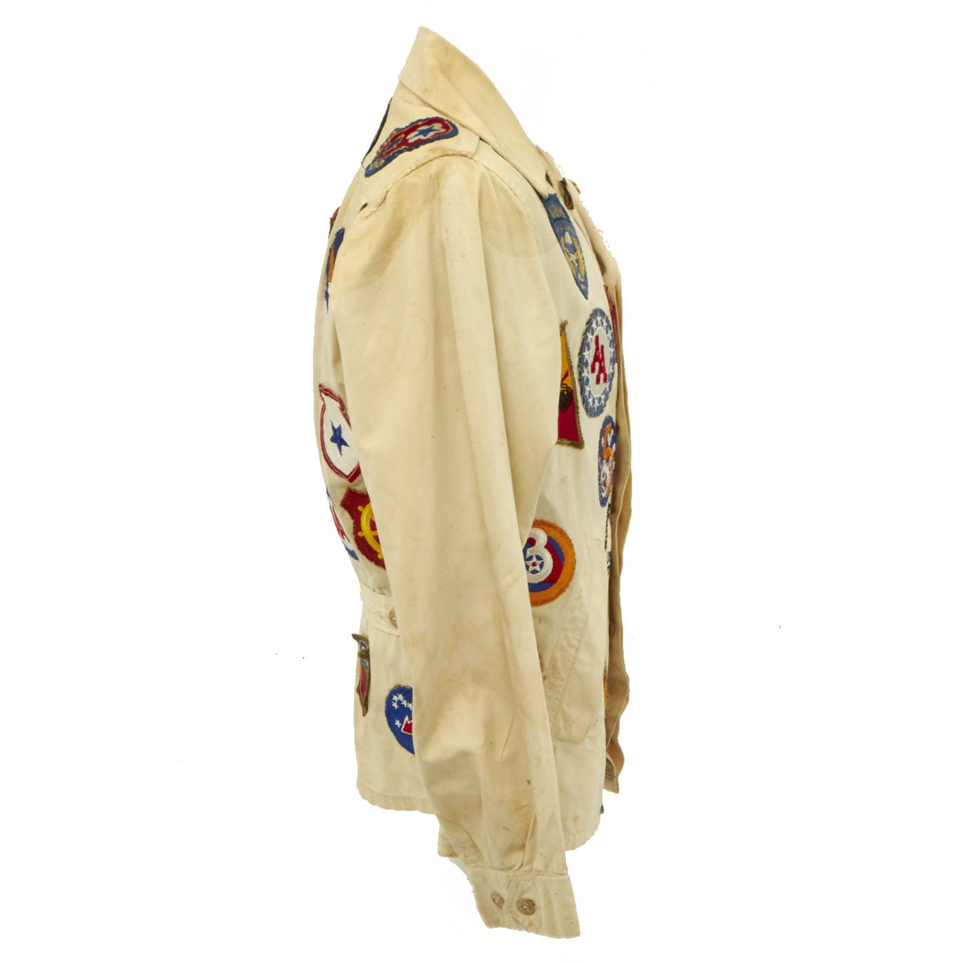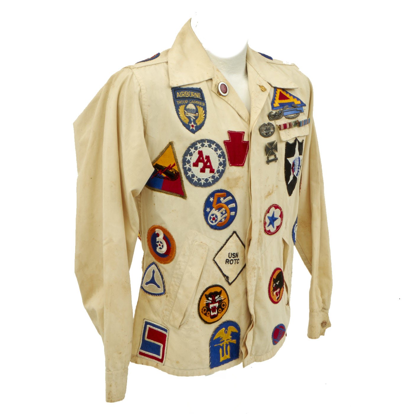 Original Item: One-of-a-kind. This is a civilian made "Sport-dee" M41 style white cotton jacket which came to us third party from the family of a World War Two Army nurse veteran who hailed from Kentucky. It has over 40 original patches stitched to it as well original pins and insignia. There are also 14 unattached patches which were stuffed into the pocket.