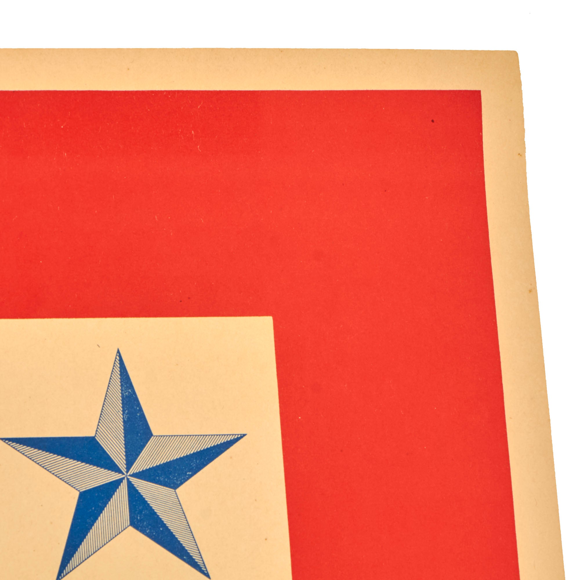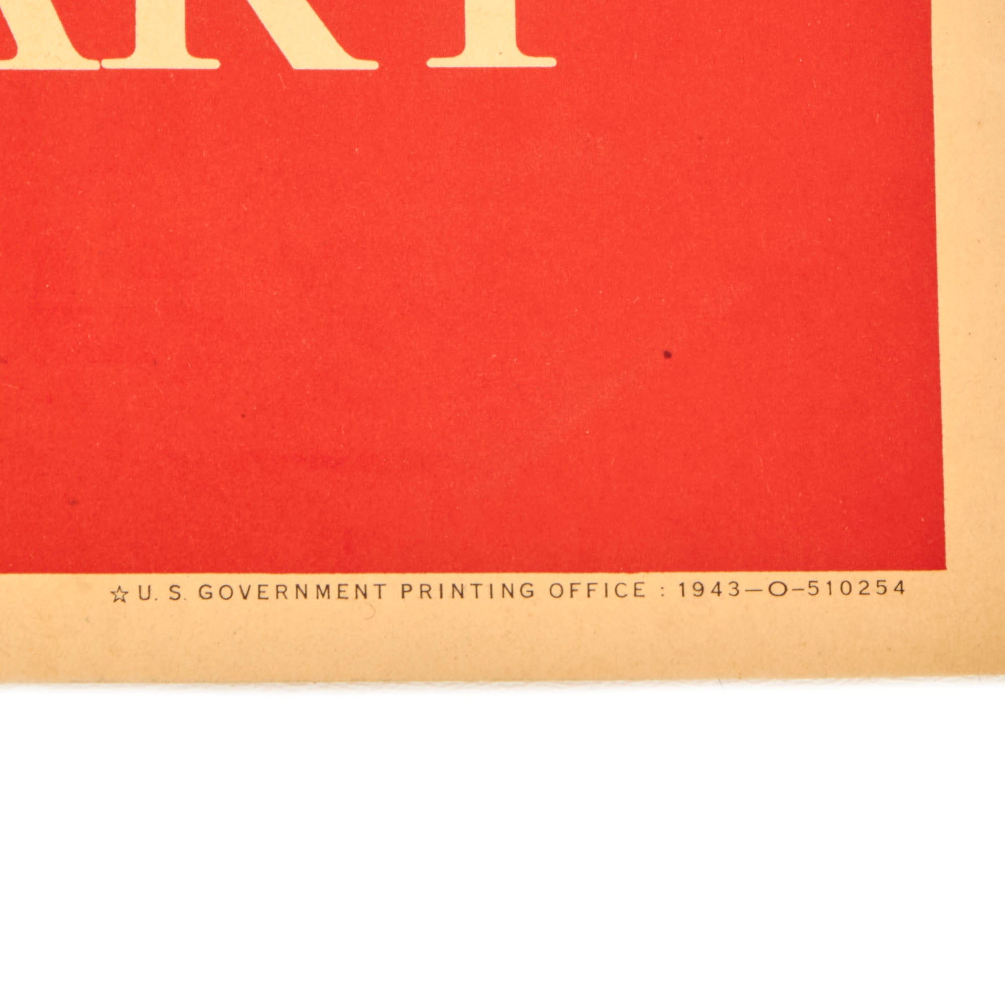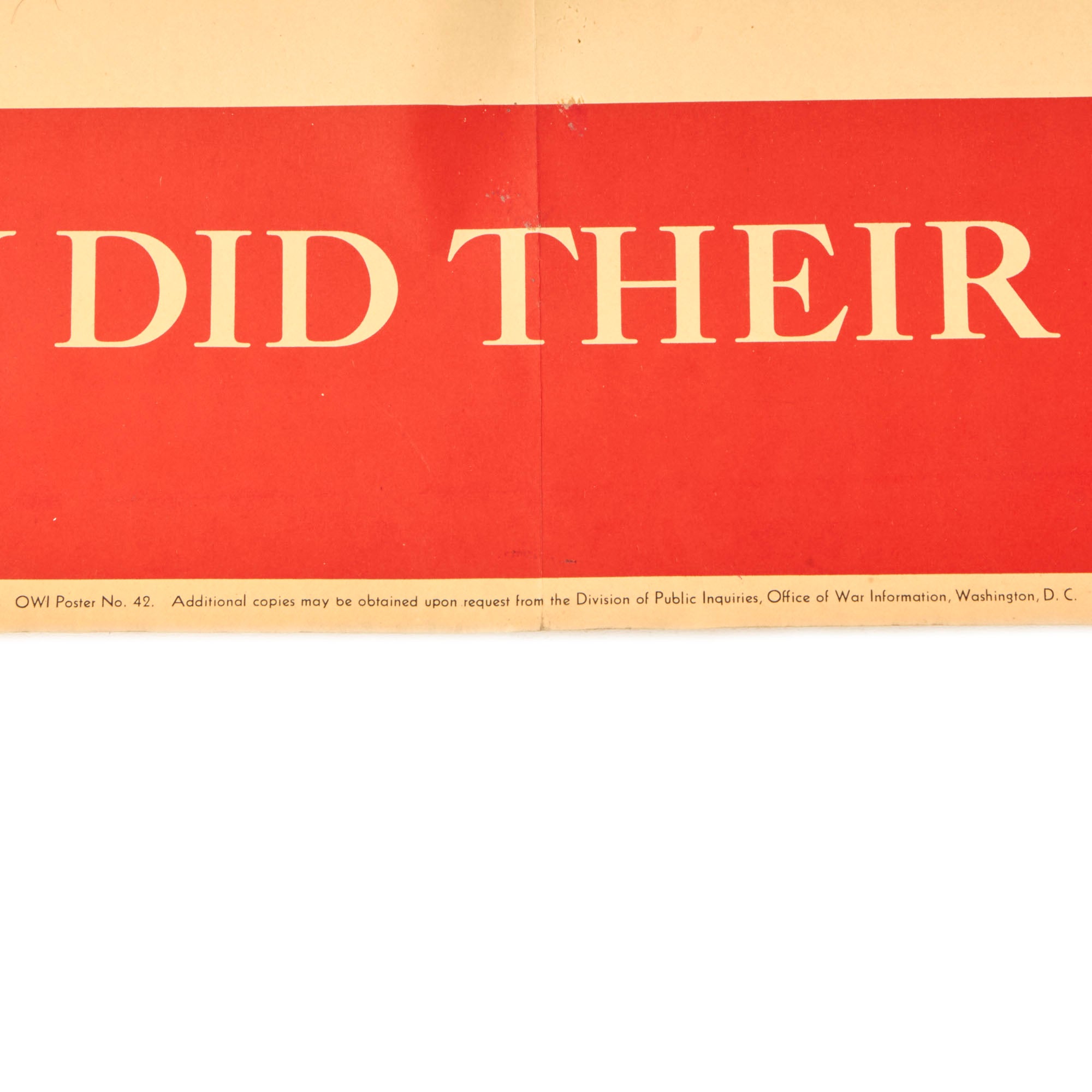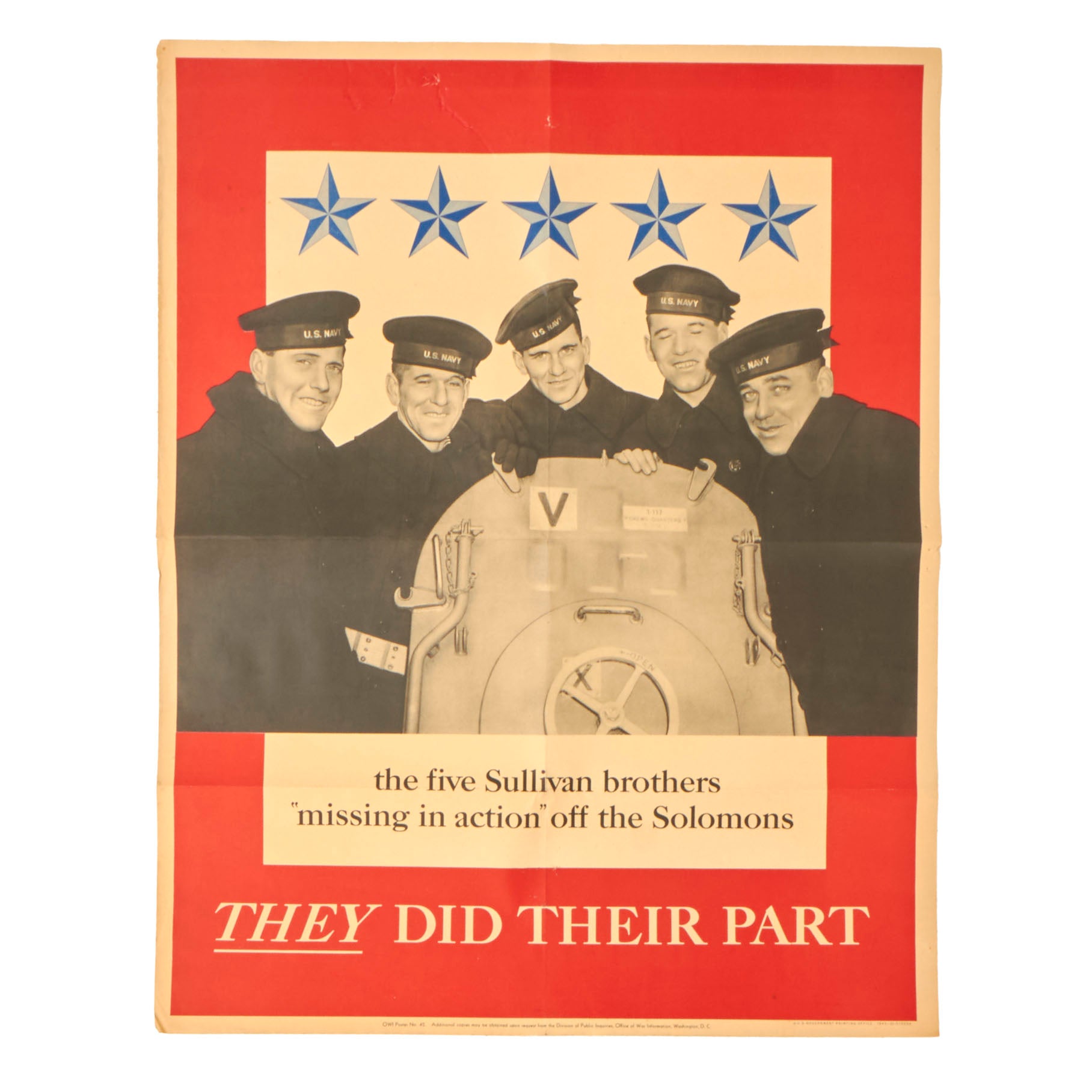 Original Item: Only One Available. A spectacular and iconic poster produced by the US Government Printing Office during World War II. It commemorates the loss of five brothers on the SS Juneau - an incredible loss for the Sullivan family and the entire country.News of the deaths of all five brothers became a rallying point for the war effort, with posters and speeches honoring their sacrifice. Extensive newspaper and radio coverage of the incident made the loss of the brothers a national story, producing "a wave of humility and sympathy..." and condolences poured in on the Sullivan family in Waterloo, Iowa. One woman told the Associated Press, "And now I wonder how the sugar and coffee hoarders feel." War bond drives and other patriotic campaigns culminated in the 1944 movie, "The Sullivans. It was the death of the five Sullivan brothers during the war in the Pacific that inspired the 1998 film "Finding Private Ryan." The tragedy was also responsible for the military regulation that only a certain number of family members can serve in combat at the same time. At least thirty sets of brothers served and died on the Juneau.The poster features a five blue star service flag in the background with the 5 Sullivan brothers in the foreground standing behind a U.S. Navy ship’s crewman quarters hatch, they are all dressed in U.S. Navy cold weather uniforms. The text that can be found on the bottom of the poster reads:the five Sullivan brothers“missing in action” off the SolomonsTHEY DID THEIR PARTOWI Poster No. 42. Additional copies may be obtained upon request from the Division of Public Inquiries, Office of War Information, Washington, D.C.U.S. GOVERNMENT PRINTING OFFICE: 1943-O-510254This poster will ship folded. The overall condition is excellent, with minor wear on the corners and edges due to age and storage. It measures 22 x 28”.This rare and iconic poster is a must have and welcomed into any military history collection.