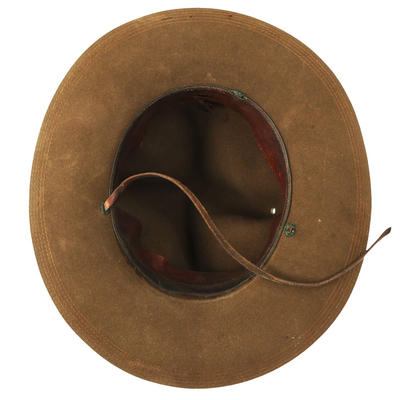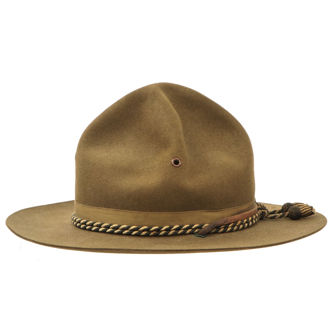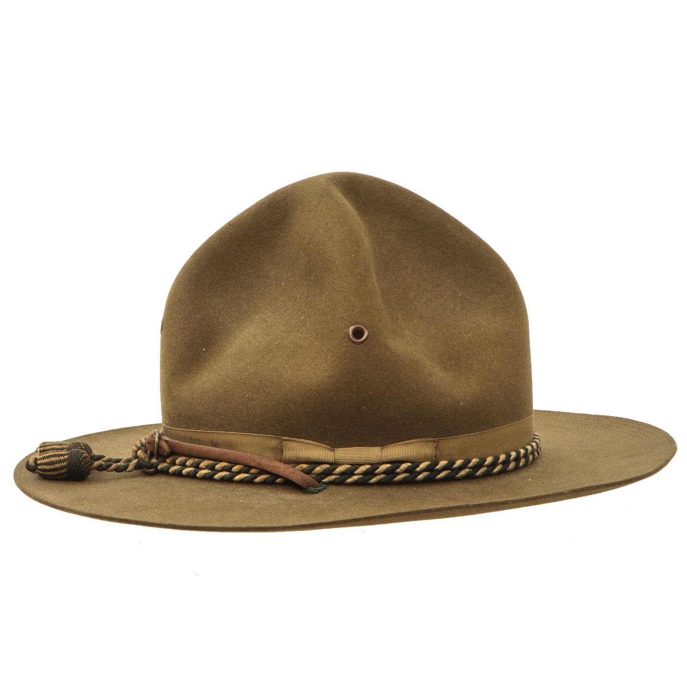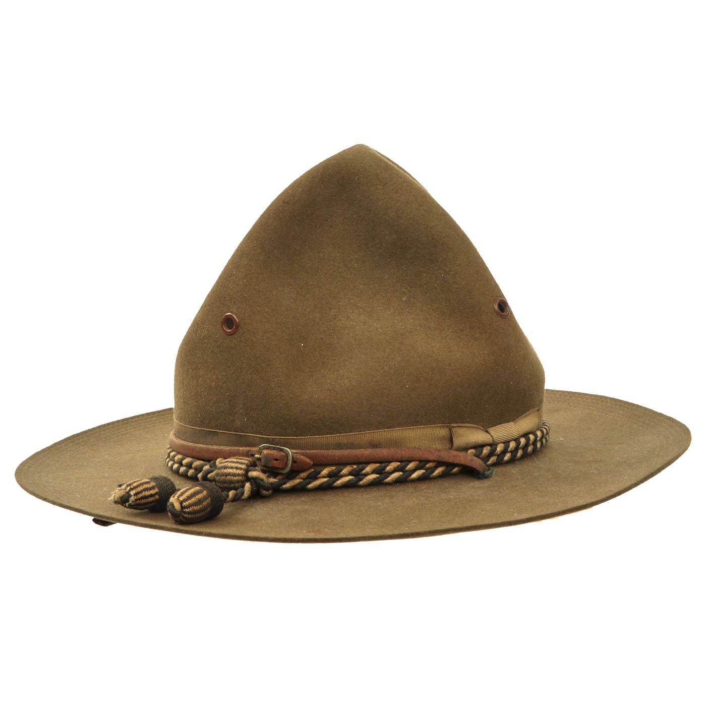 The Hat, Service, M1911 (Campaign Hat) was made of OD wool felt with a wide brim and "Montana peak" crown. There were ventilation holes in the crown with grommets, a silk hatband, and a silk and brass braid cord closed by a knot and terminated with a tassel. Inside was a leather sweatband and an attached chin strap. The Army model was dark brown OD in color.