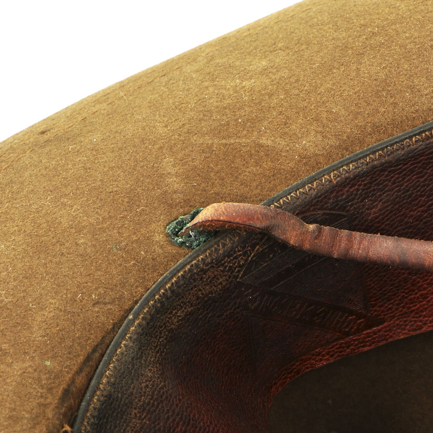 This is a private purchase WW2 M1911 Officer's Campaign Hat by the Stetson Company. The sweatband is embossed on the left side with the JOHN B STETSON Co. "Shield" trademark logo, and the right side is marked by retailer F. SCHWARTE Jr. / LAWTON , OKLA.. It is offered in very good condition with signs of moderate use and some degradation from age.