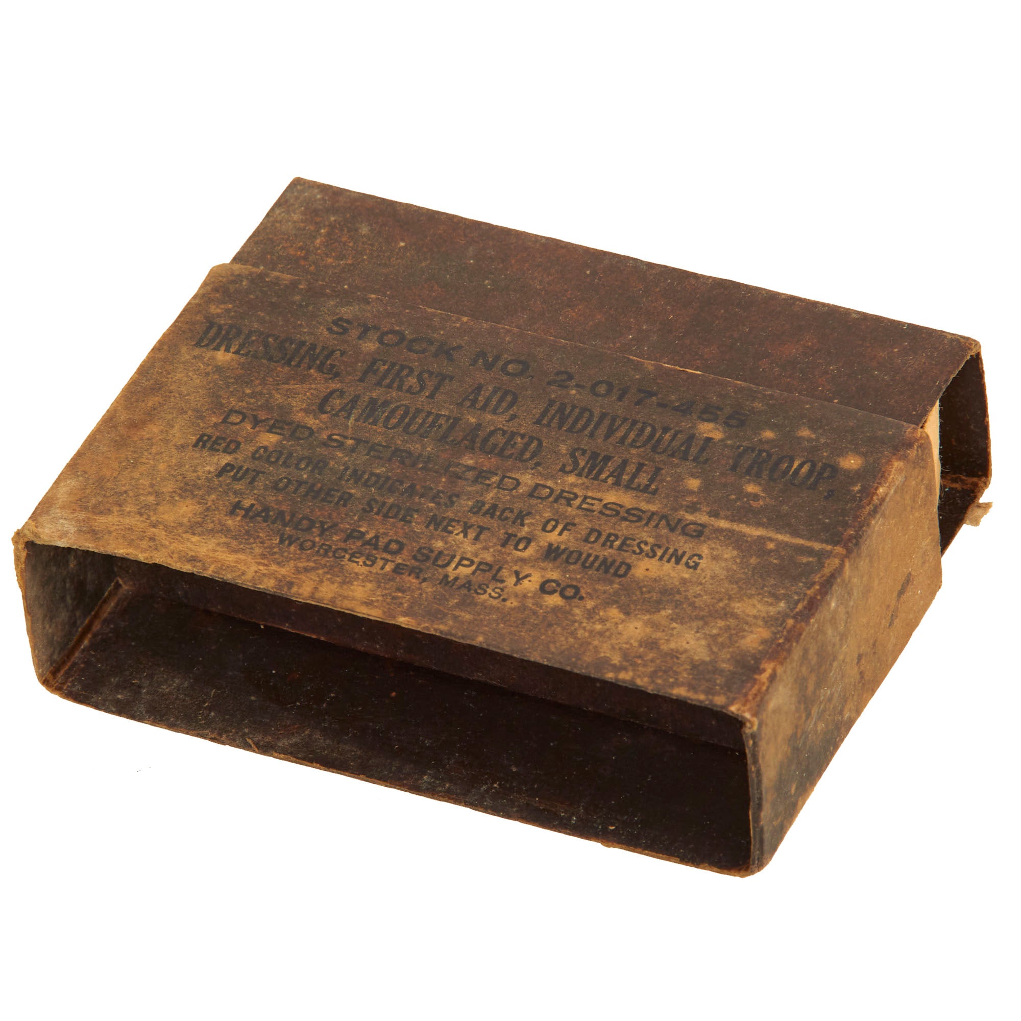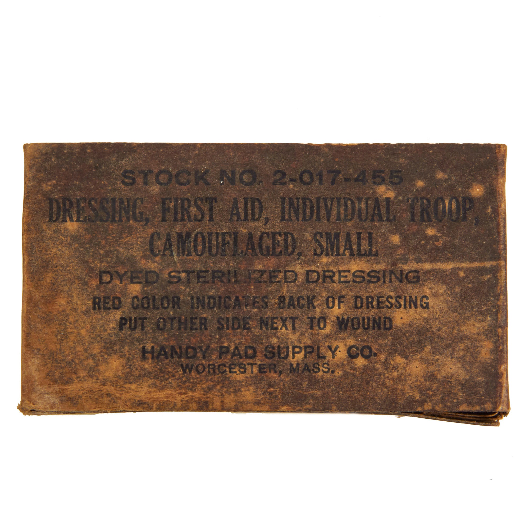 - Original WWII issue first aid web pouch: Free of damage and the stampings are present but difficult to read. The pouch contains an unopened “Dressing, FIrst Aid, Individual Troop” small camouflaged bandage.