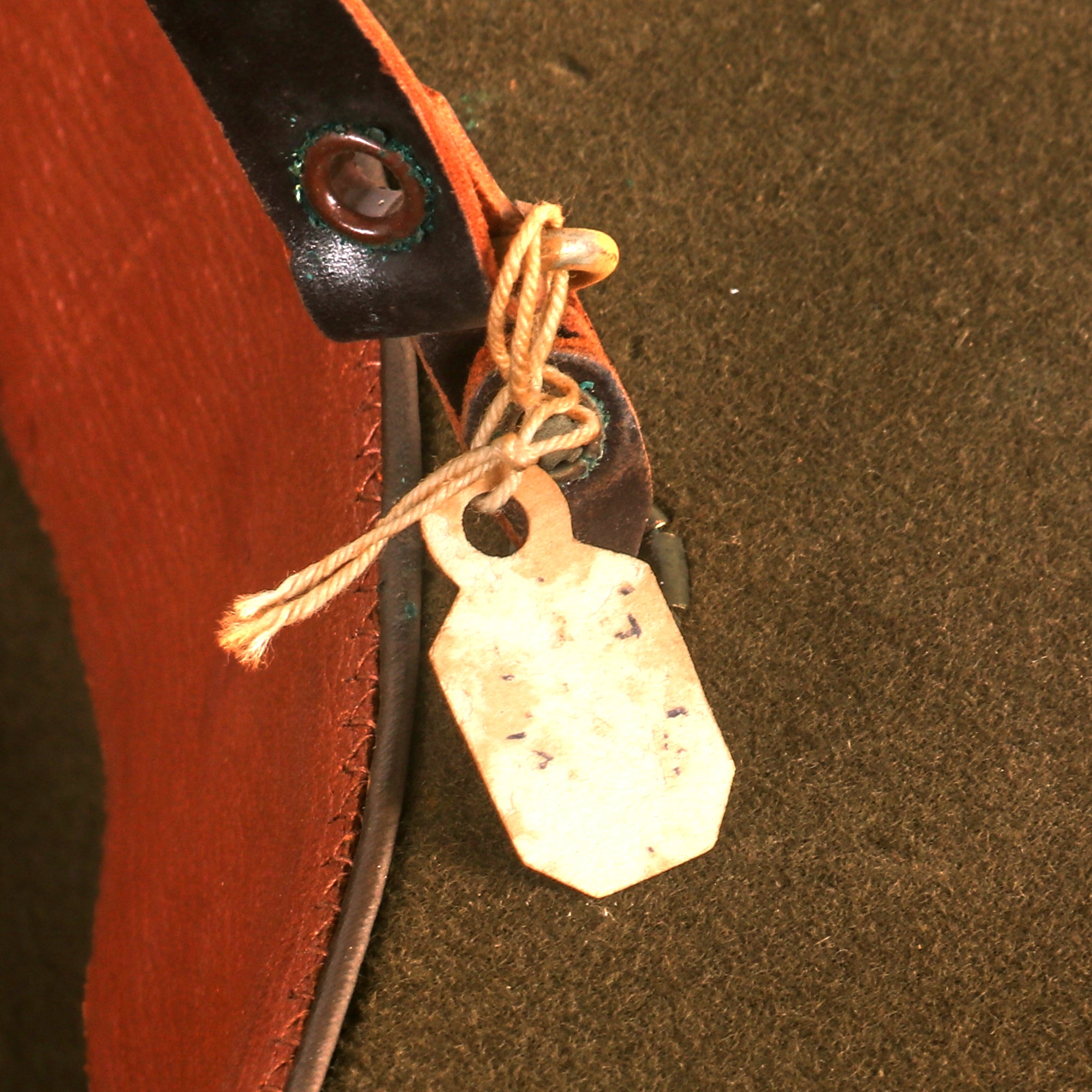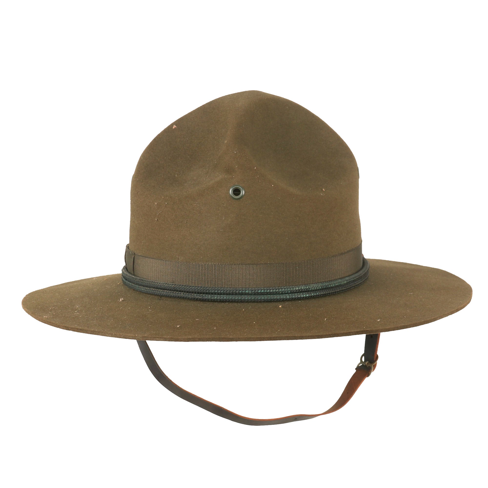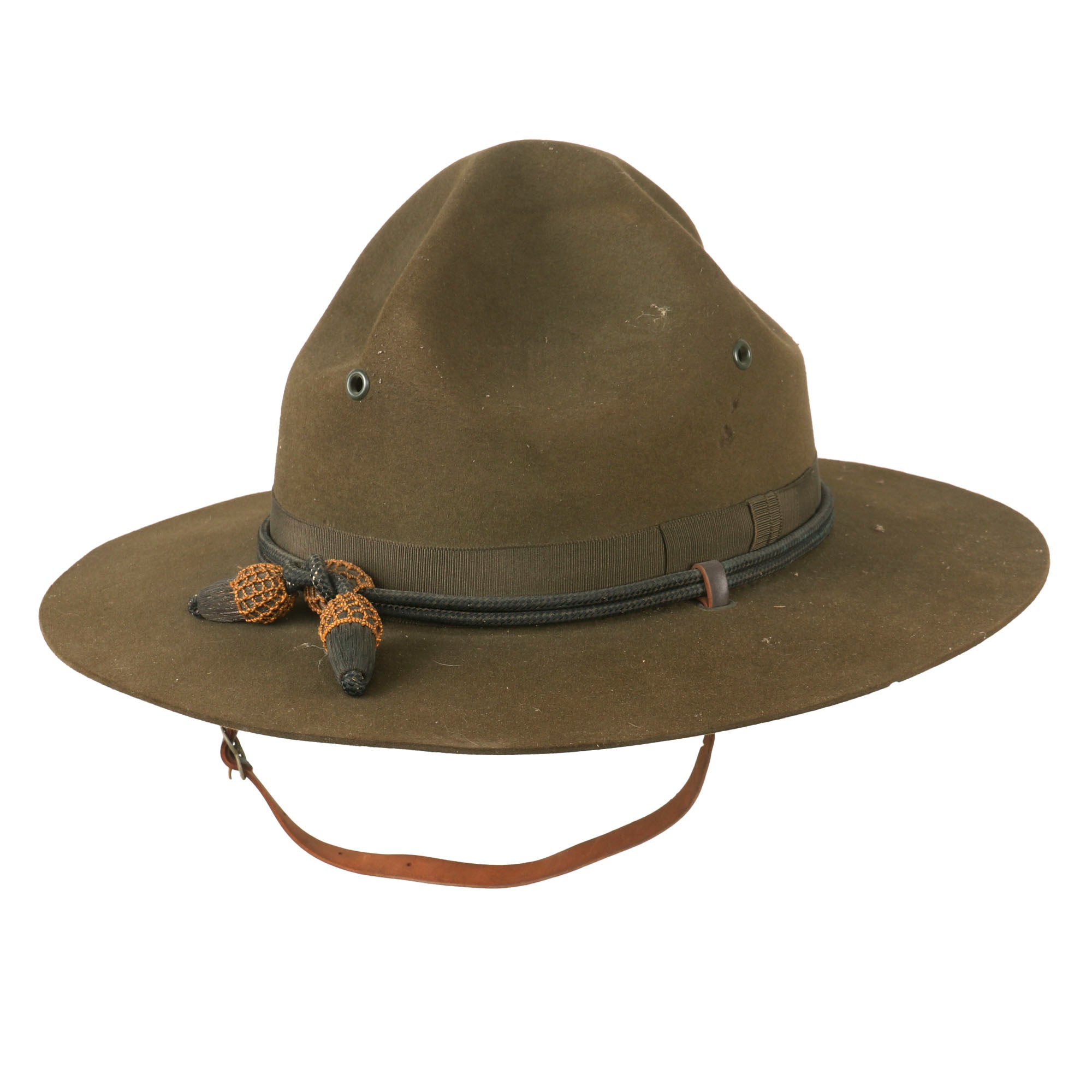 The Hat, Service, M1911 (Campaign Hat) was made of OD wool felt with a wide brim and "Montana peak" crown. There were ventilation holes in the crown with grommets, a silk hatband, and a silk and brass braid cord closed by a knot and terminated with a tassel. Inside was a leather sweatband and an attached chin strap. The Army model was dark brown OD in color.