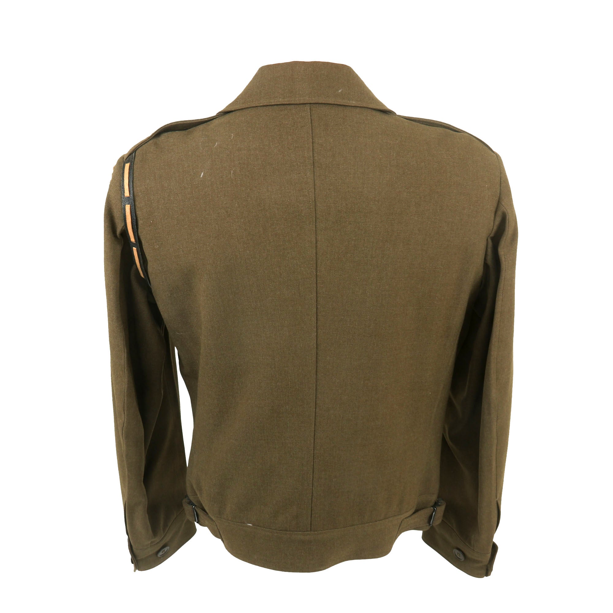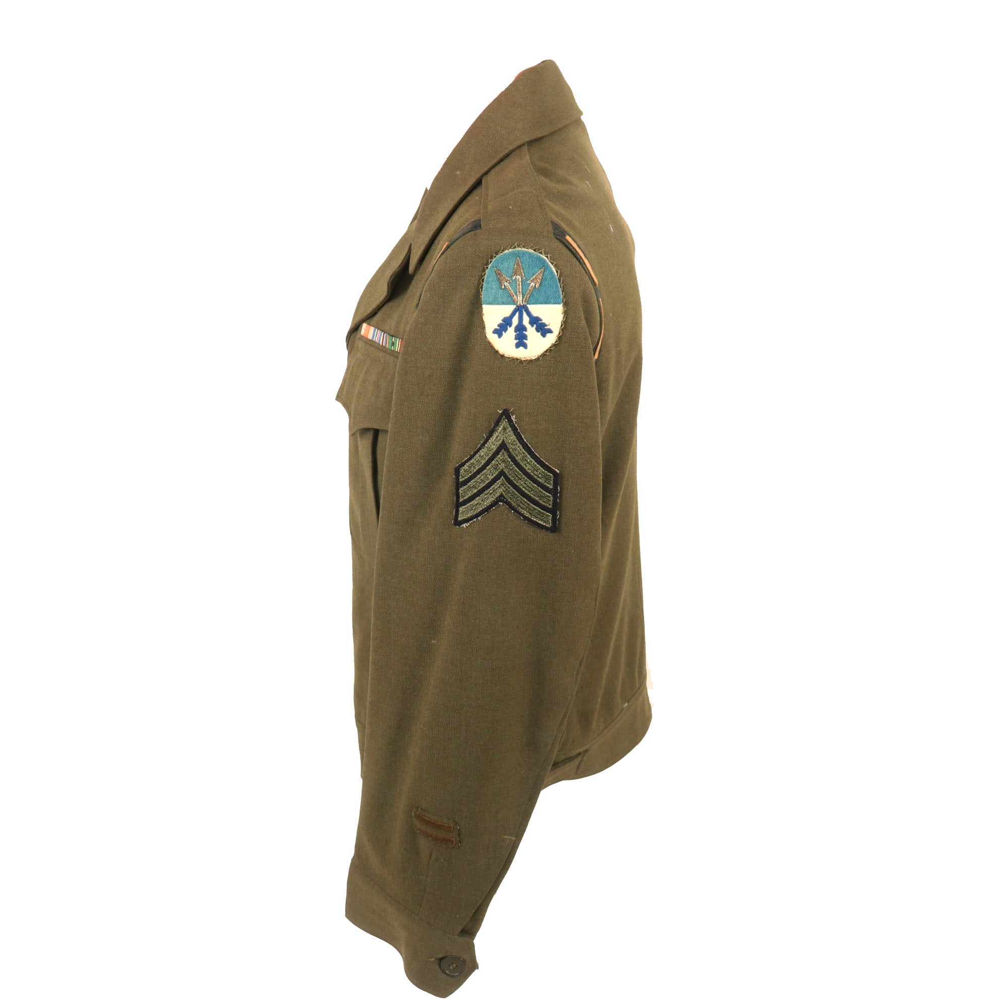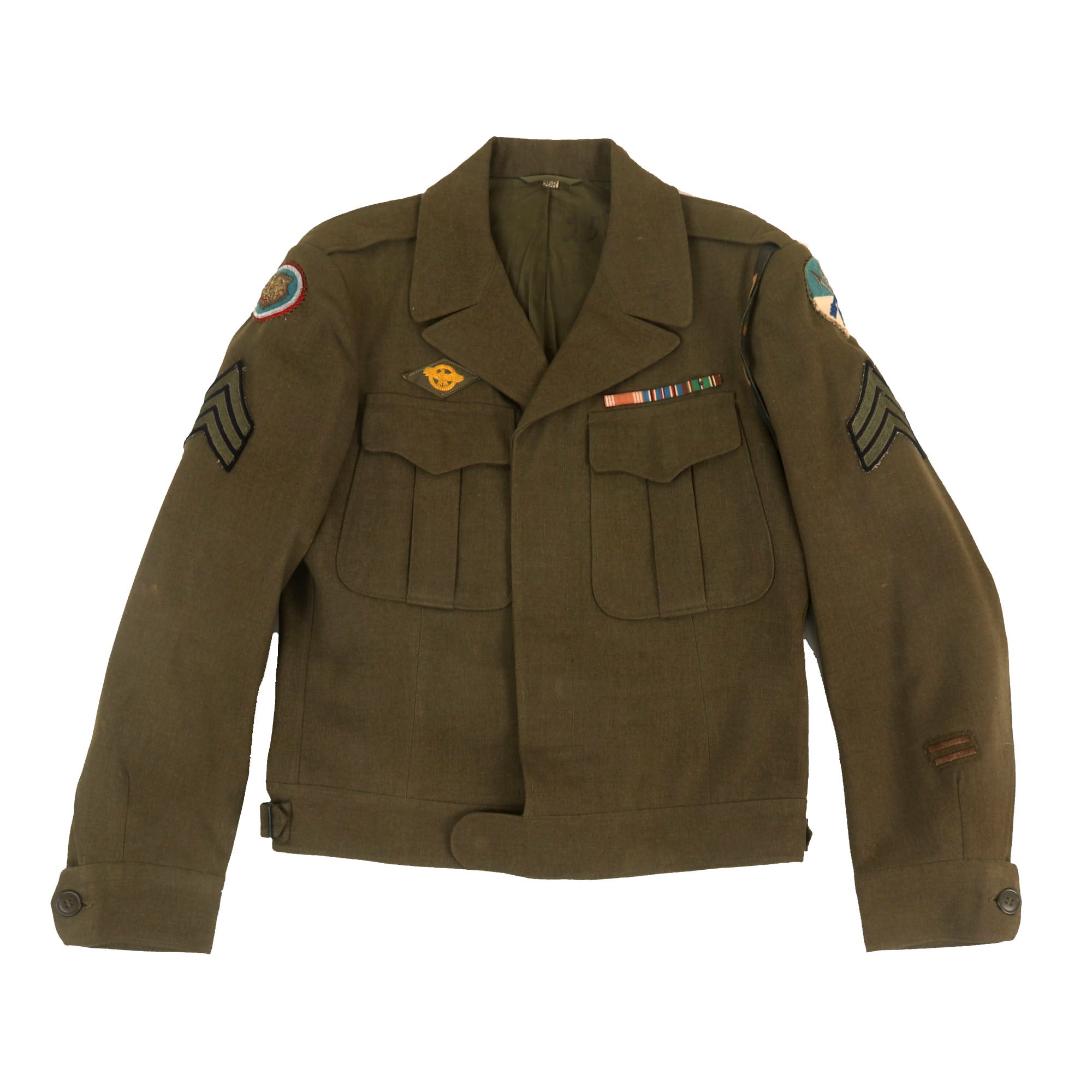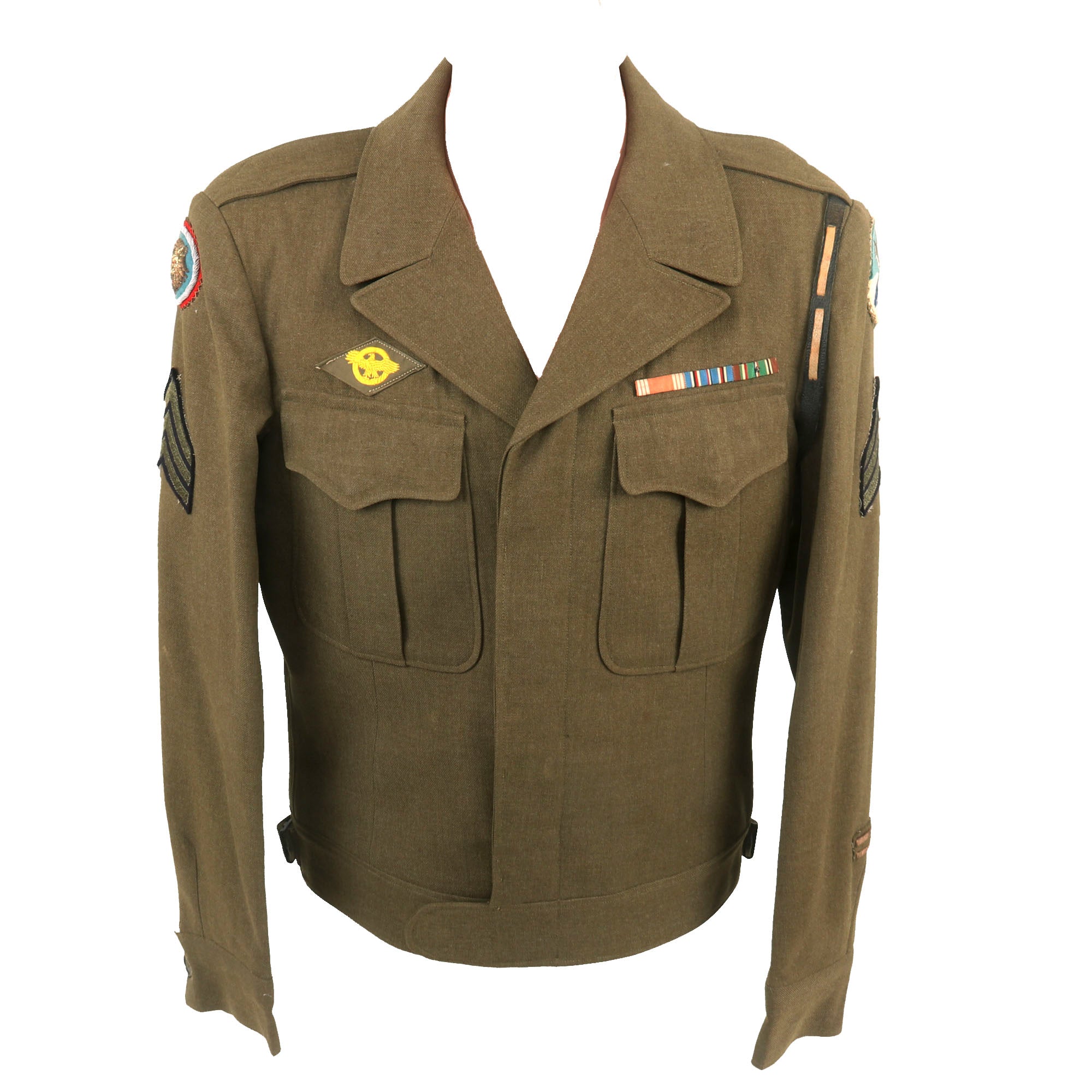 Original Item. One-of-a-Kind. This is an absolutely stunning WWII Ike jacket with great bullion patches and a scarce “Buff Strap” leather cord, the distinctive trimming for the 3rd Infantry Regiment, the “Old Guard”. The 3rd Infantry Regiment arrived in Le Havre, France on 18 March 1945, and was attached to the reconstituted 106th Infantry Division with the mission of containing the isolated German garrison at St. Nazaire.
