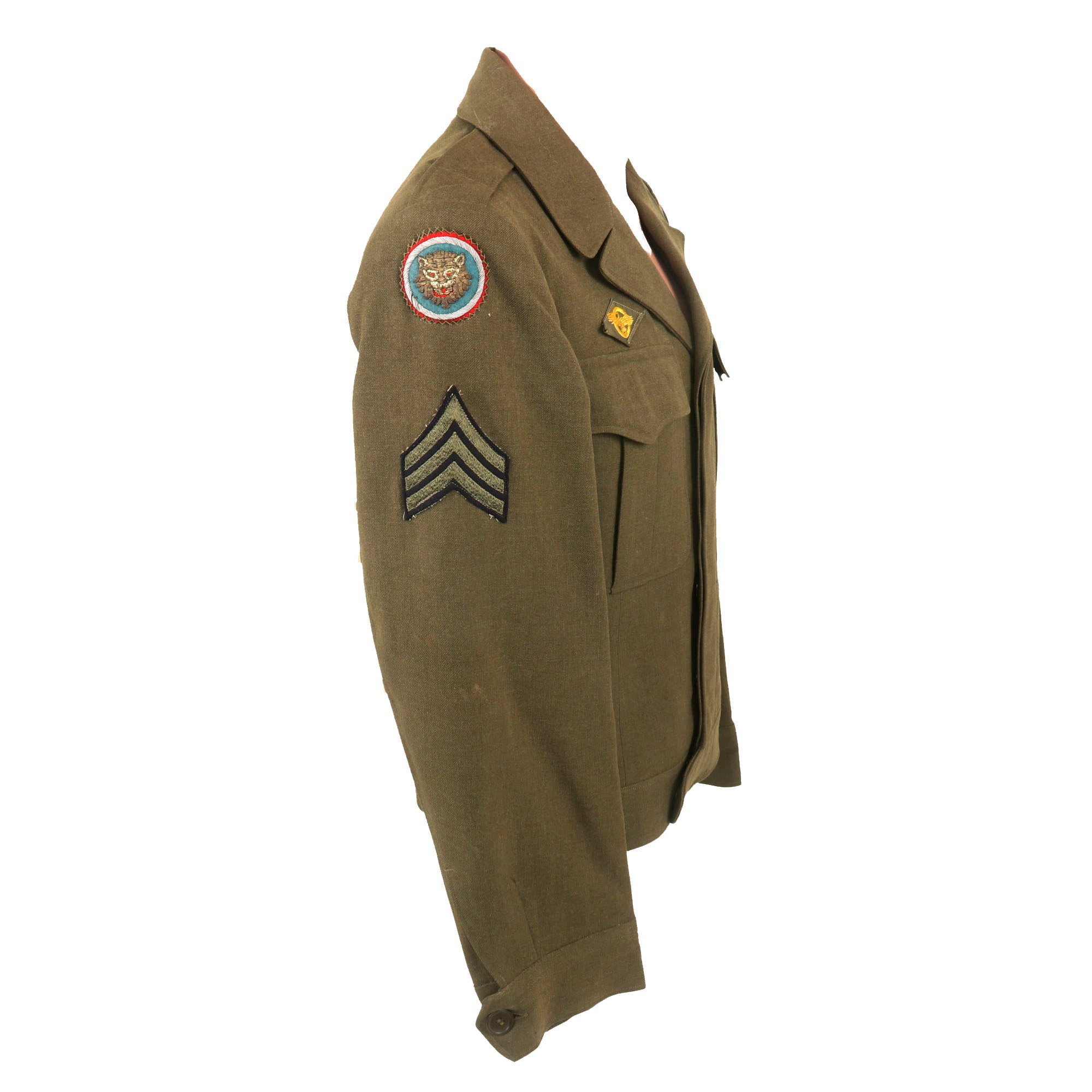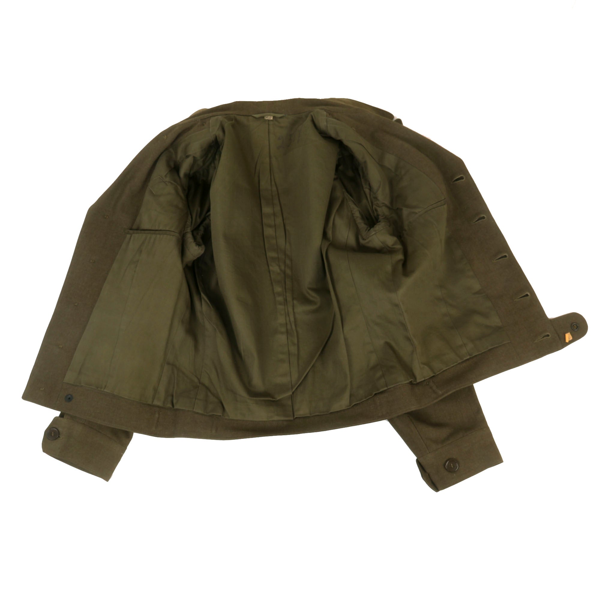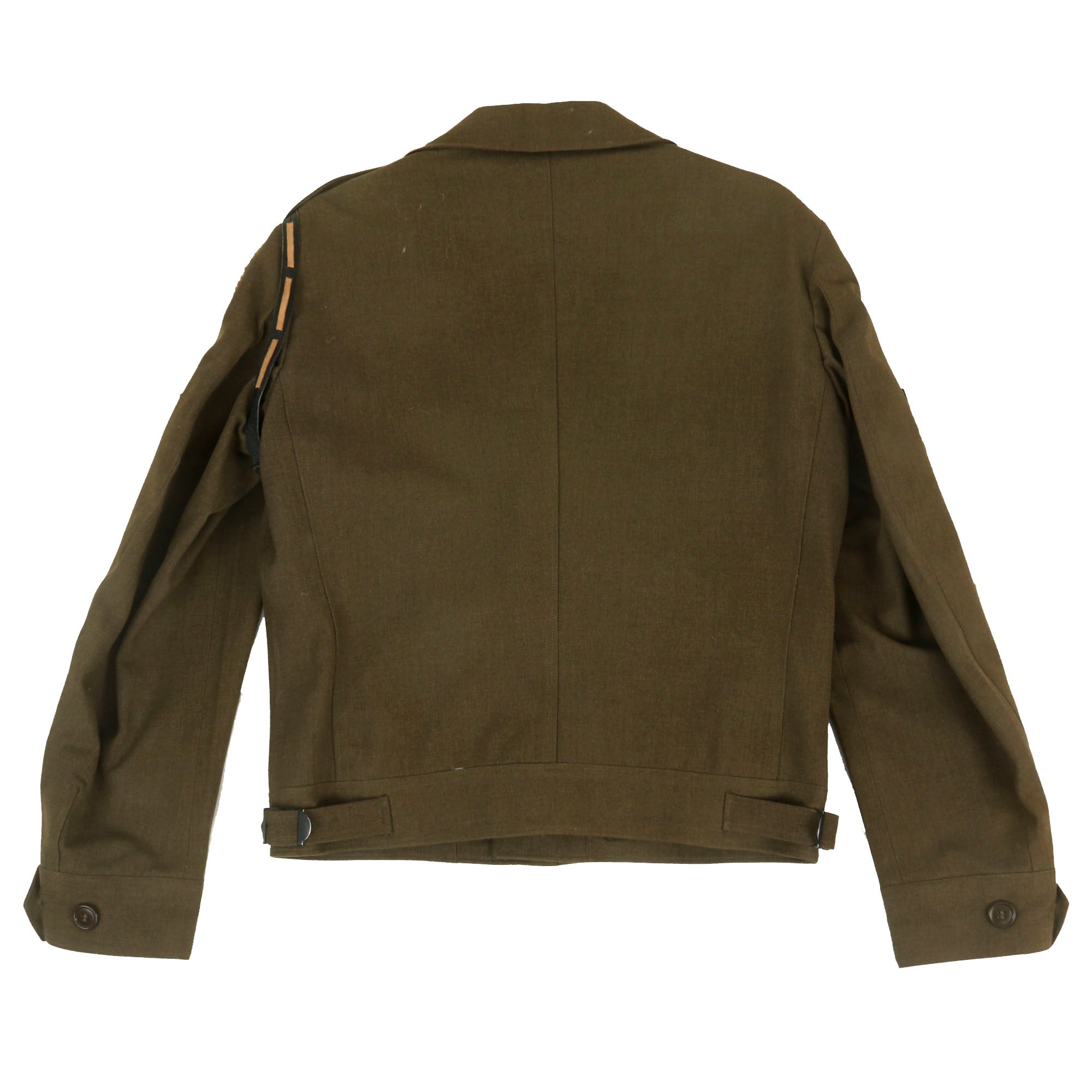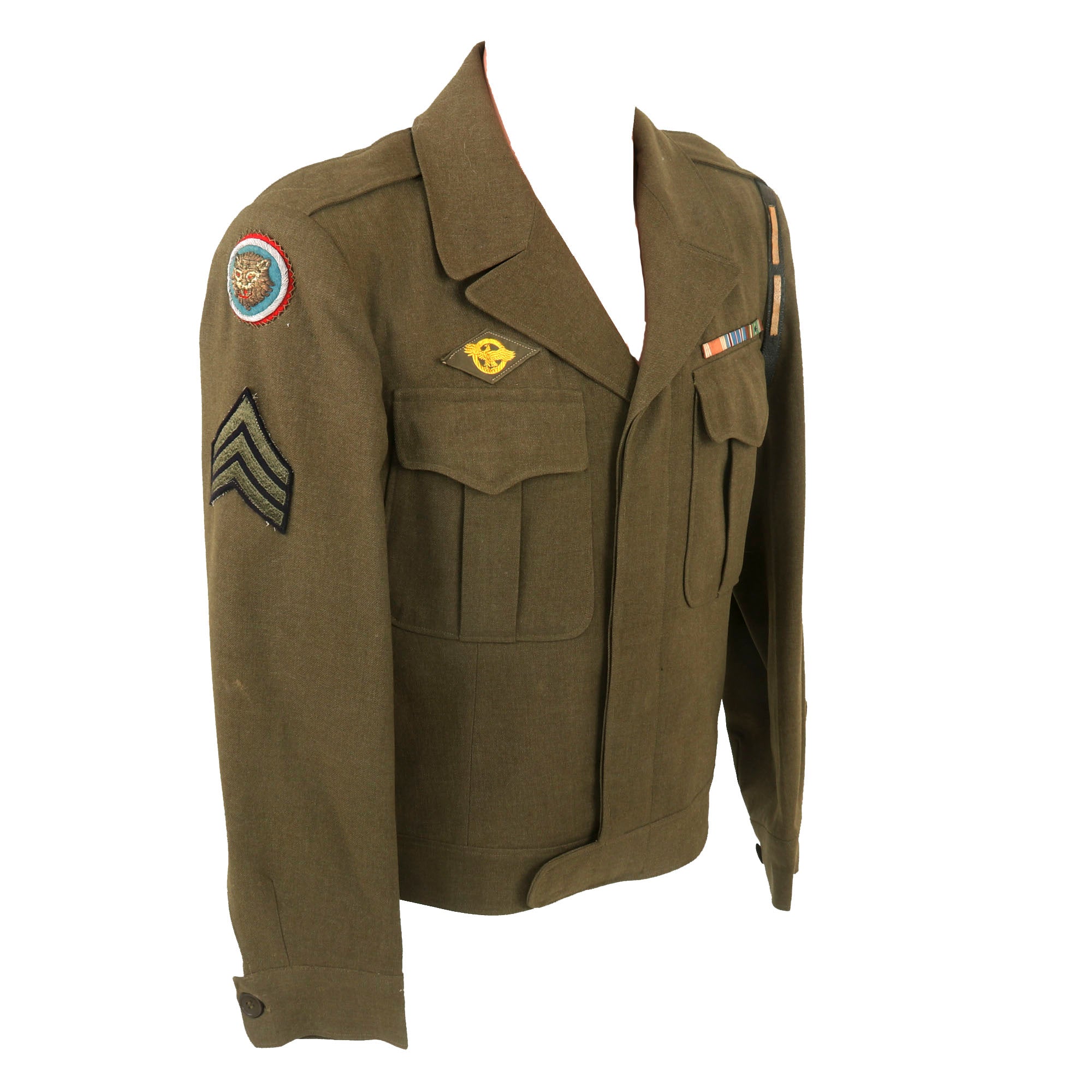 Original Item. One-of-a-Kind. This is an absolutely stunning WWII Ike jacket with great bullion patches and a scarce “Buff Strap” leather cord, the distinctive trimming for the 3rd Infantry Regiment, the “Old Guard”. The 3rd Infantry Regiment arrived in Le Havre, France on 18 March 1945, and was attached to the reconstituted 106th Infantry Division with the mission of containing the isolated German garrison at St. Nazaire.