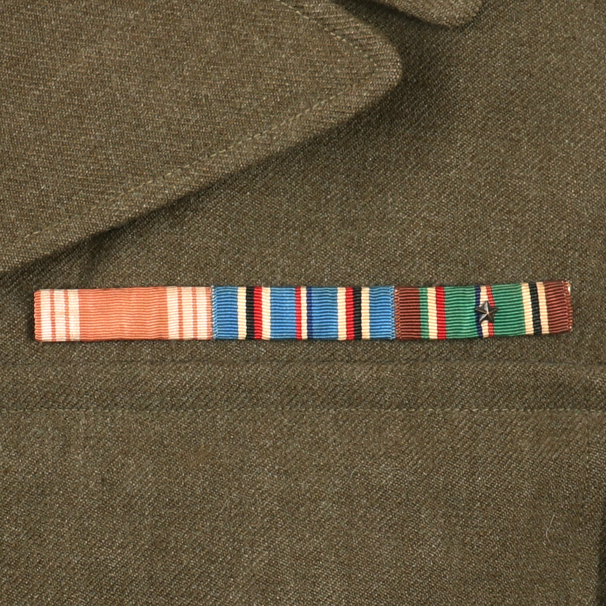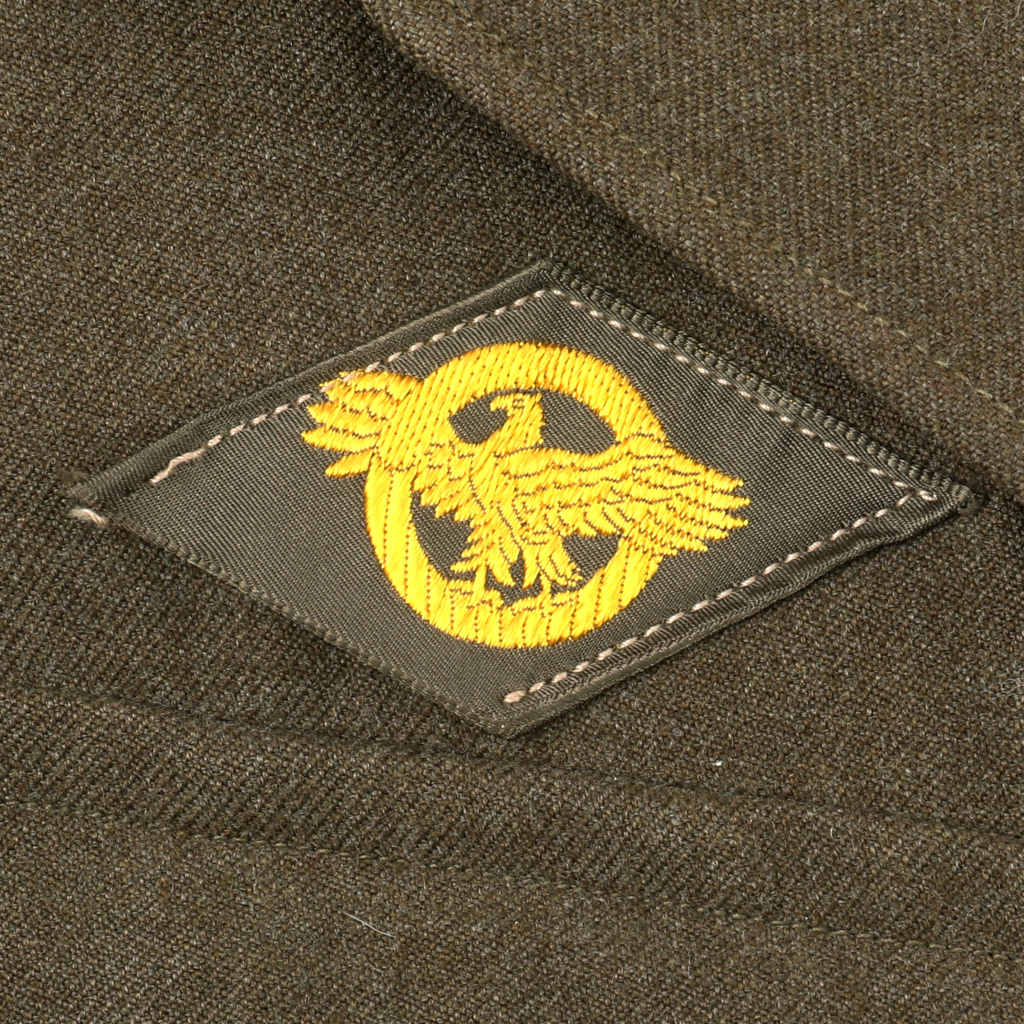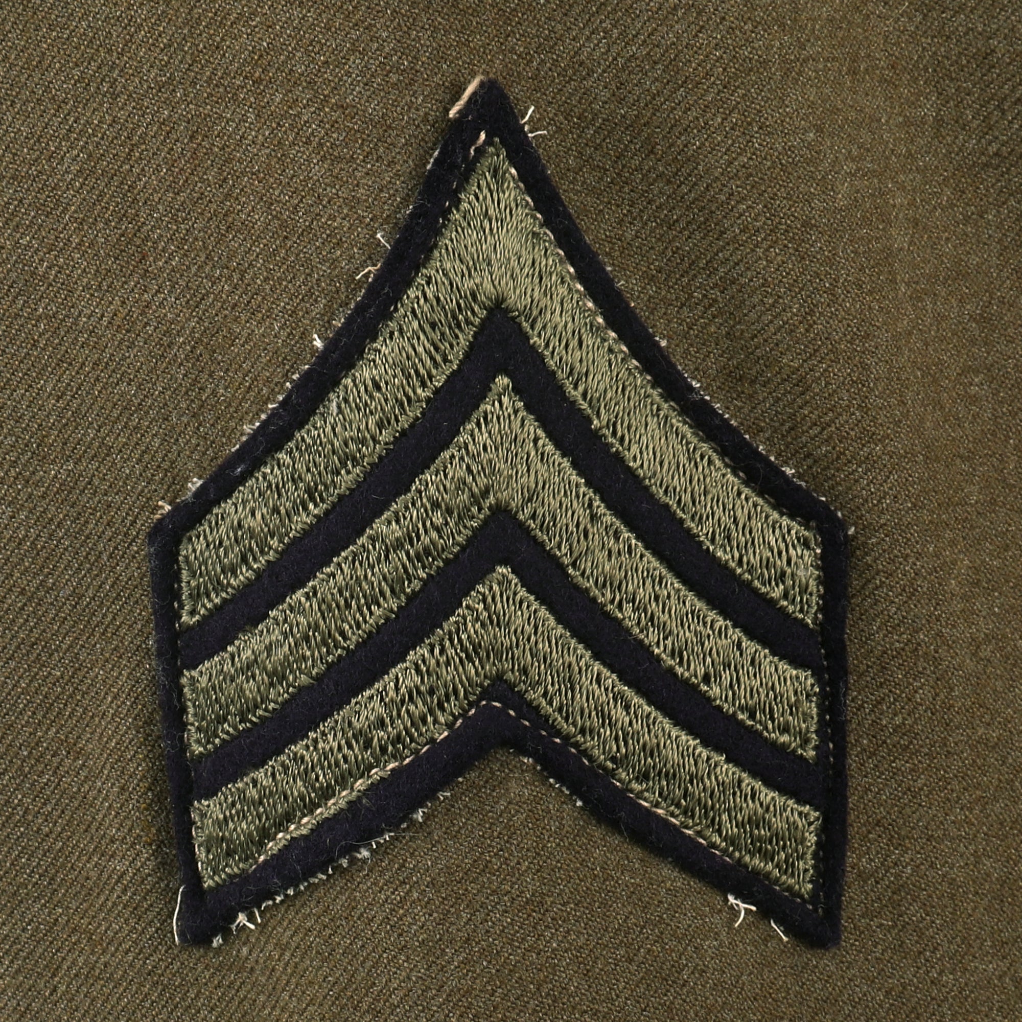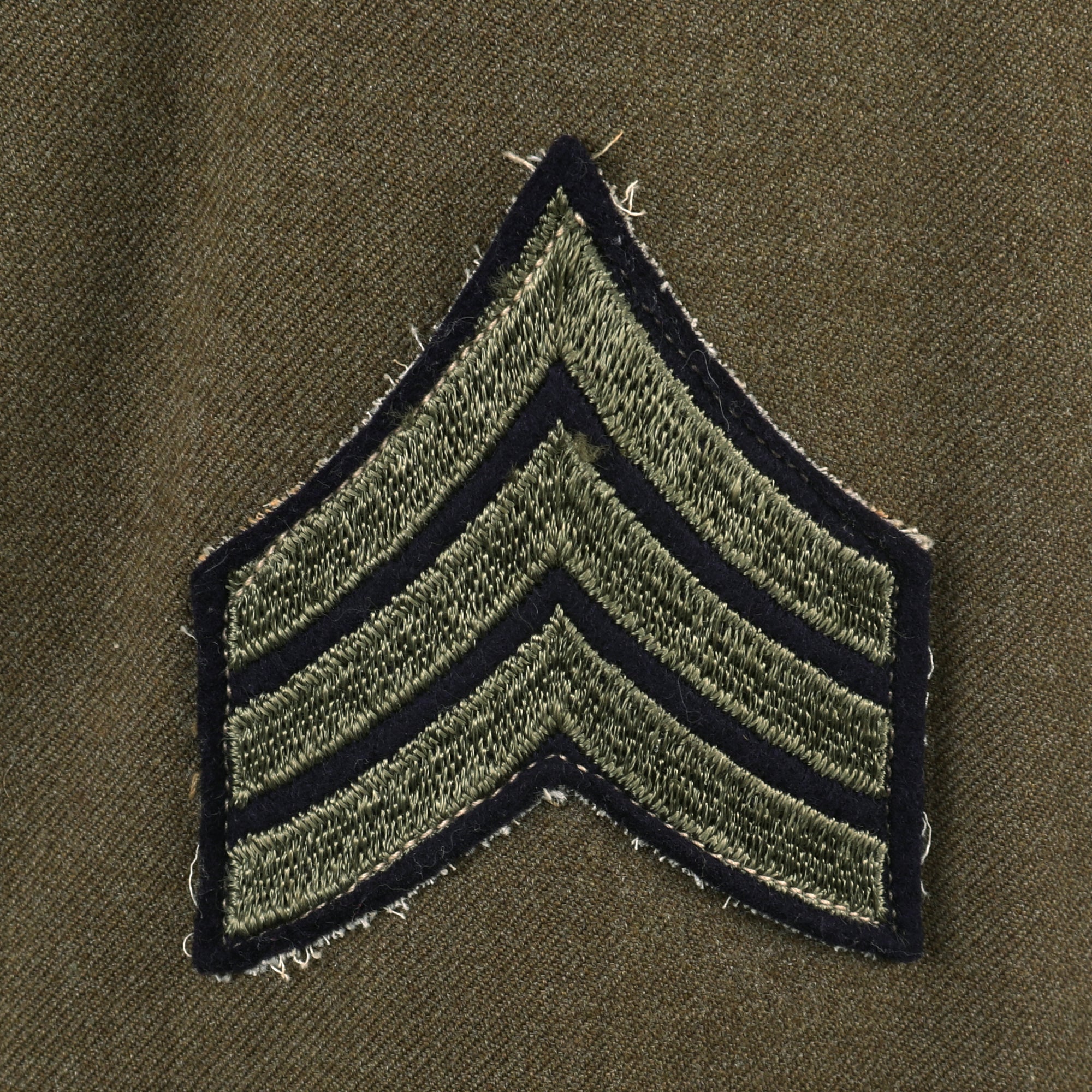 The jacket bears gorgeous German-made bullion patches for the 106th Infantry Division on the right shoulder, and for the XXIII Corps on the left shoulder. There are sergeant chevrons on both sleeves, with two bullion overseas stripes on the left cuff. The left arm has the 3rd Infantry Regiment “Buff Strap” worn like a cord, brown in color with white tabs. It is secured by a snap. There is a “Ruptured Duck” honorable discharge patch above the right breast pocket, and a 3-place ribbon bar with the Army Good Conduct Medal, American Campaign Medal, and European-African-Middle Eastern Campaign Medal with one star. There is a number written on the interior liner, 2584. There is a size tag in the jacket, 36R.