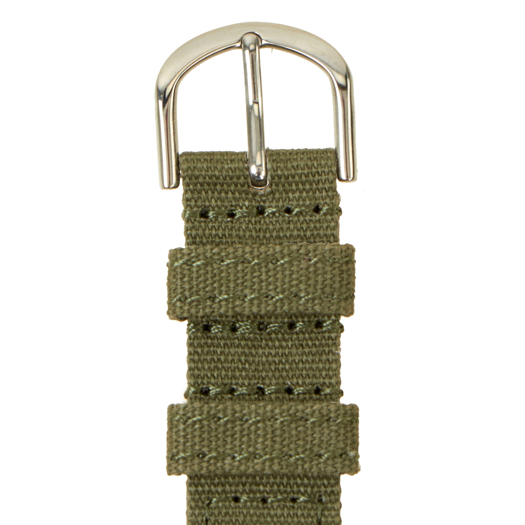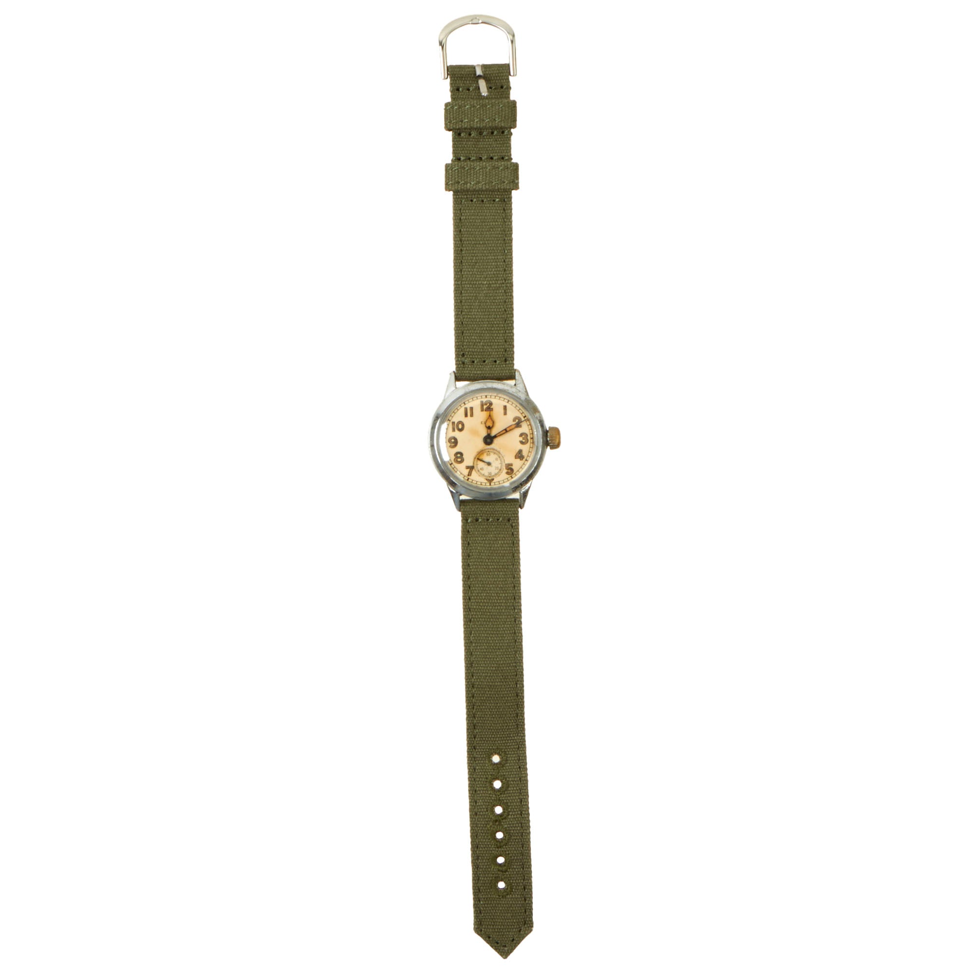 Original Item: Only One Available. This is an excellent example of a Mid-War production OF Officer Grade issue Stainless Steel Case Elgin Model 10617 17-Jewel wrist watch, with a stainless steel screw back closure. This wonderful example has been fully cleaned, tested and runs smoothly. It was manufactured for the US Army, and has a white face with radium luminous numbers for night use. It has the name ELGIN on the dial face. The band is a correct high quality OD Green web reproduction. The Army serial number is 286572, which places production around 1944-45 based on past watches we have sold.