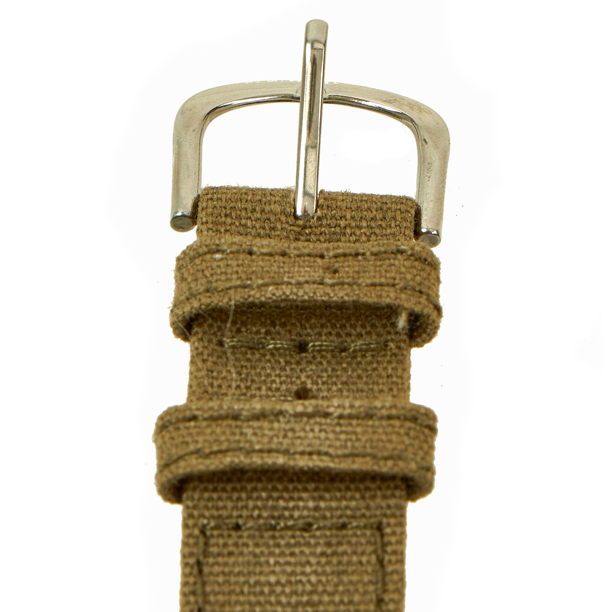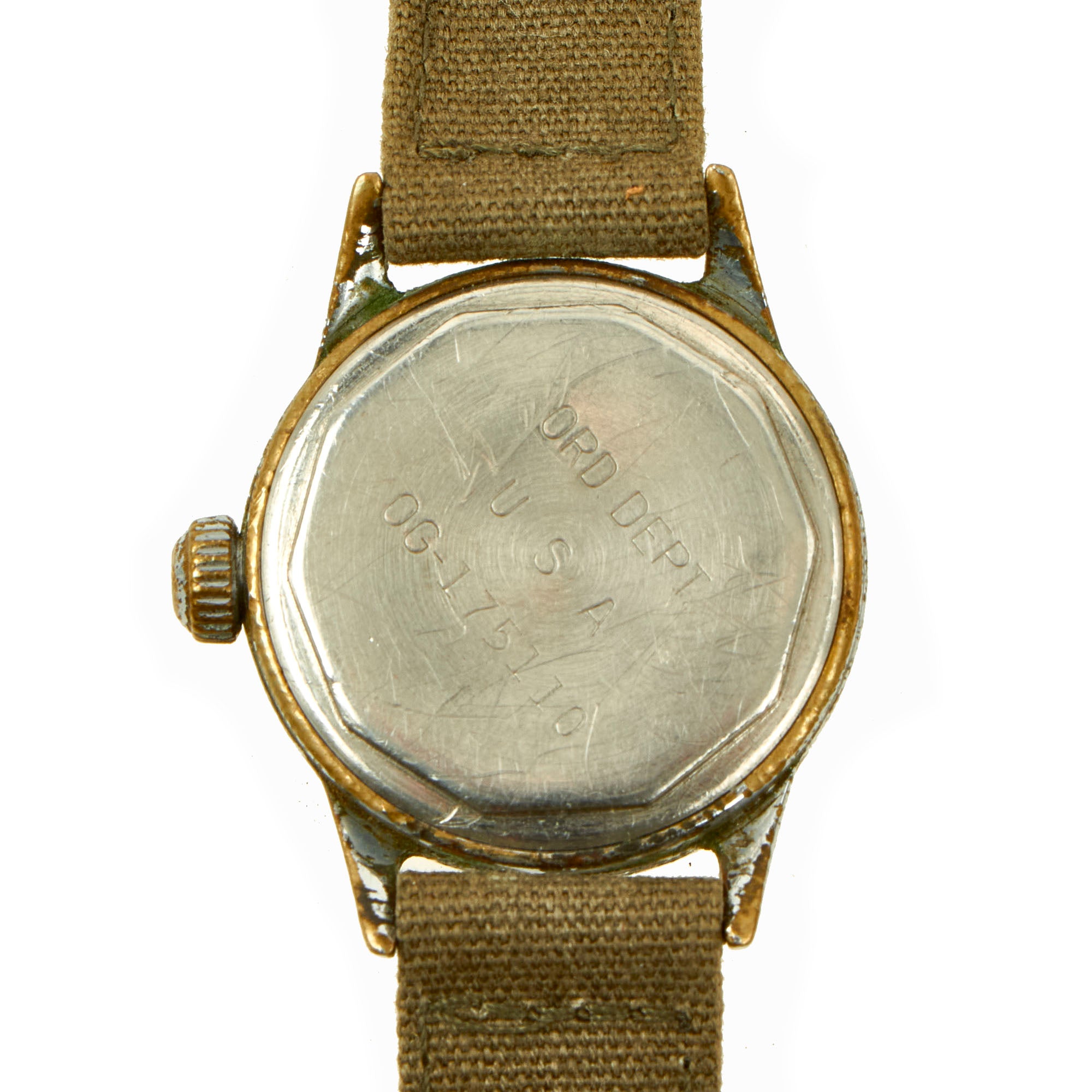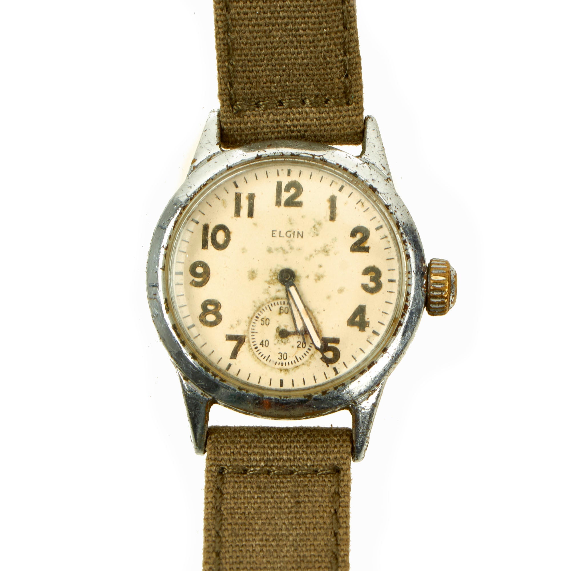Original Item: Only One Available. This is an excellent example of a Mid-War production OF Officer Grade issue Stainless Steel Case Elgin Model 10617 17-Jewel wrist watch, with a stainless steel screw back closure. This wonderful example has been fully cleaned, tested and runs perfectly. It was manufactured for the US Army, and has a white face with radium luminous numbers for night use. It has the name WALTHAM on the dial face. The band is a correct high quality OD Green web reproduction. The Army serial number is 175110, which places production around 1944-45 based on past watches we have sold.