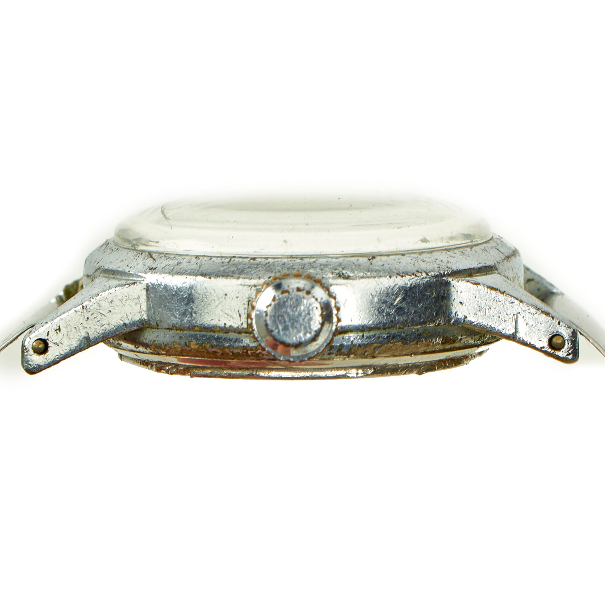 This watch is in very good condition. The metal components are nice, with minimal scratches or dings. The watch runs smoothly, and appears to keep good time, though it is important to remember that the specification for wrist watches in WWII could be off by several seconds a day. The watch crystal appears to be original and does have a small crack in it. The only real issue with the watch is that the white watch face has an orange stain covering the center of the face. The numbers also have some flaking. The hands are original, and quite nice.