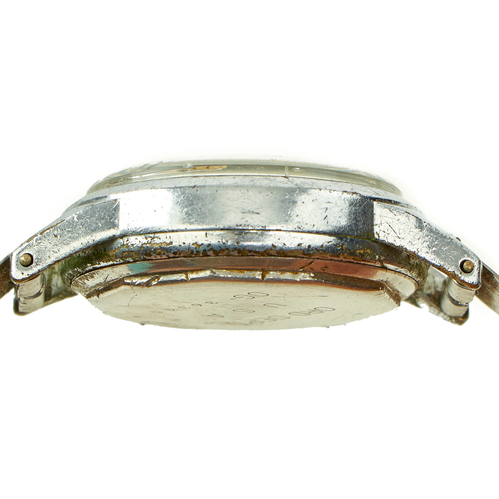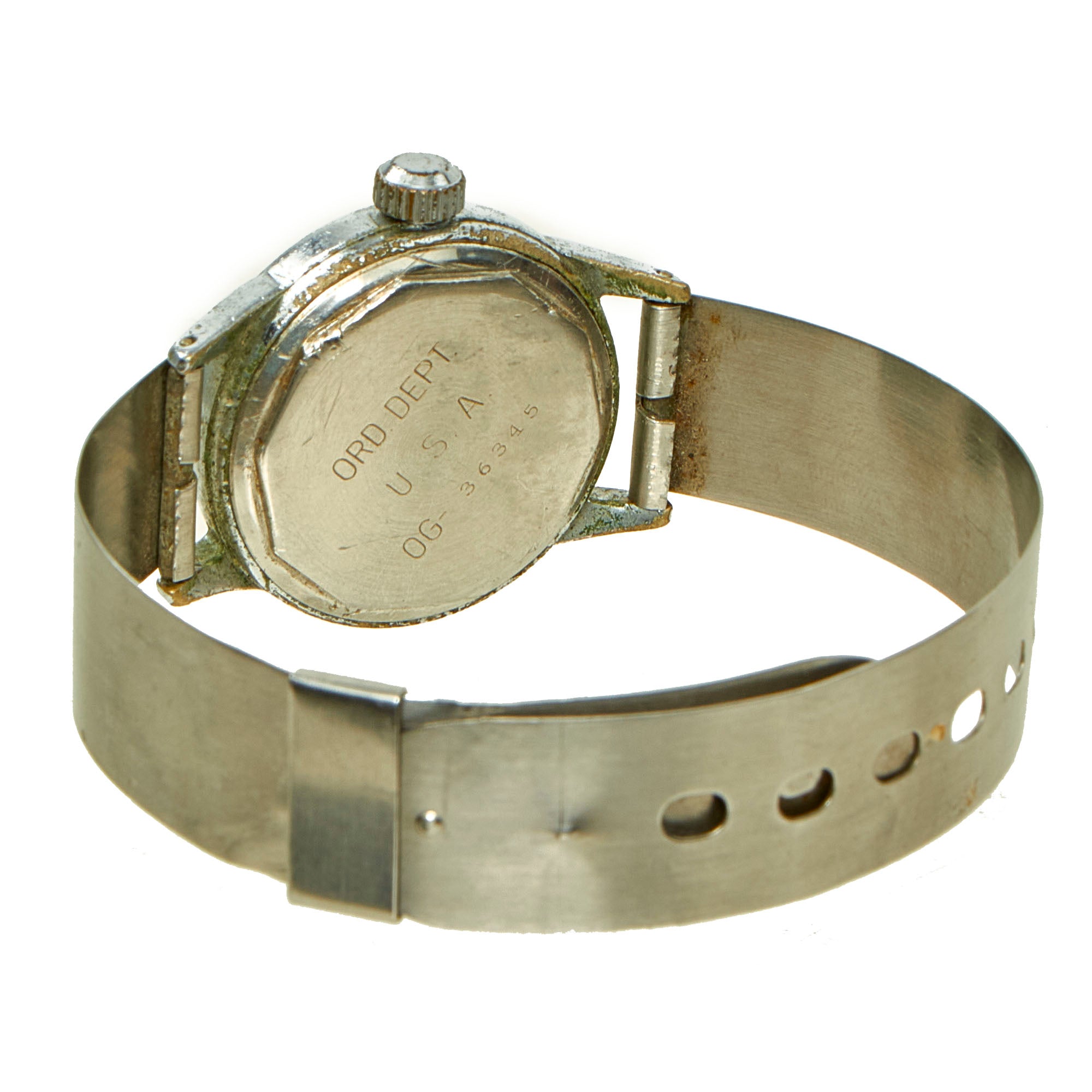 Original Item: Only One Available. This is an excellent example of a Mid-War production OF Officer Grade issue Stainless Steel Case Waltham Model 10617 17-Jewel wrist watch, with a stainless steel screw back closure. This wonderful example has been fully cleaned, tested and runs perfectly. It was manufactured for the US Army, and has a white face with radium luminous numbers for night use. It has the name WALTHAM on the dial face. The band is a correct, period made sheet steel strap. The Army serial number is 36345, which places production around 1944-45 based on past watches we have sold.