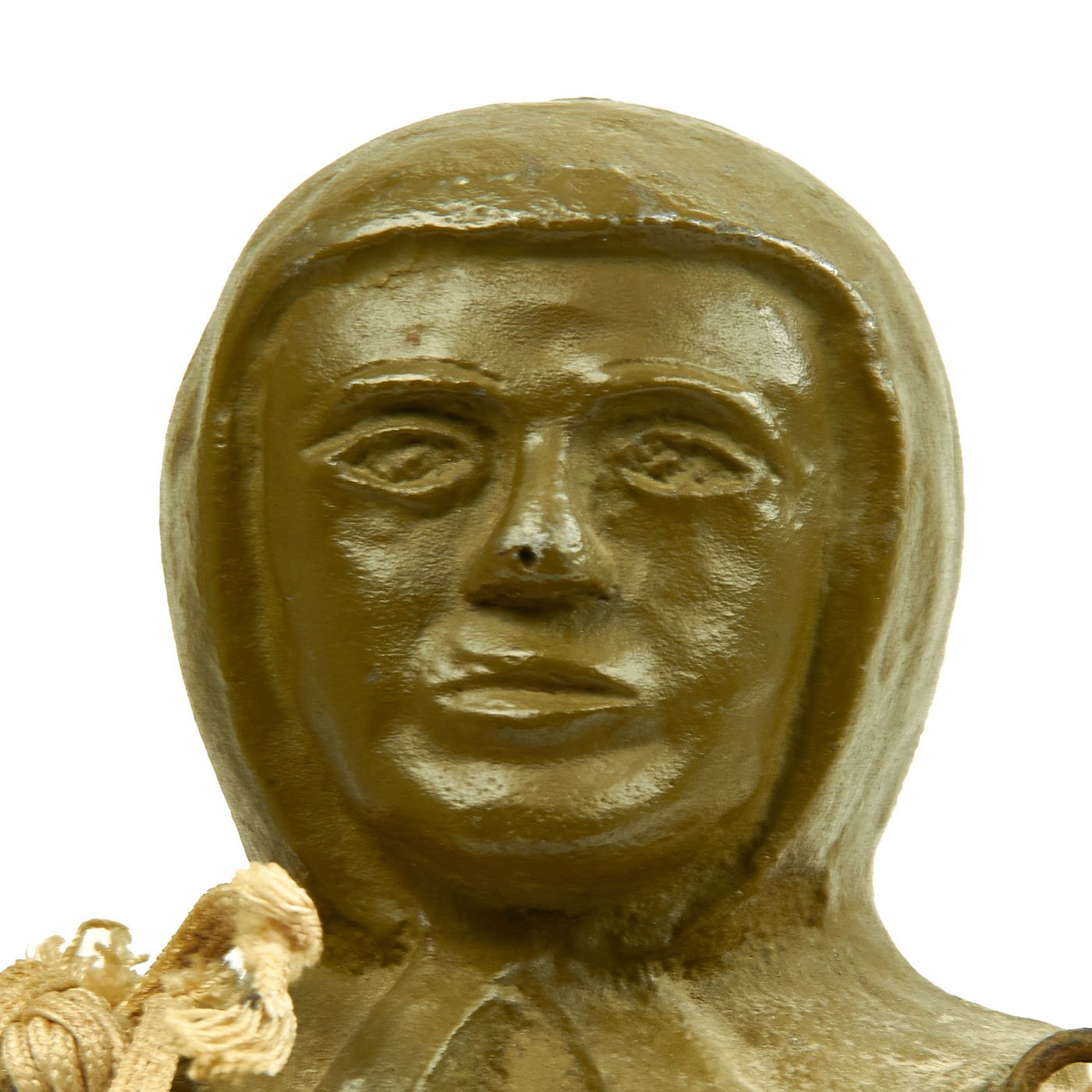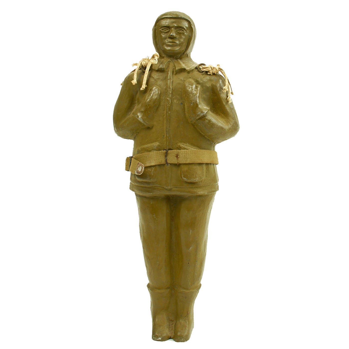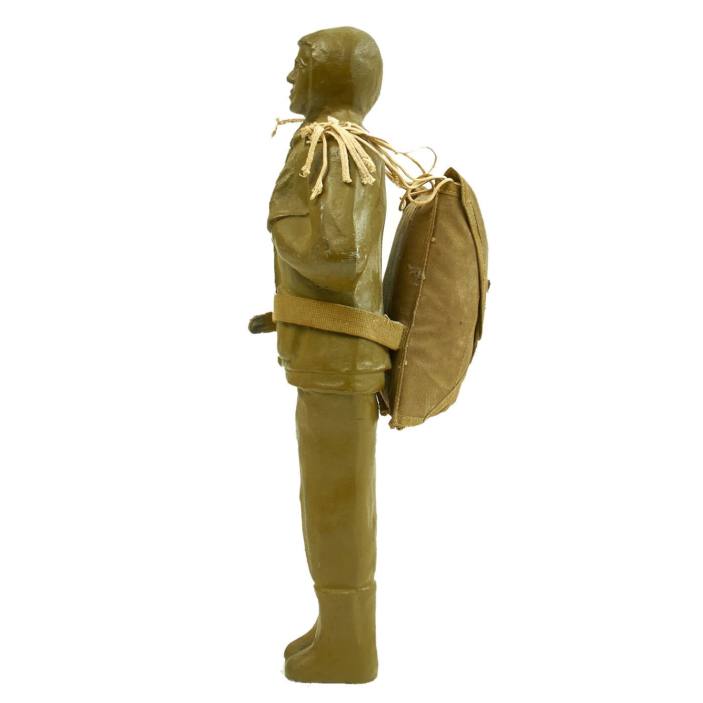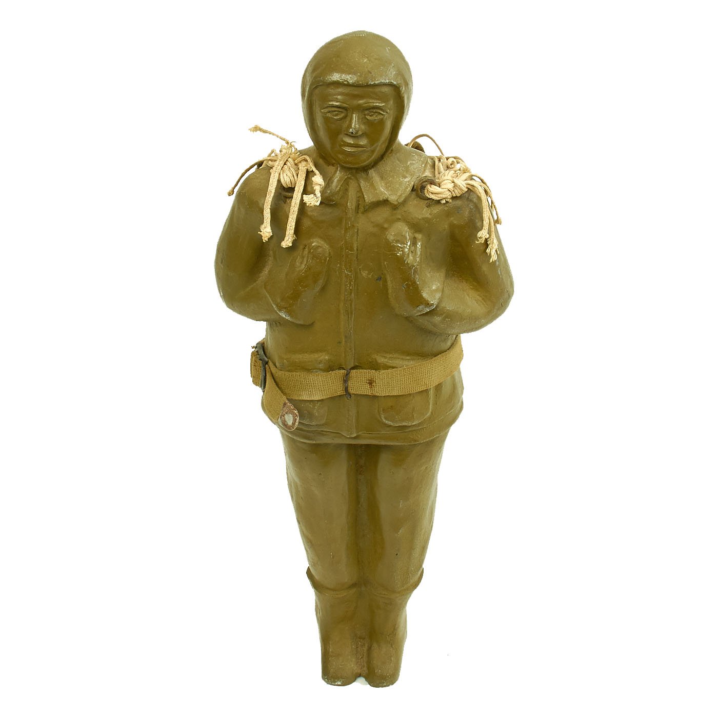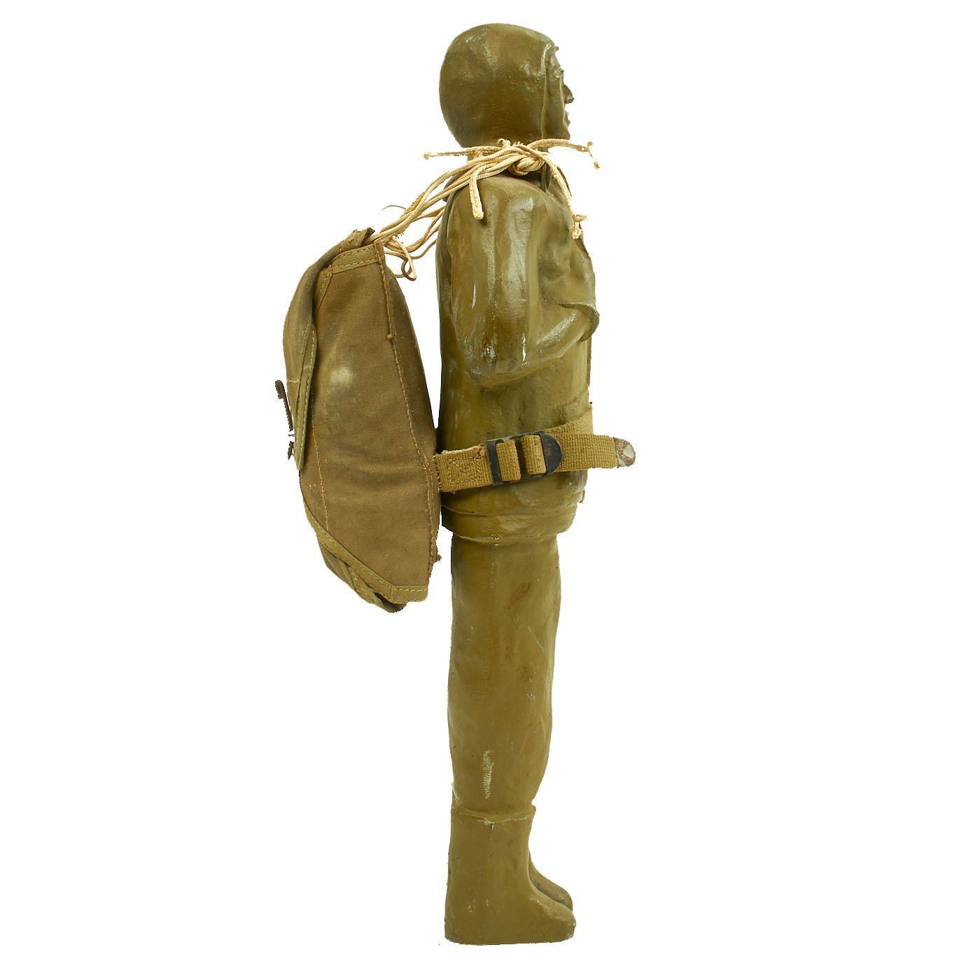 This example stands approximately 18 1/4" tall and measures about 7 1/4" wide at the elbows. It's painted olive drab Army green (original paint) and is complete with harness, parachute and belt. It is offered in excellent condition.