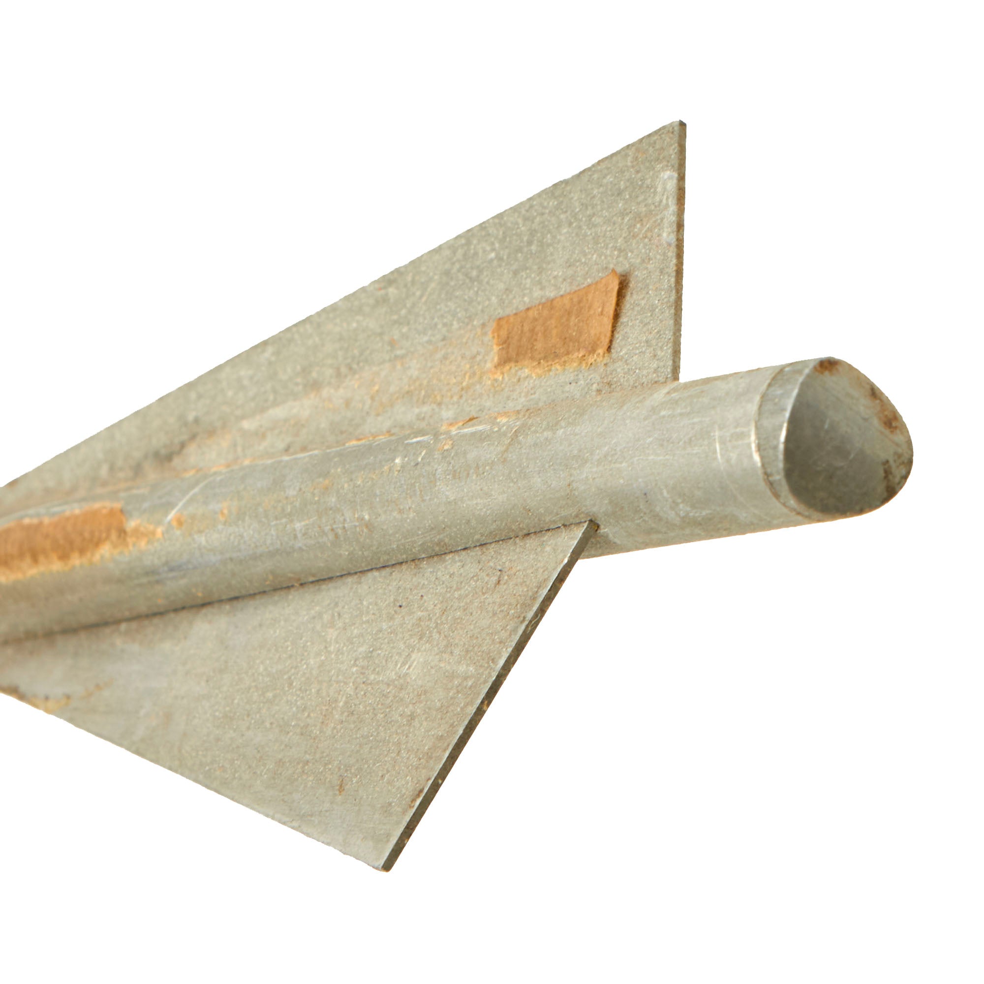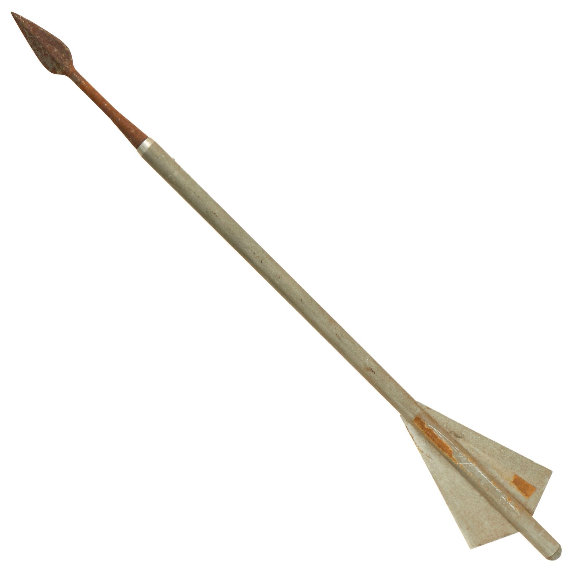 The arrow is approximately 13⅞” long and is composed of a combination of aluminum and steel. The tip of the arrow is made of steel and is heavily oxidized as shown. 4-ST can be read in red on one of the wings.