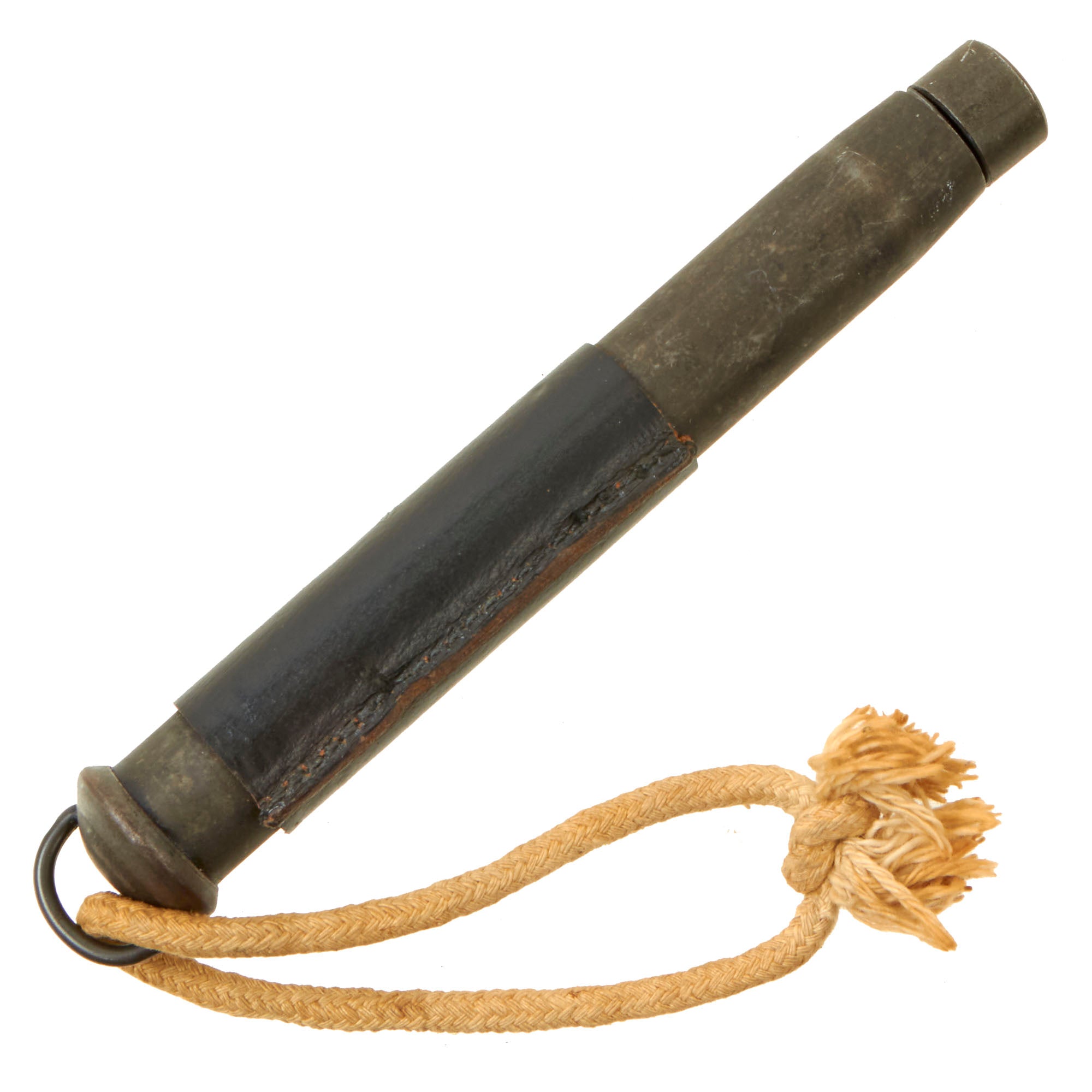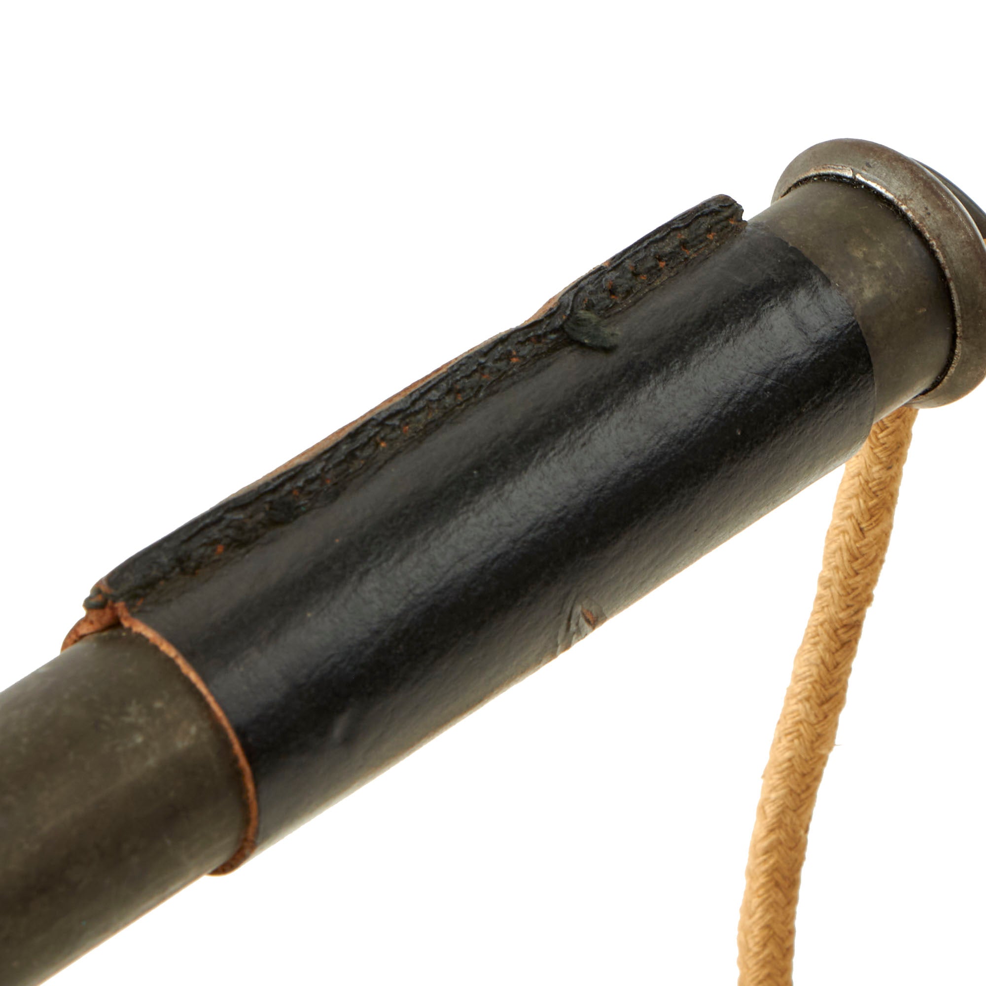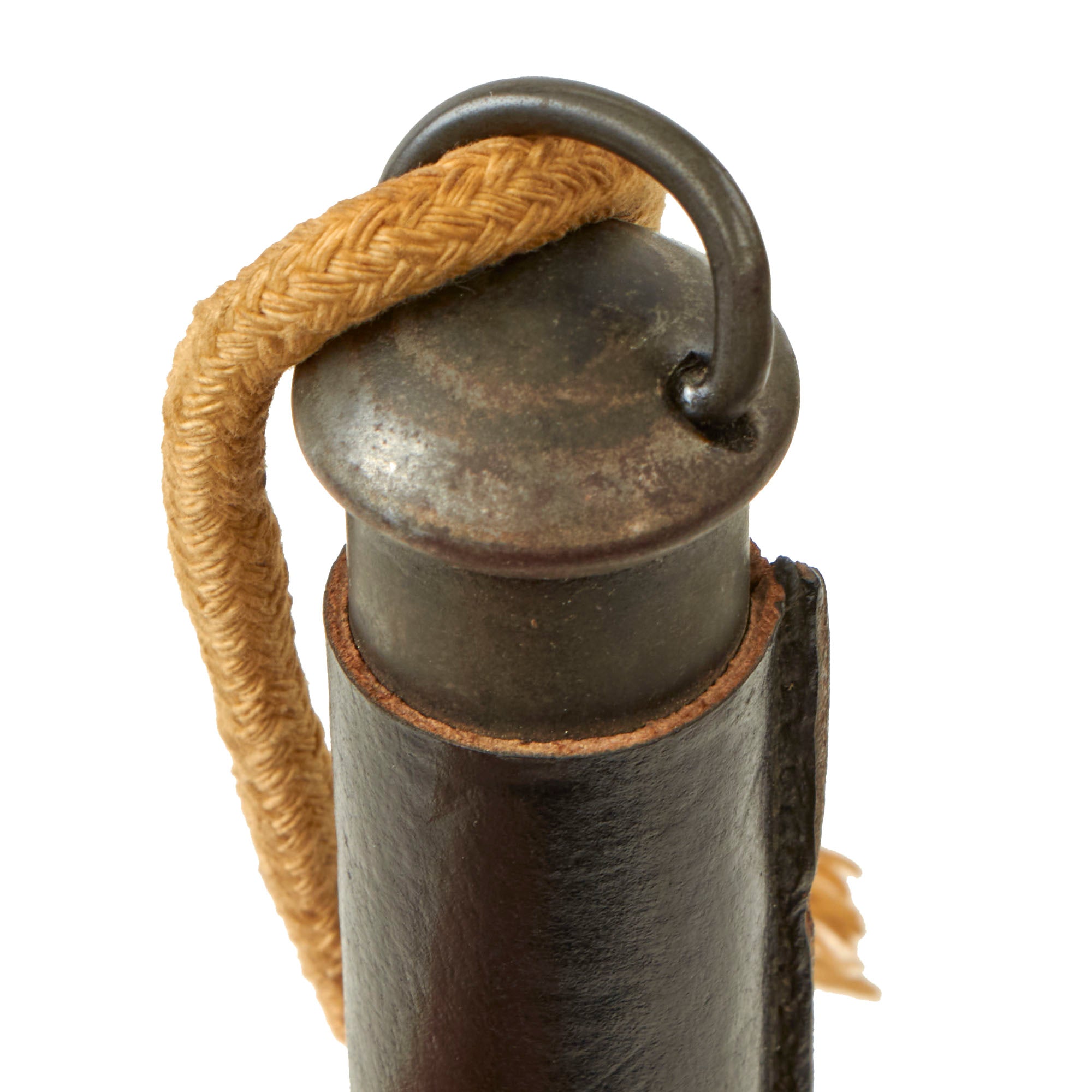 The spring cosh is constructed of two heavy concentric springs enclosed in a tubular steel handle with a sewn leather grip and a ring at the skull crusher pommel for the carrying rope. At the end of the smaller spring is a heavy metal knob which is the main striking element. When closed the cosh is 7½” in length with a length of 16 ½” when extended. We are unsure if the rope is original to the cosh or was added, but it appears period.