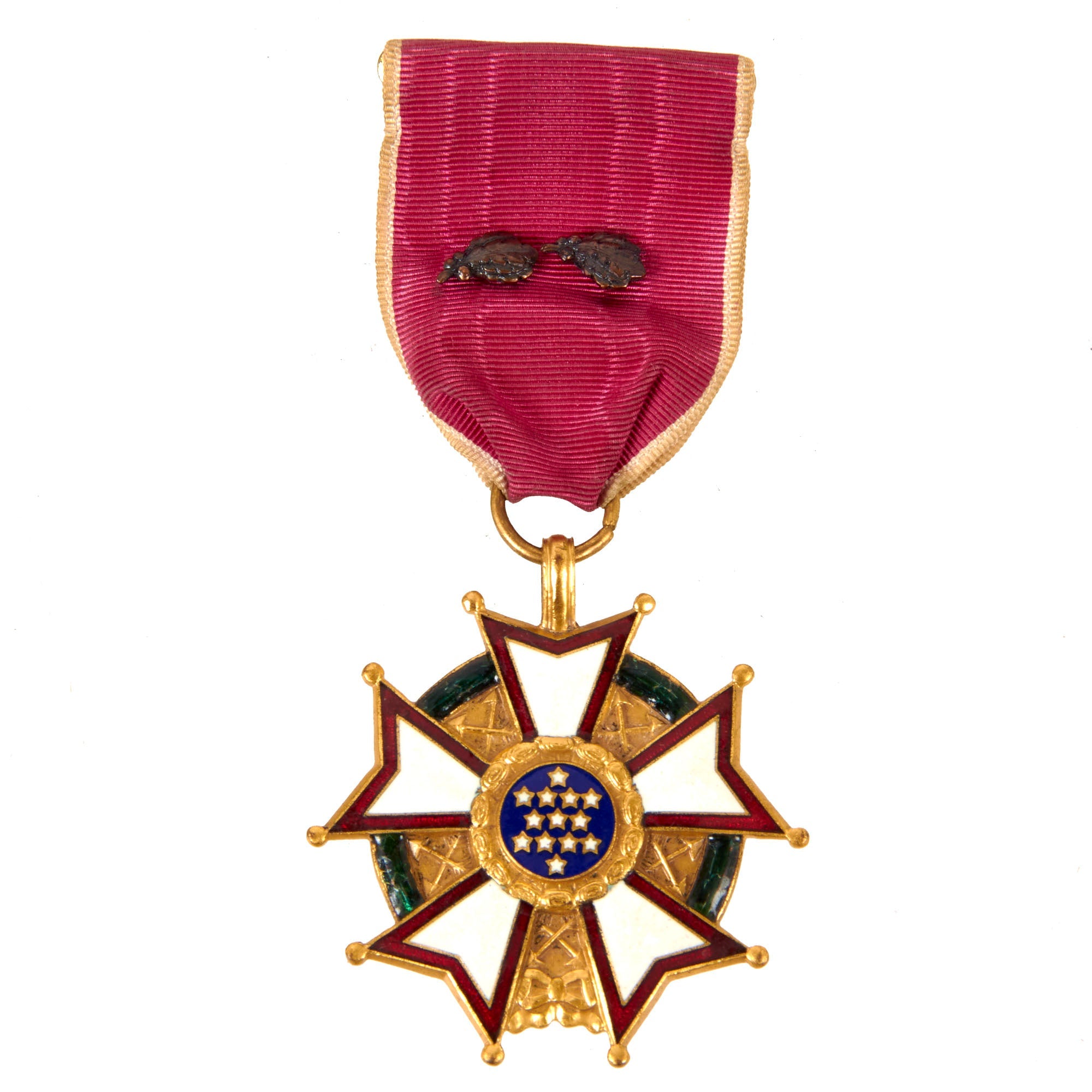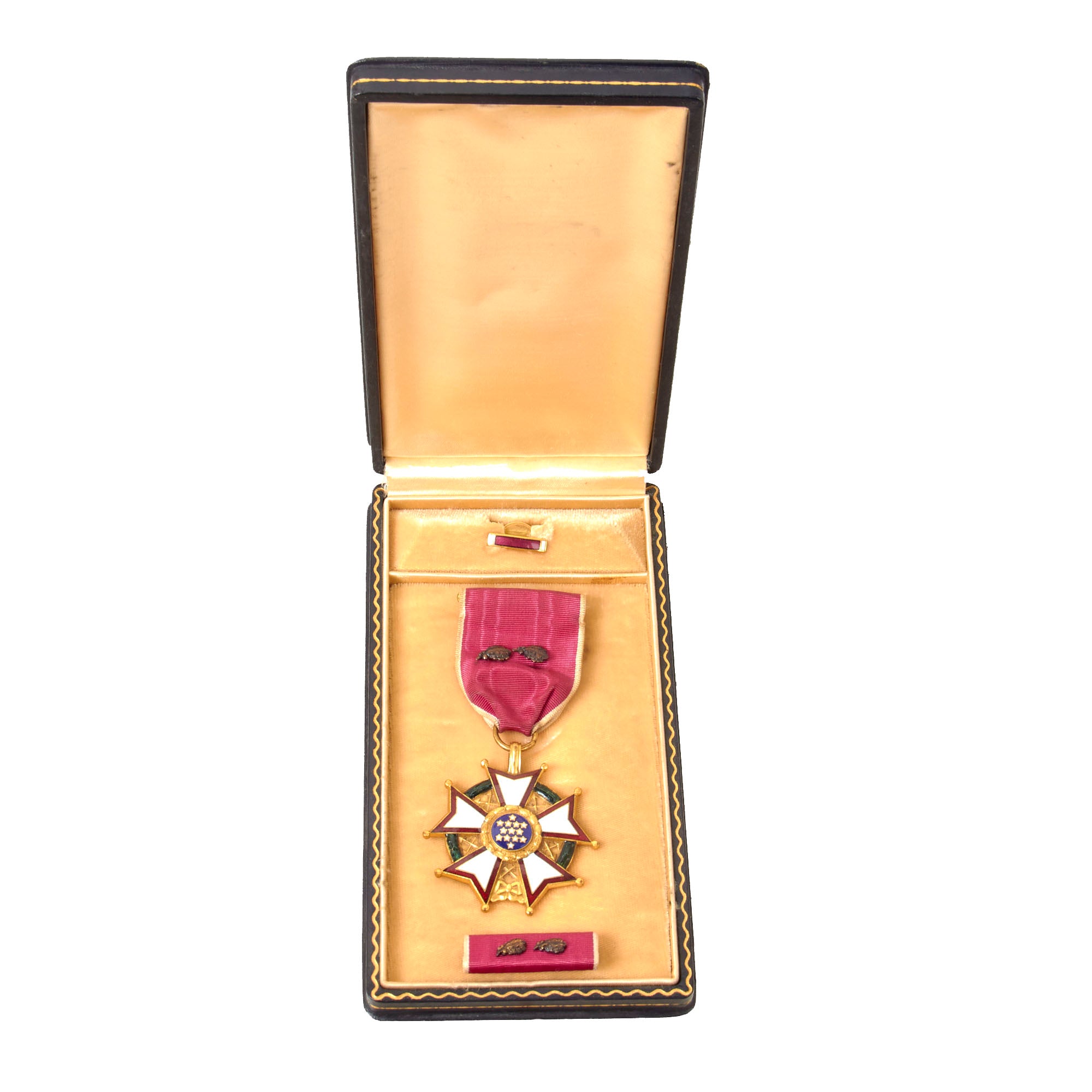 - Born’s officially engraved Legion of Merit with Two Oak leaf clusters in the original presentation case with the ribbon and pin. An outstanding example.