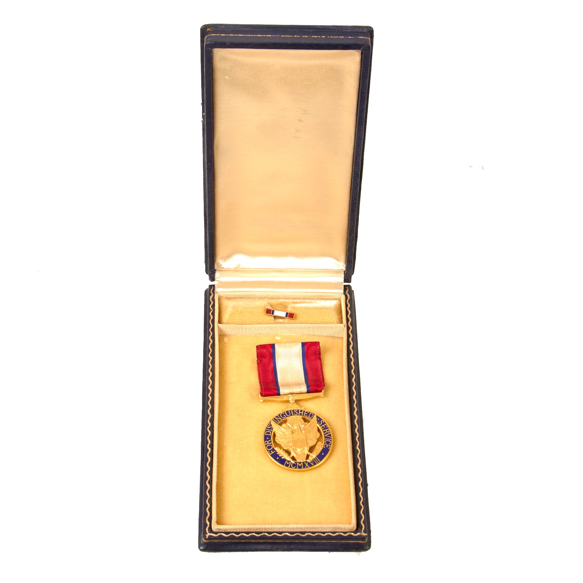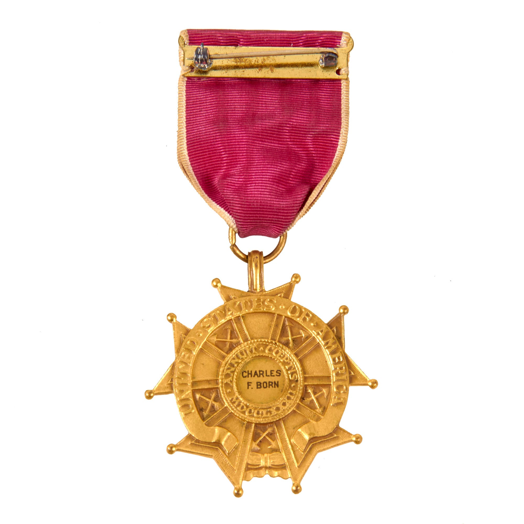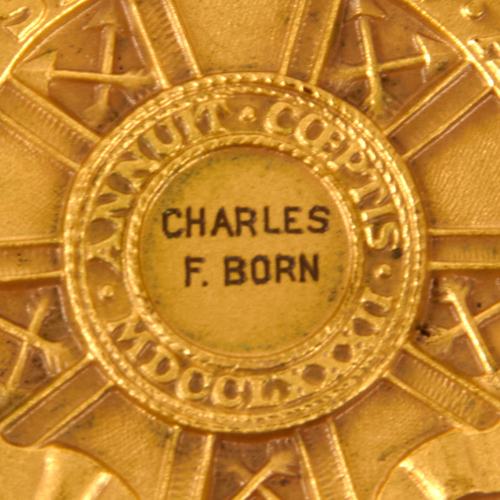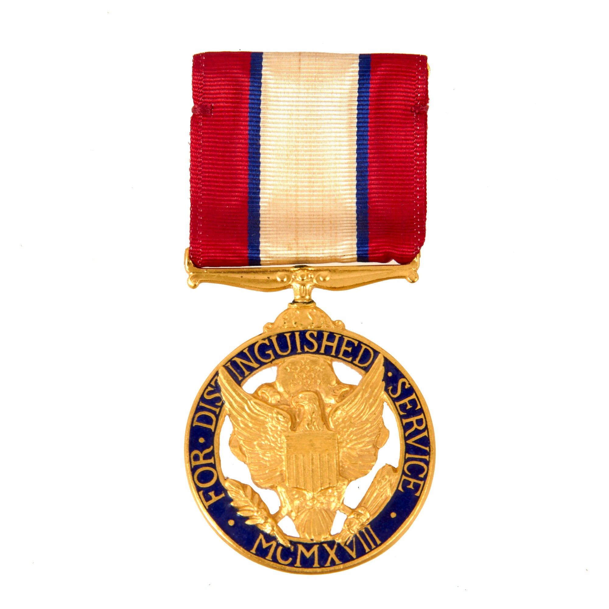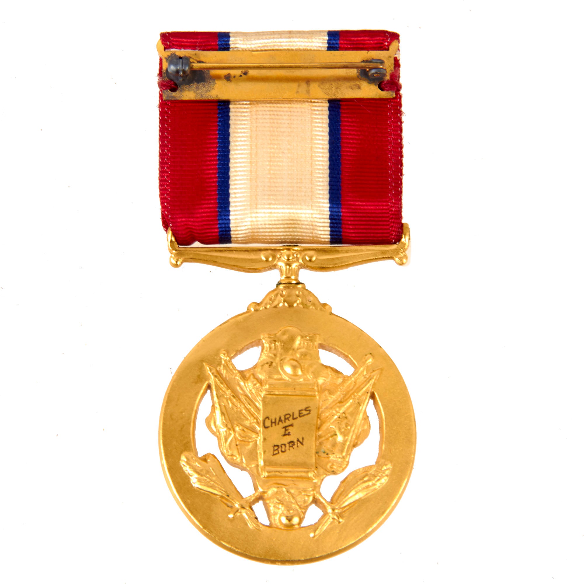 - Born’s officially engraved Distinguished Service Medal in the original presentation case with the ribbon, spare length of ribbon for the brooch, and pin. The medal is rim-numbered 8665. This is an unprecedented medal to find hand-engraved.