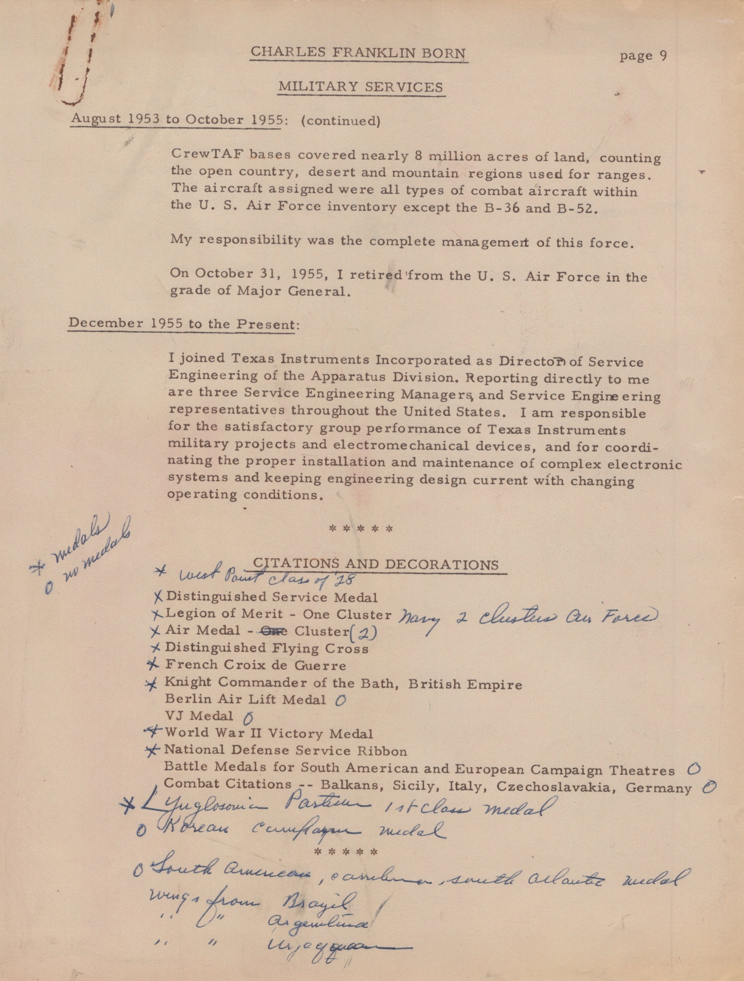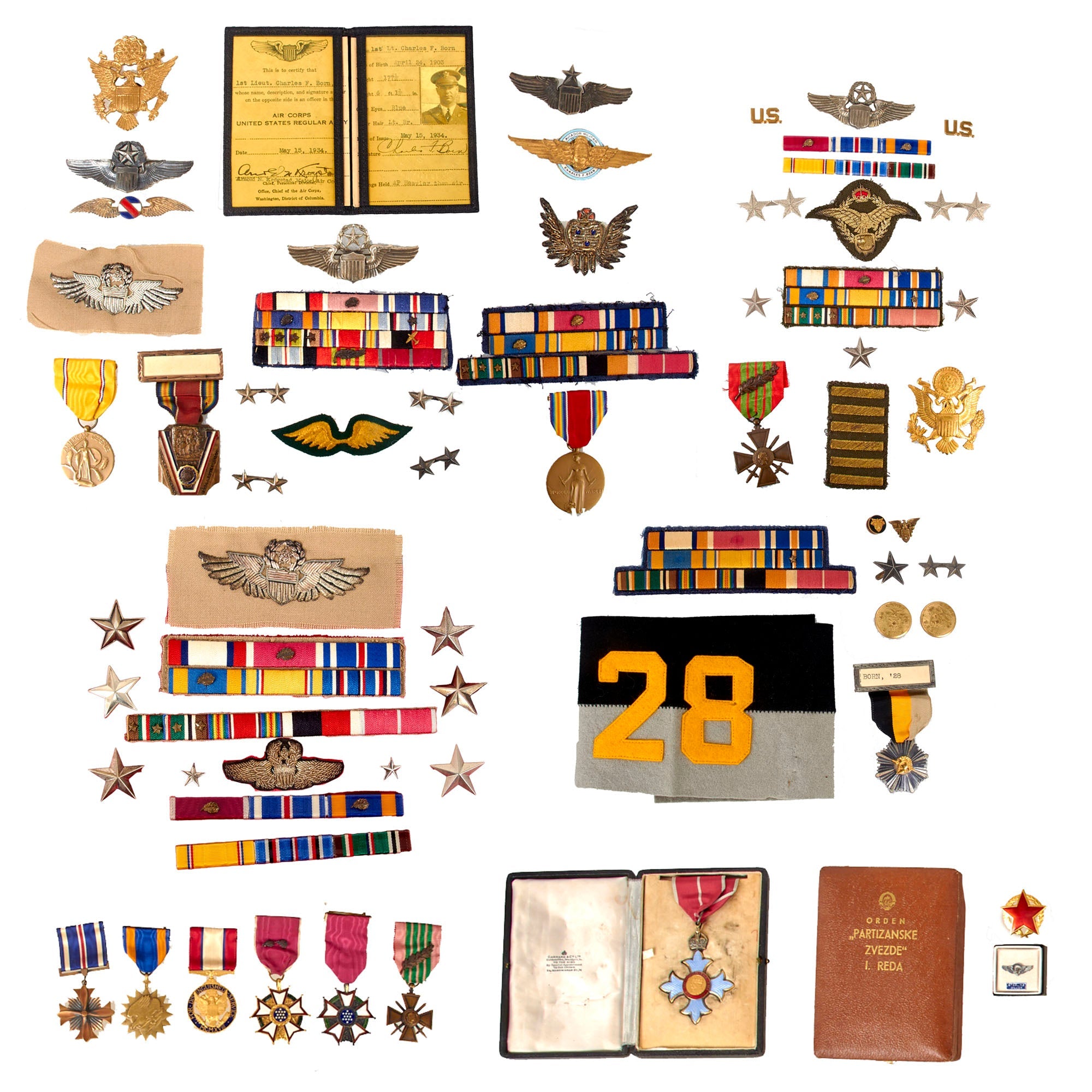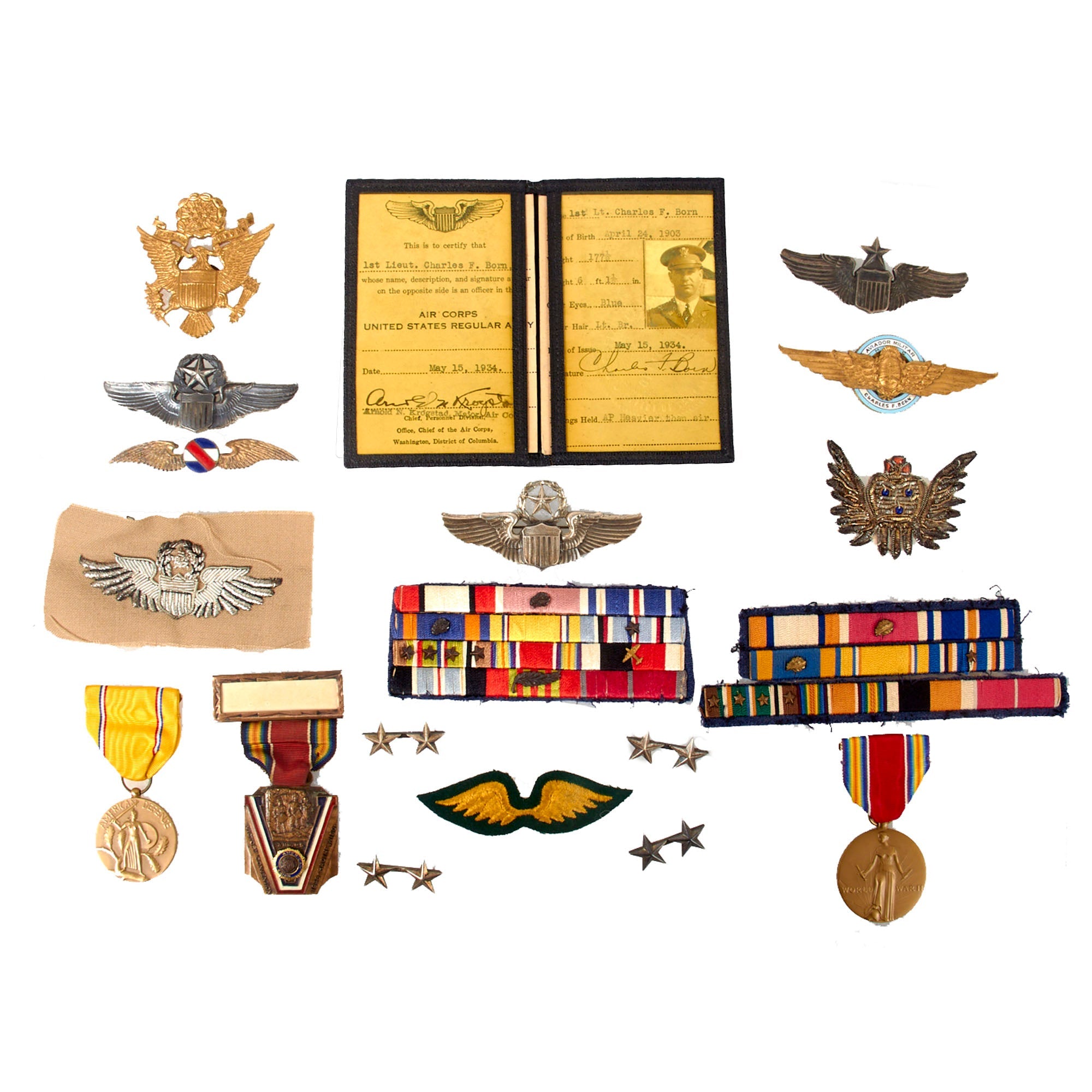 Original Items. One-of-a-Kind Group. This is the unprecedented medal and ephemera group of Major General Charles Franklin Born, who served roughly 30 years in the U.S. Army and later the U.S. Air Force. Graduating from West Point in 1928, Born served with multiple units in the pre-war period, and went on to hold multiple commands during World War II, including the 5th Bomb Squadron, 9th Bomb Group. He later served as Operations Officer and Deputy Commander of the entire 15th Air Force in Europe from 1943-1945. He was instrumental in the creation of the Air Force after the war, and was commander of CrewTAF from its inception until his retirement in 1955. The group consists of his medals, including his officially engraved DSM and LM, his foreign awards, a great deal of insignia and theater-made ribbon bars, and some phenomenal ephemera.