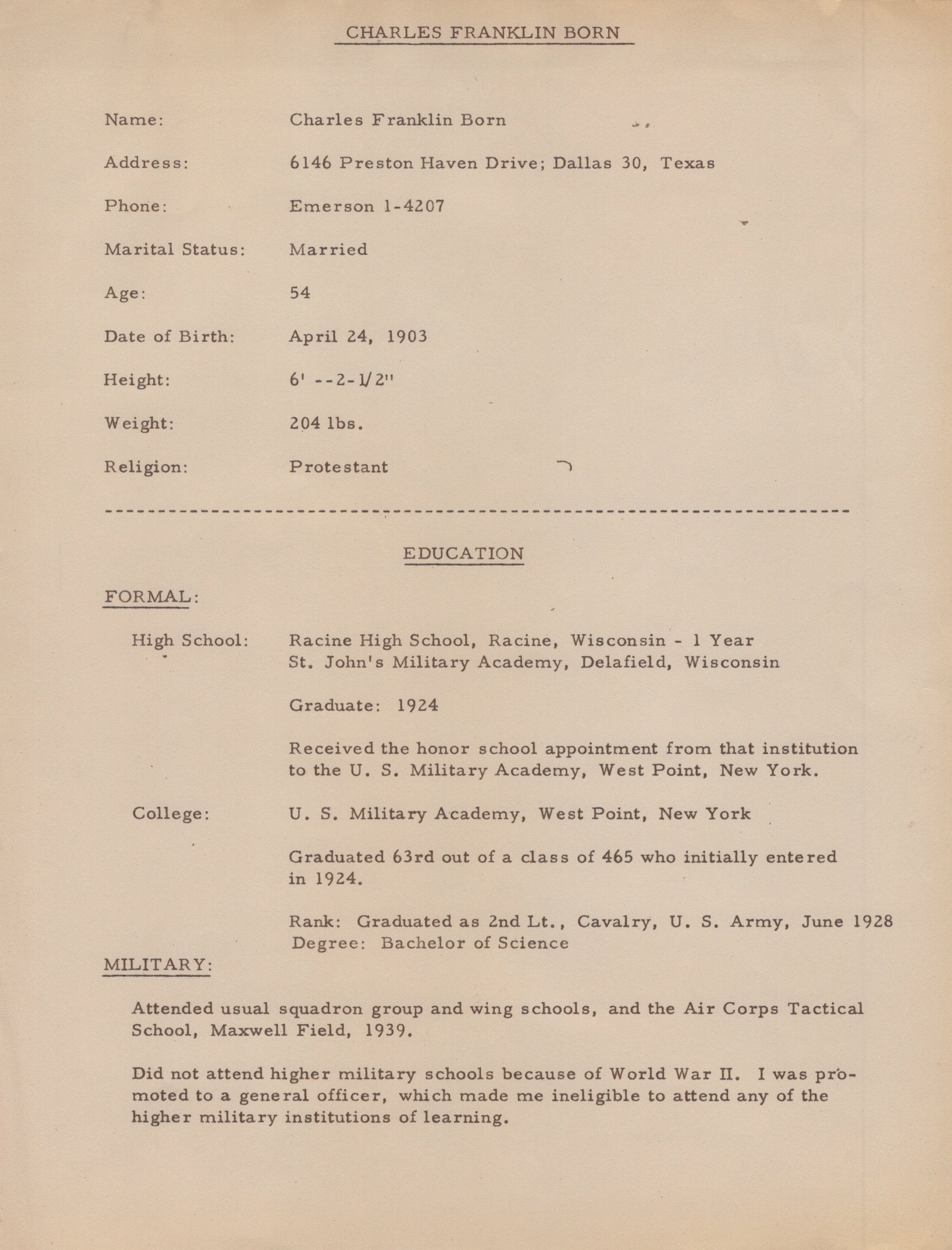 The President of the United States of America, authorized by Act of Congress July 9, 1918, takes pleasure in presenting the Army Distinguished Service Medal to Brigadier General Charles Franklin Born (ASN: 0-17143), United States Army Air Forces, for exceptionally meritorious and distinguished services to the Government of the United States, in a duty of great responsibility as Assistant Chief of Staff for Operations and Training (A-3), and Deputy Commanding General, FIFTEENTH Air Force, from 1 November 1943 to 7 March 1945. The singularly distinctive accomplishments of General Born and his dedicated contributions in the service of his country reflect the highest credit upon himself and the United States Army Air Forces.